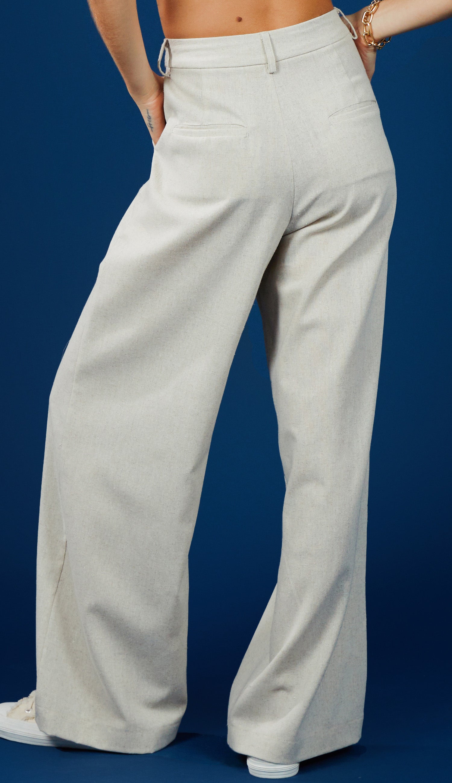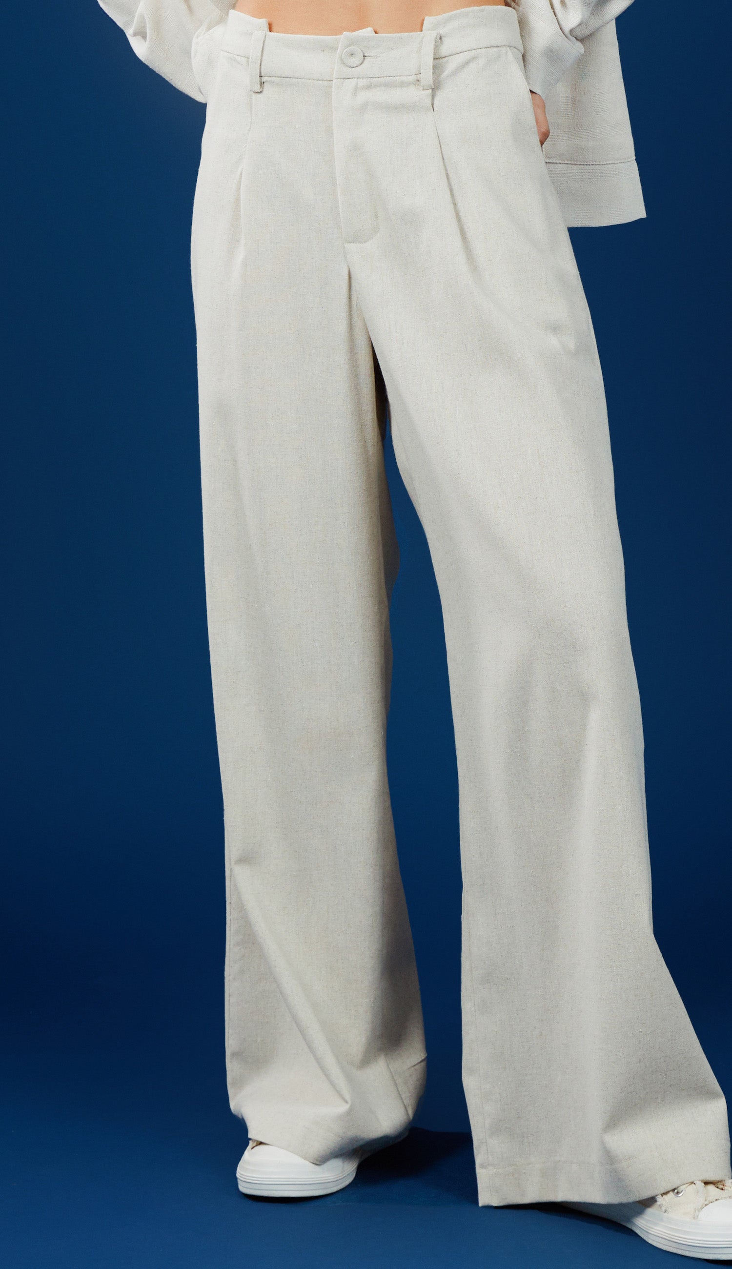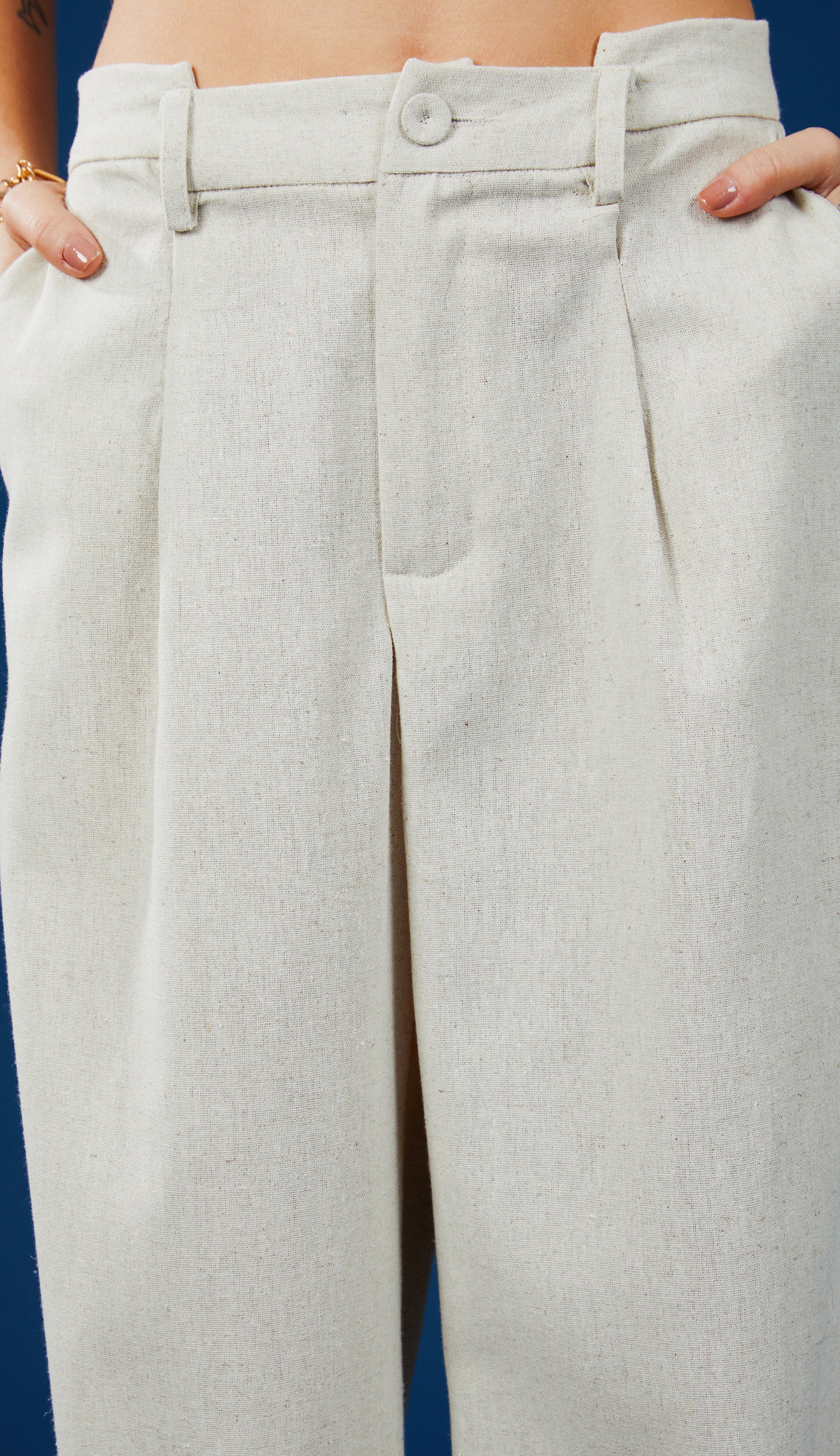 Calça wide leg confeccionada em linho. Possui cós assimétrico com passantes, pregas frontais, bolsos traseiros e fechamento frontal por zíper e botão forrado. Uma peça elegante e confortável para criar vários looks versáteis.