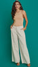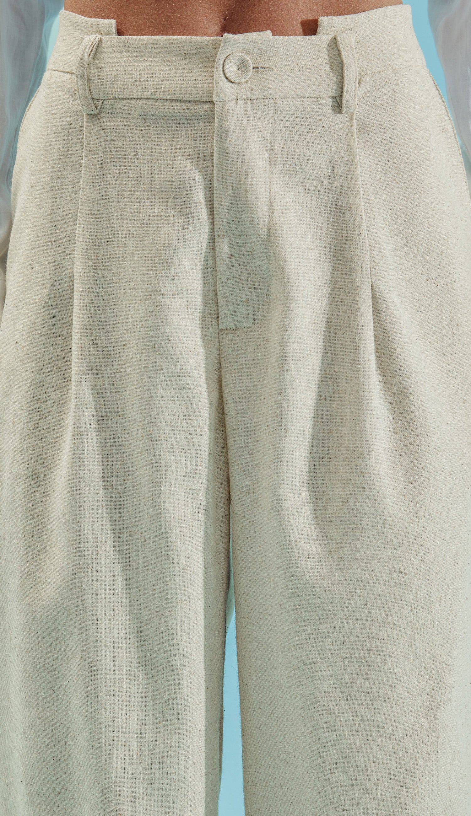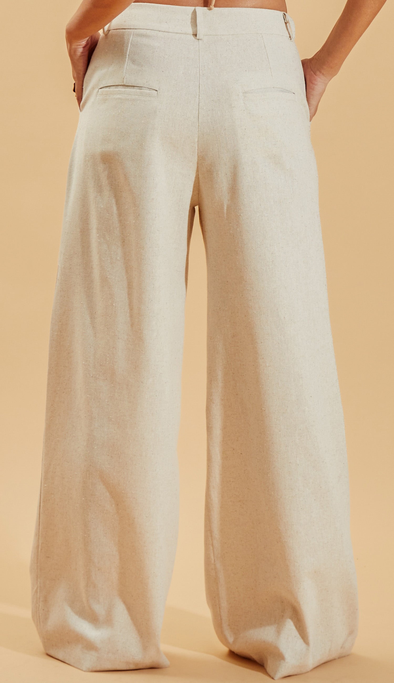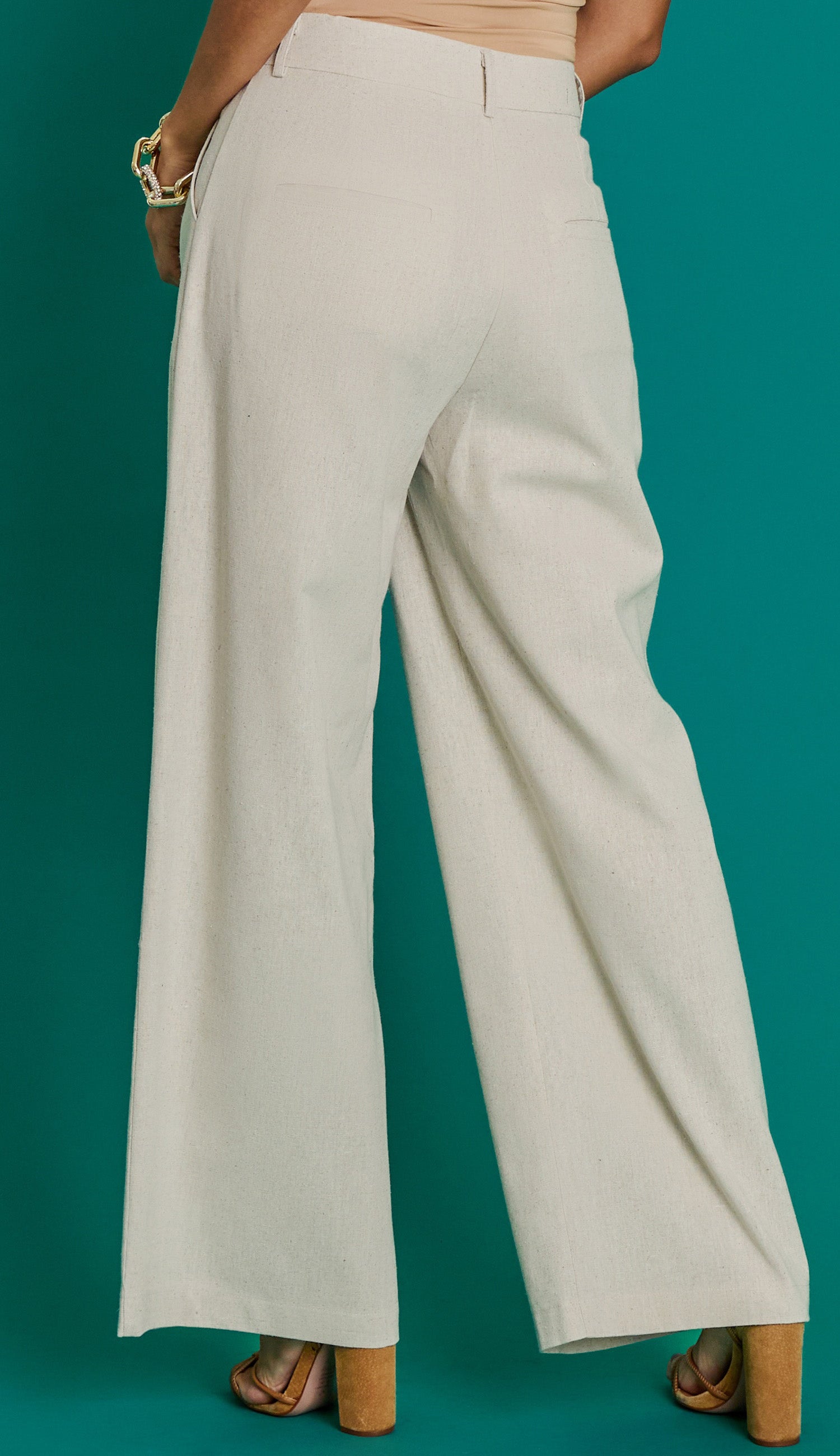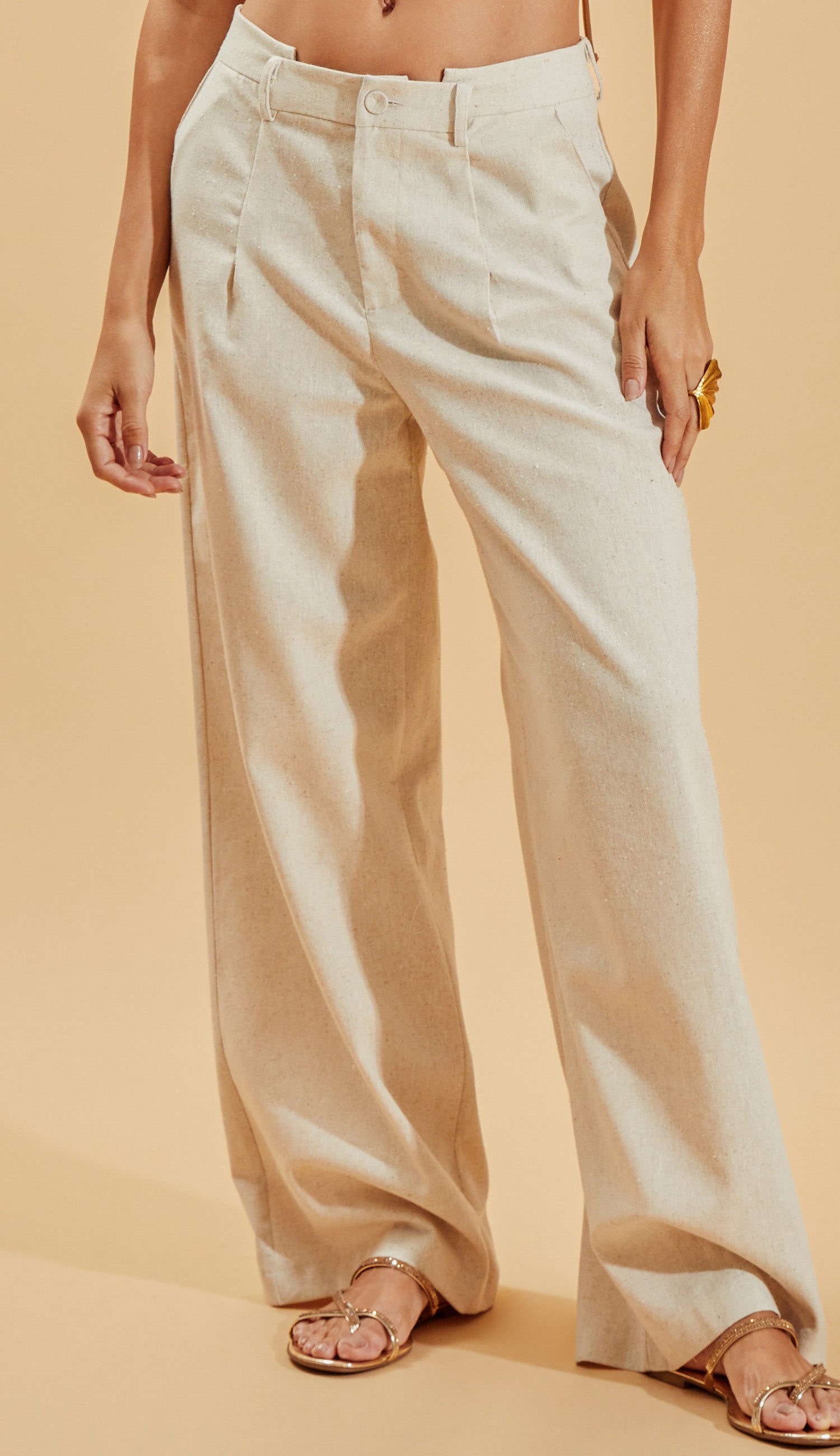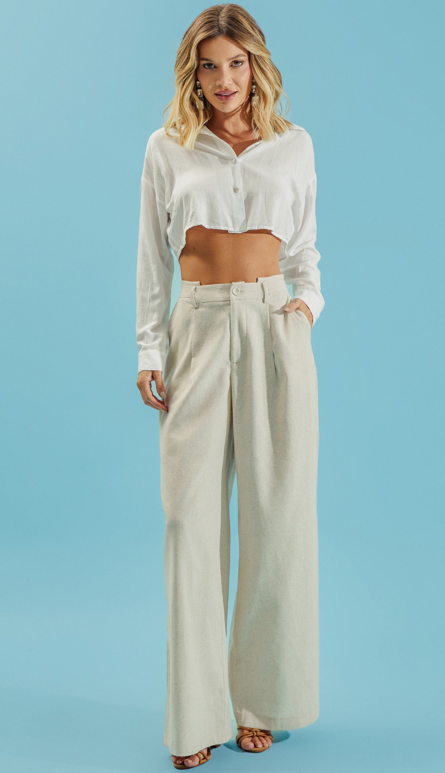 Calça wide leg confeccionada em linho. Possui cós assimétrico com passantes, pregas frontais, bolsos traseiros e fechamento frontal por zíper e botão forrado. Uma peça elegante e confortável para criar vários looks versáteis.