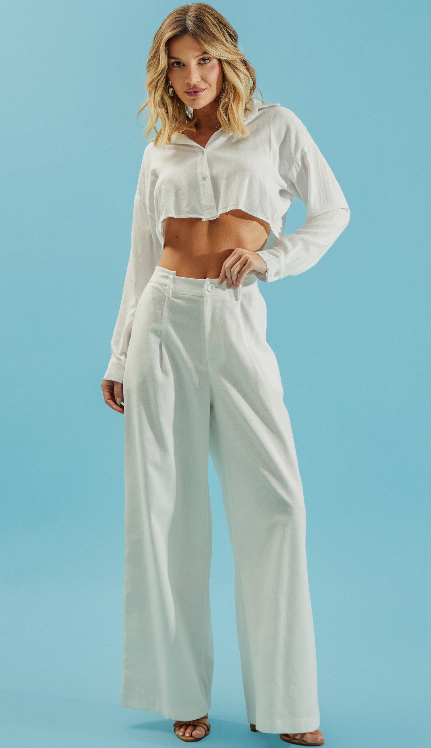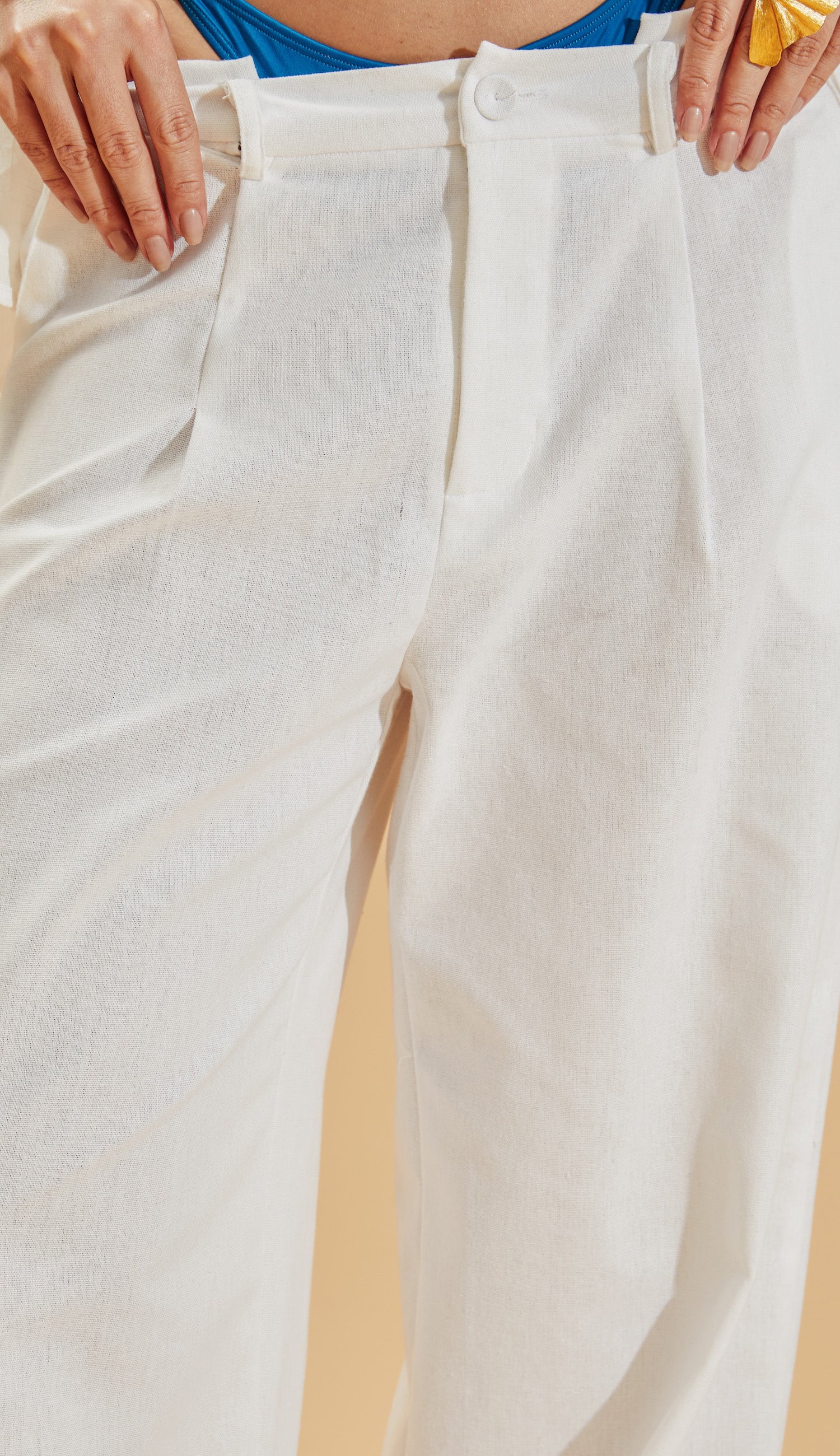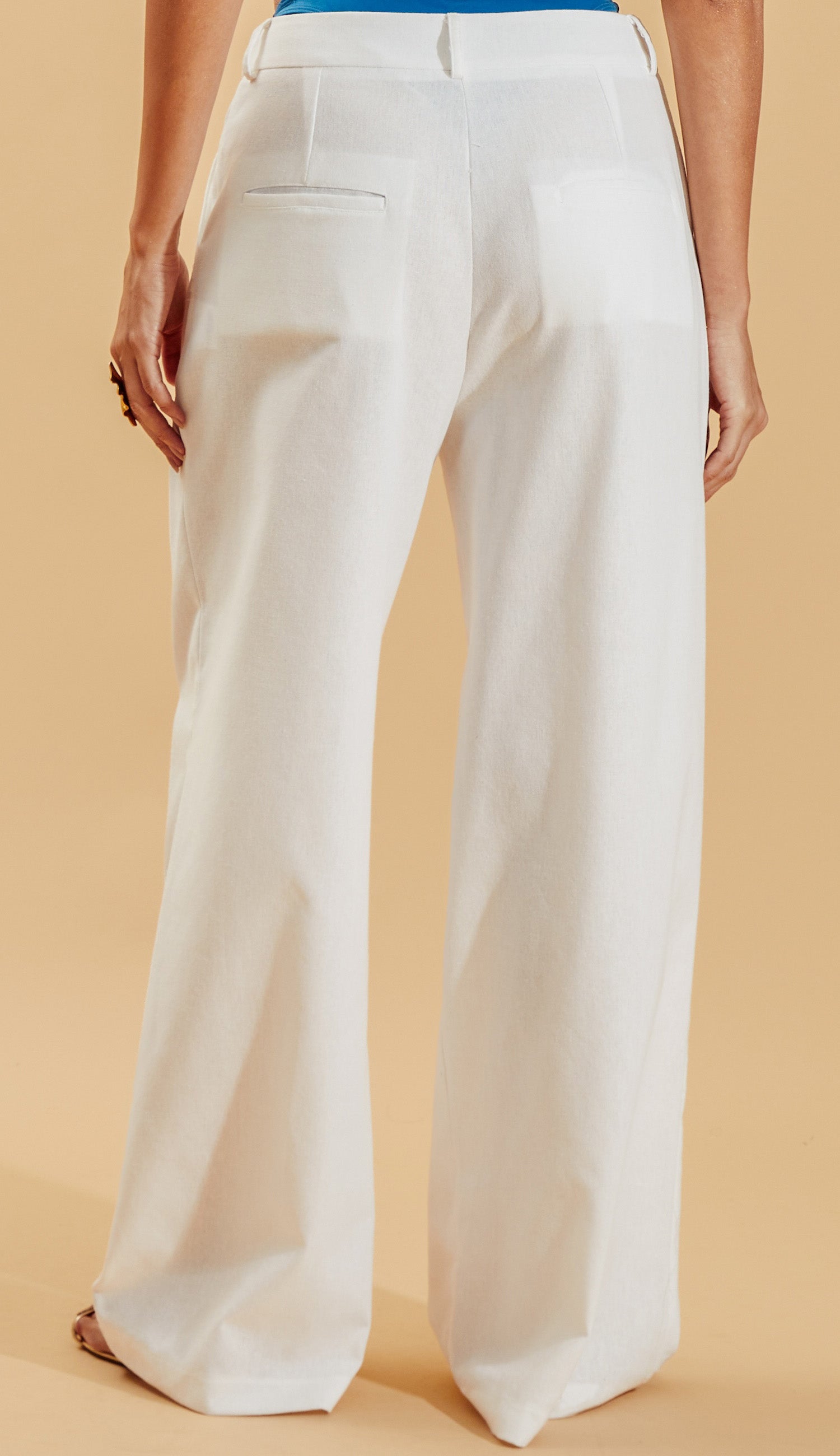 Calça wide leg confeccionada em linho. Possui cós assimétrico com passantes, pregas frontais, bolsos traseiros e fechamento frontal por zíper e botão forrado. Uma peça elegante e confortável para criar vários looks versáteis.