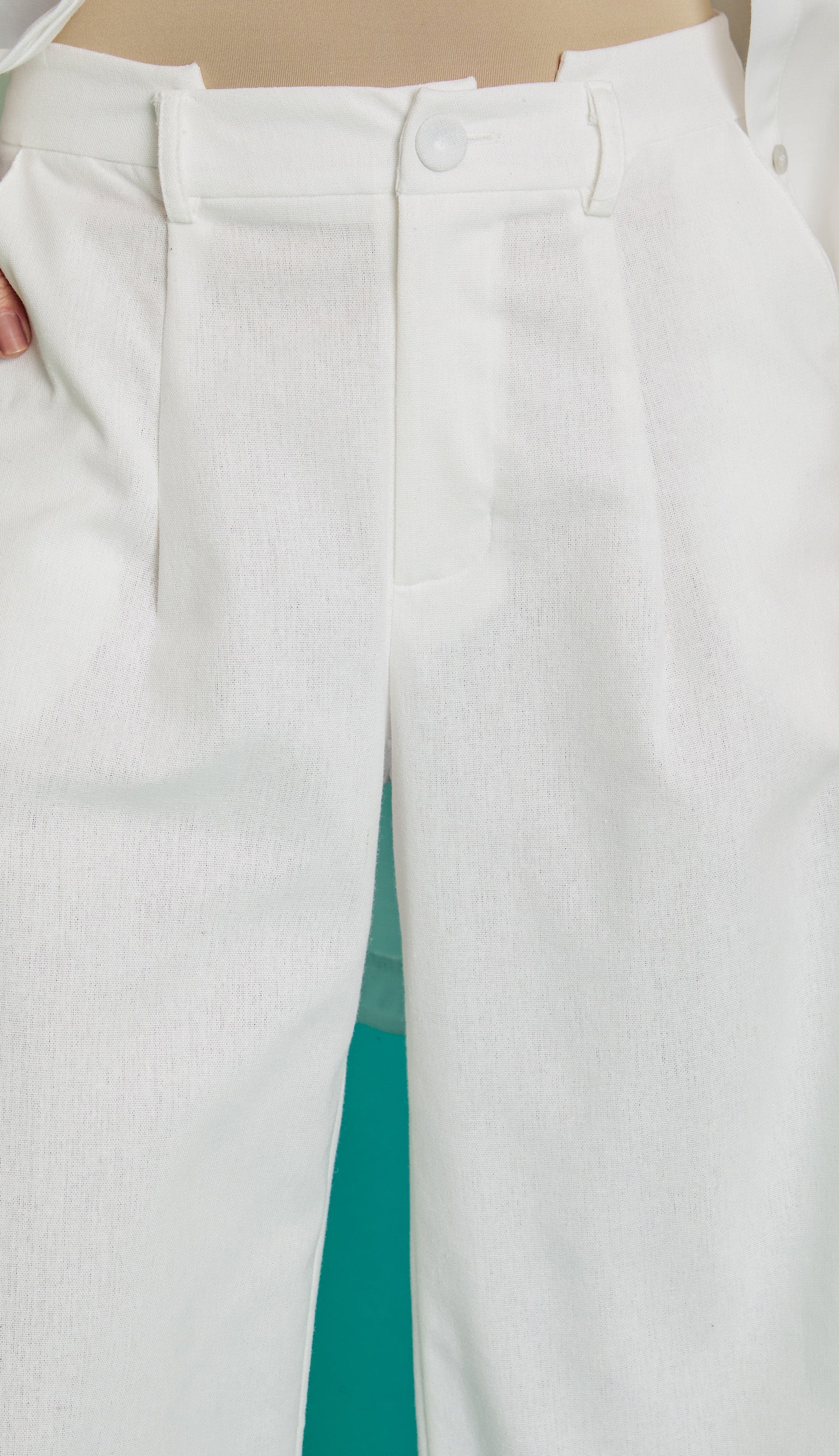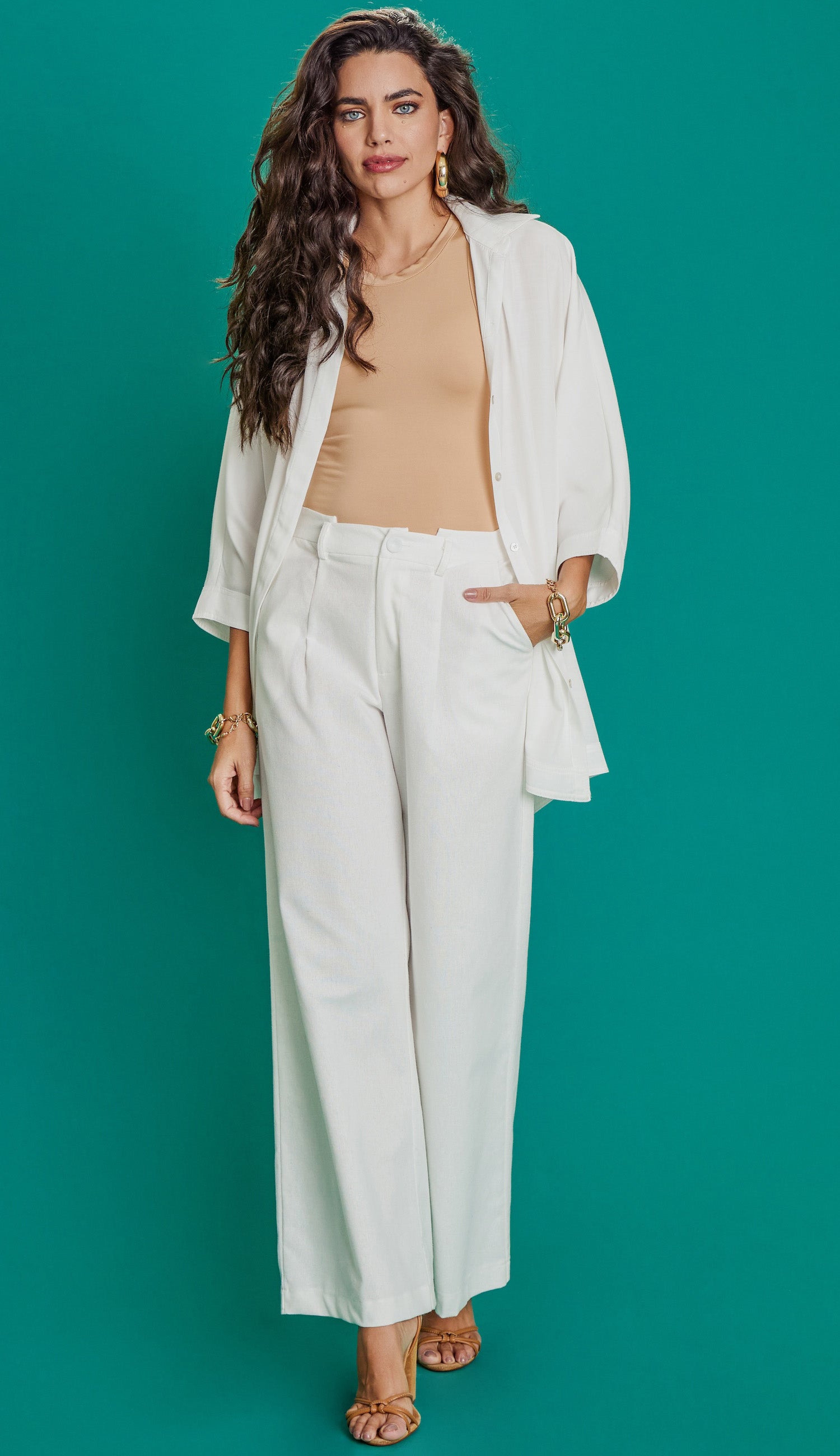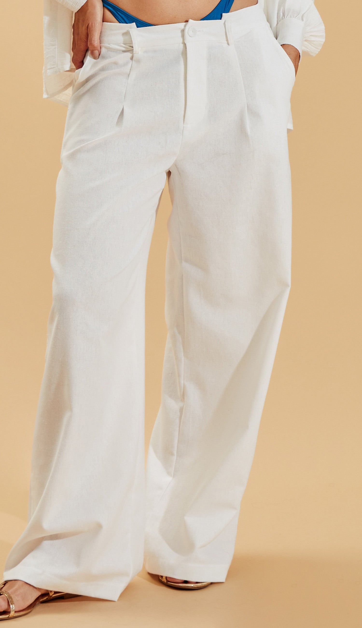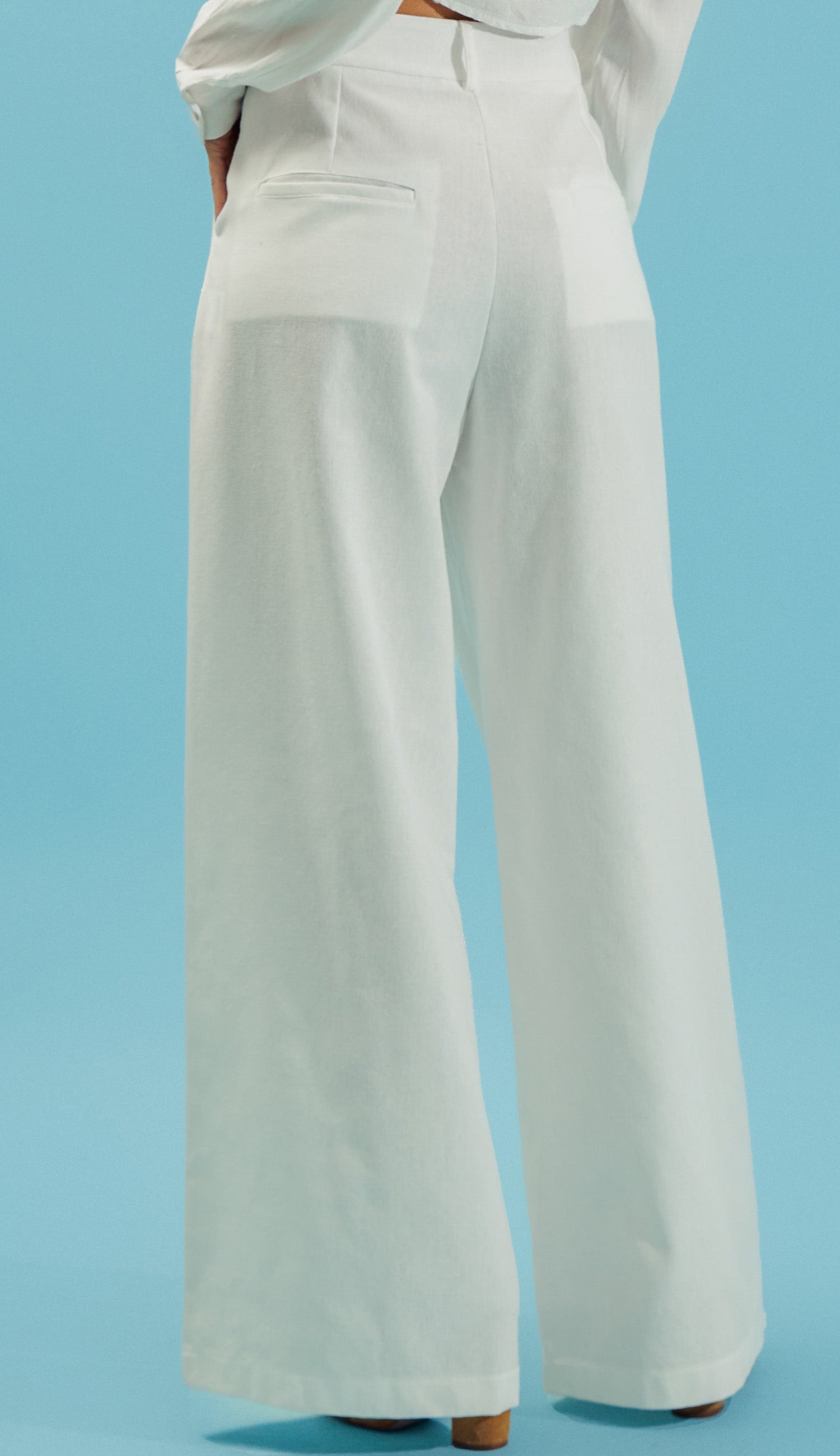 Calça wide leg confeccionada em linho. Possui cós assimétrico com passantes, pregas frontais, bolsos traseiros e fechamento frontal por zíper e botão forrado. Uma peça elegante e confortável para criar vários looks versáteis.