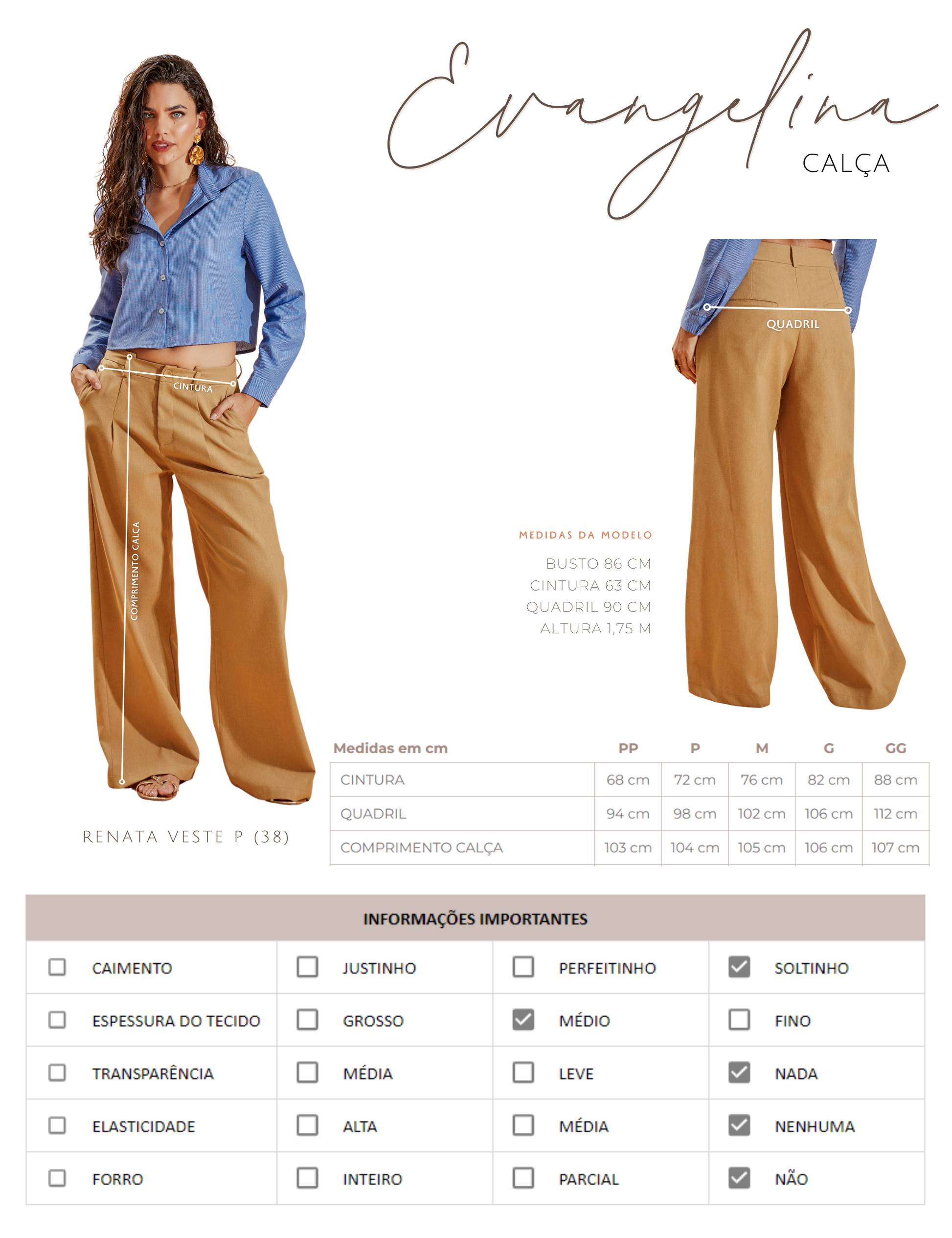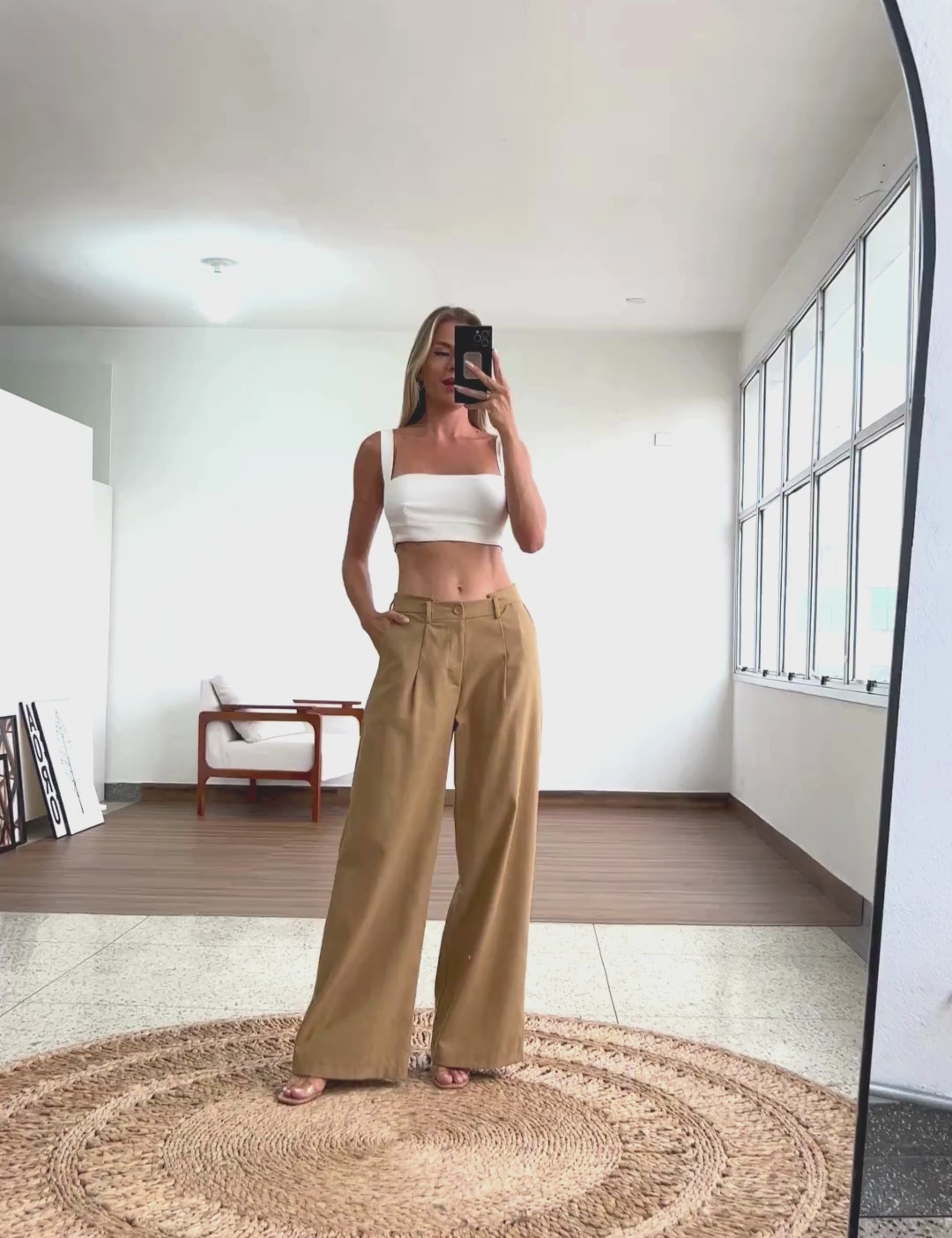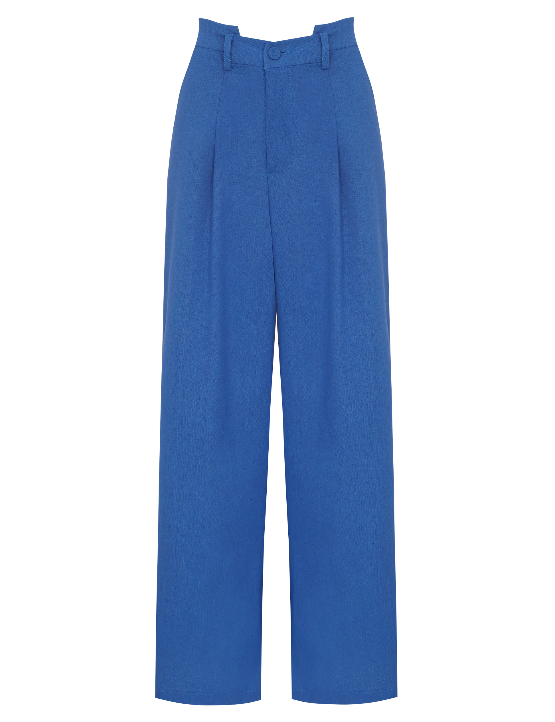 Calça wide leg confeccionada em linho. Possui cós assimétrico com passantes, pregas frontais, bolsos traseiros e fechamento frontal por zíper e botão forrado. Uma peça elegante e confortável para criar vários looks versáteis.
