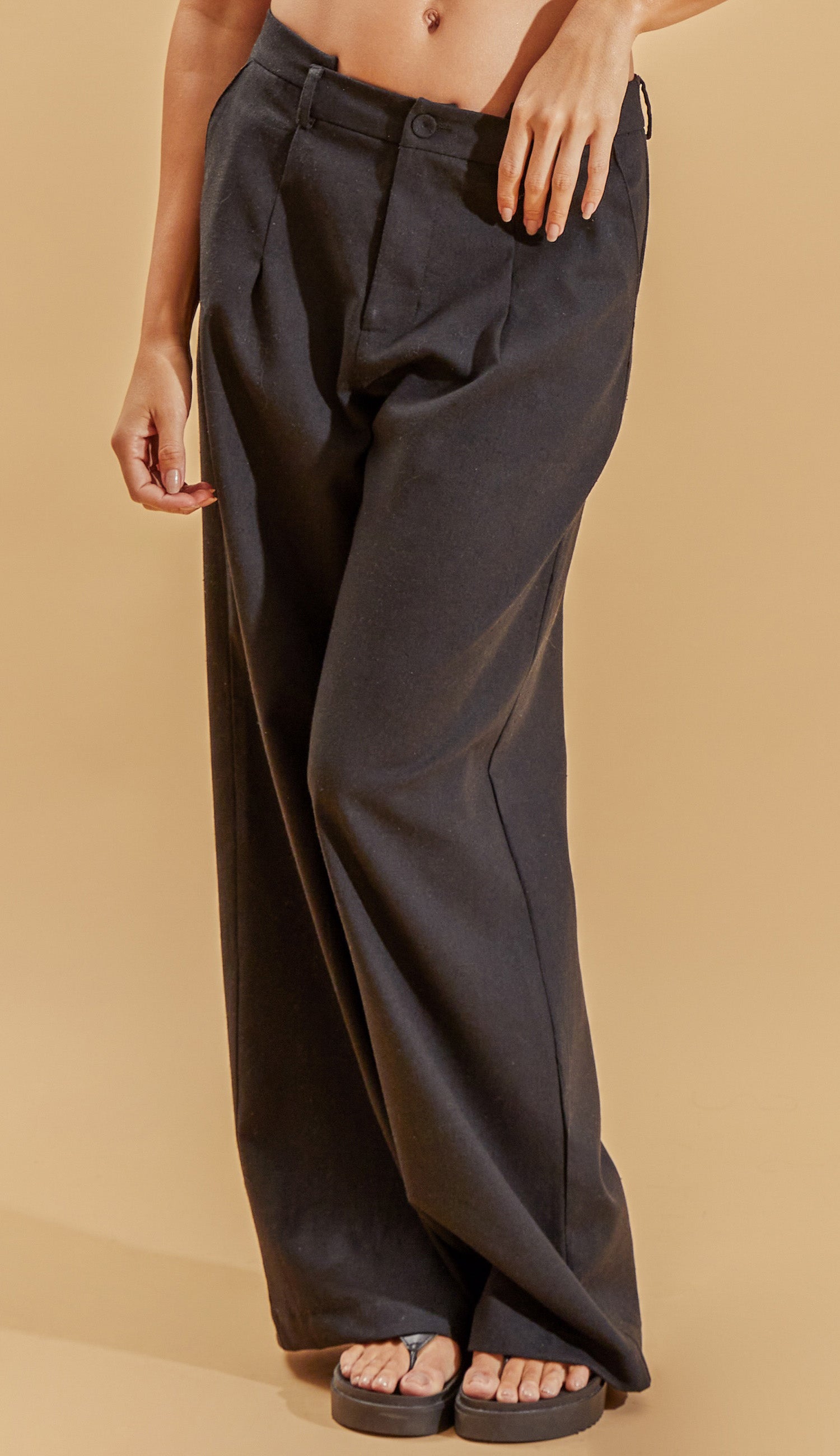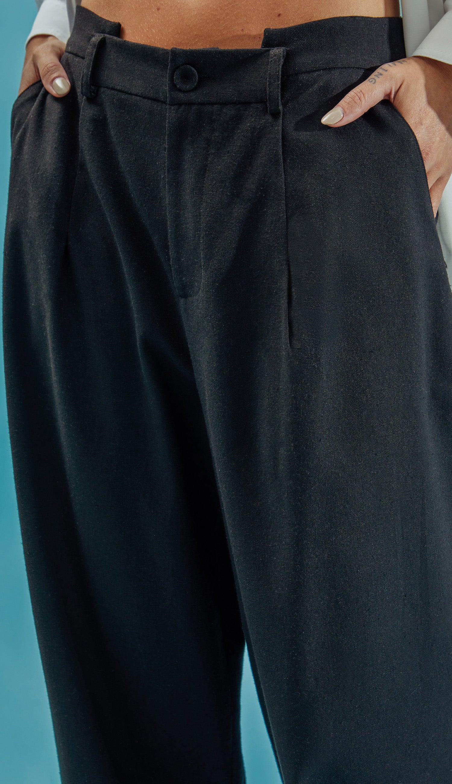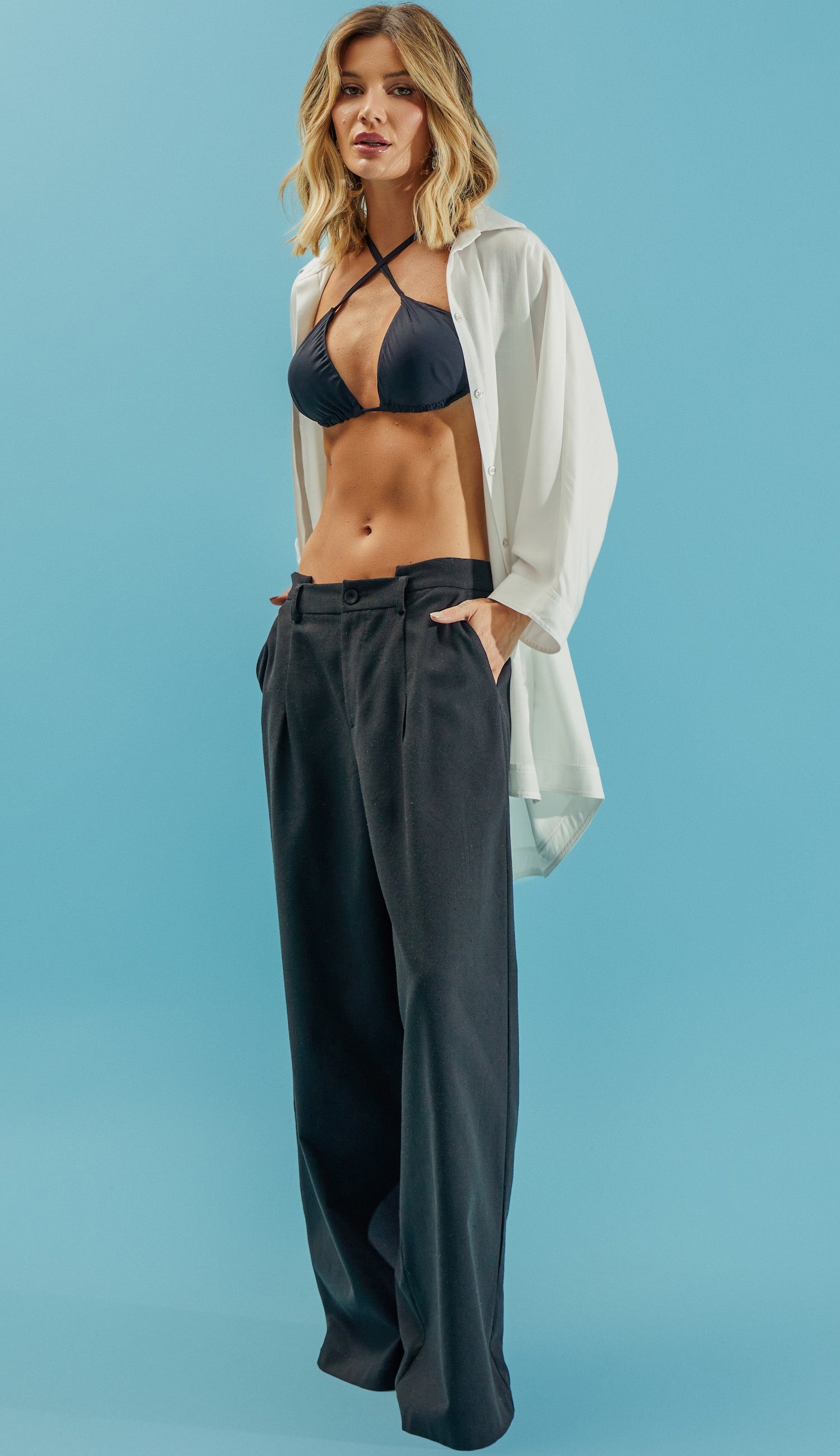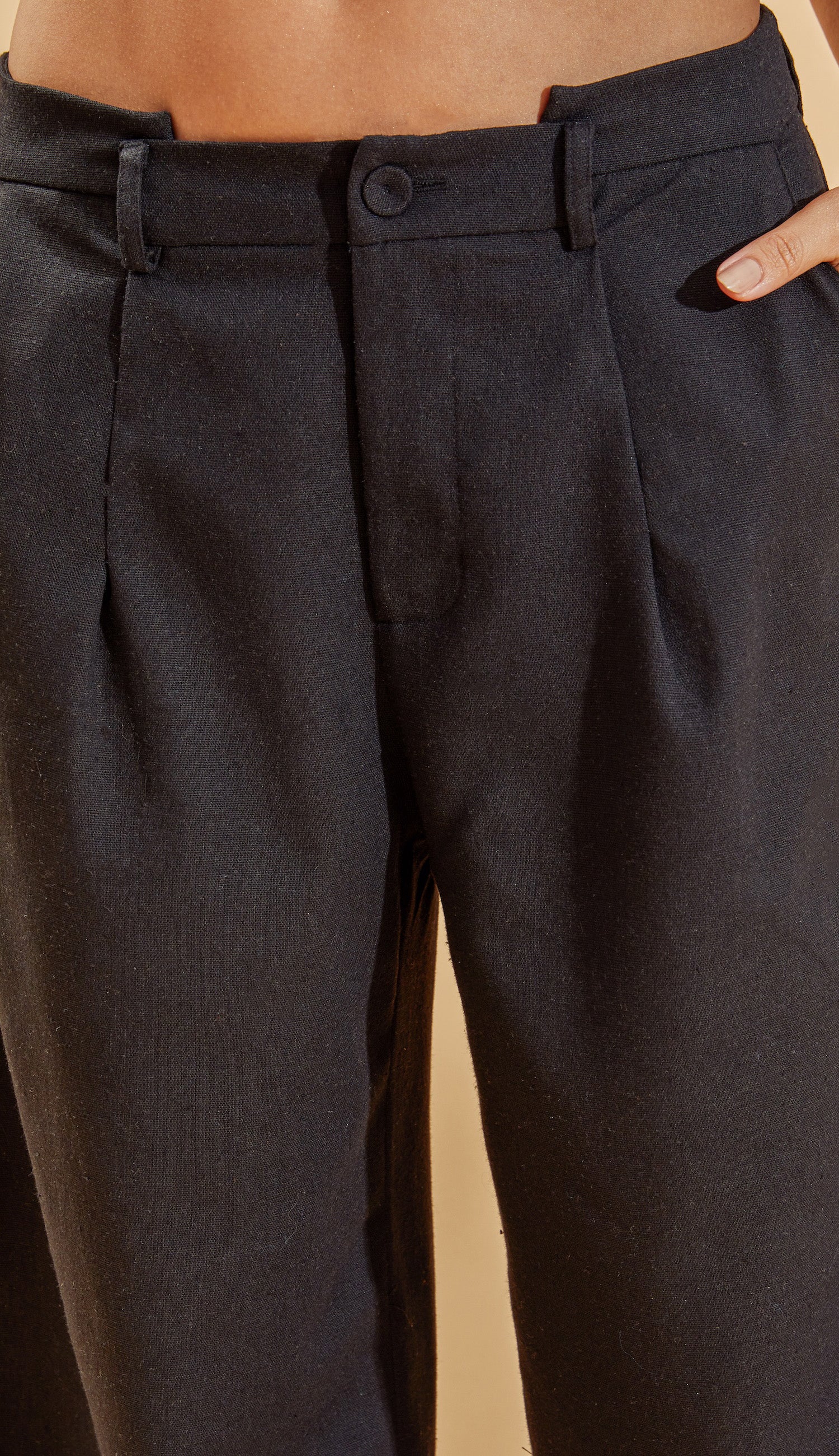 Calça wide leg confeccionada em linho. Possui cós assimétrico com passantes, pregas frontais, bolsos traseiros e fechamento frontal por zíper e botão forrado. Uma peça elegante e confortável para criar vários looks versáteis.