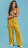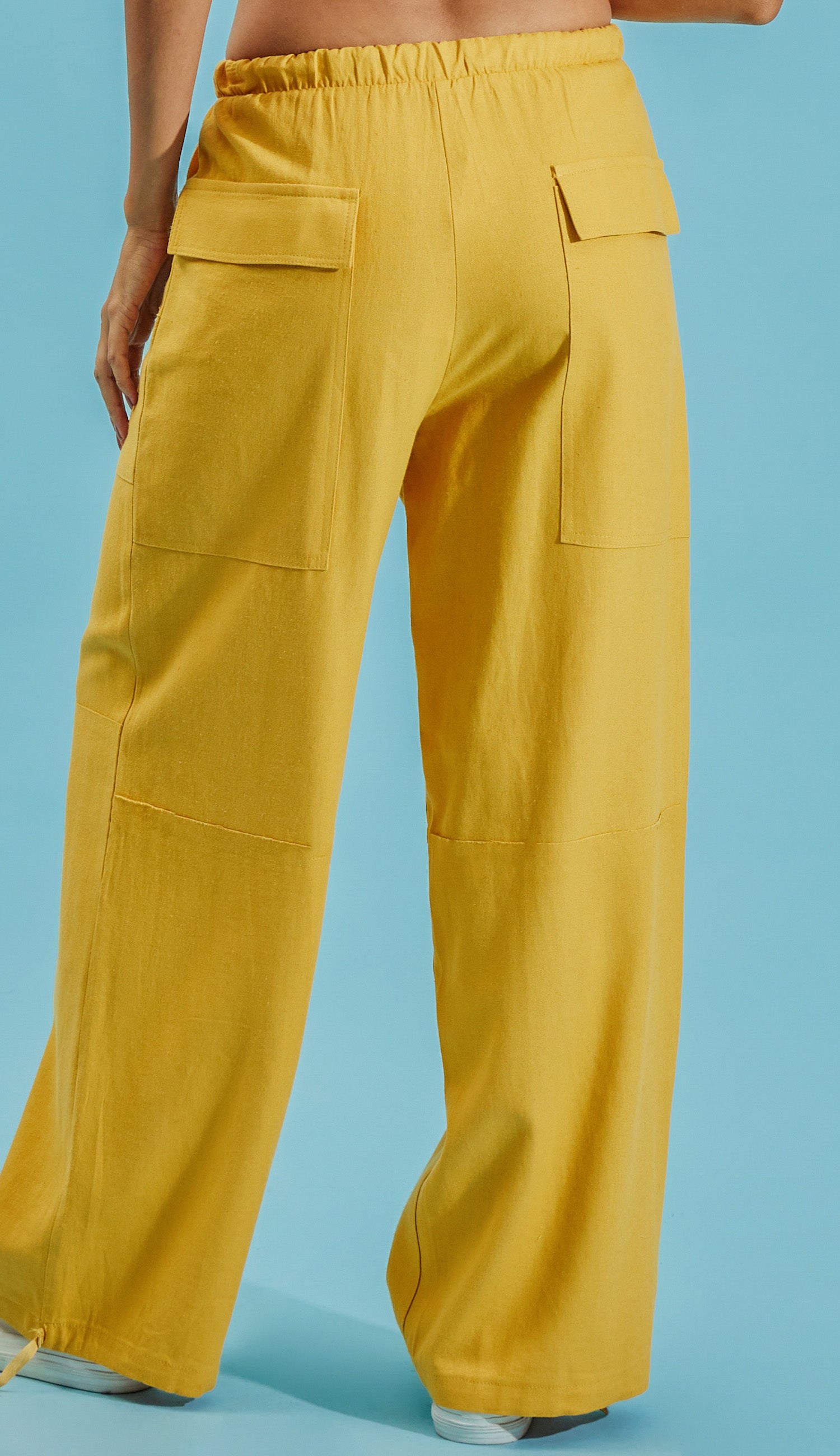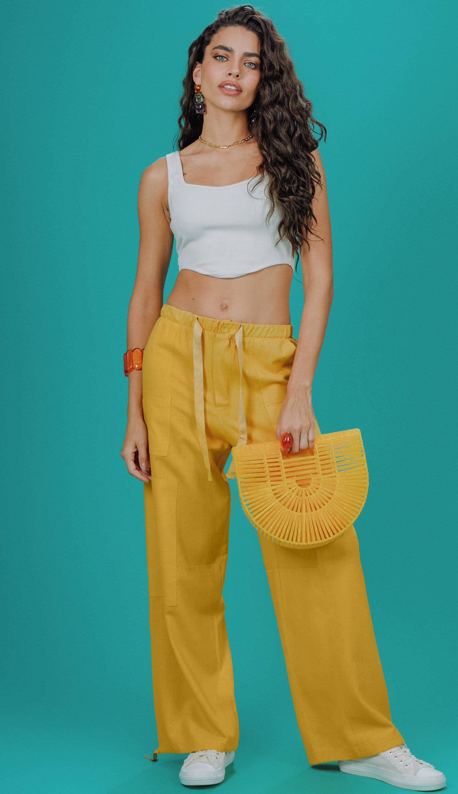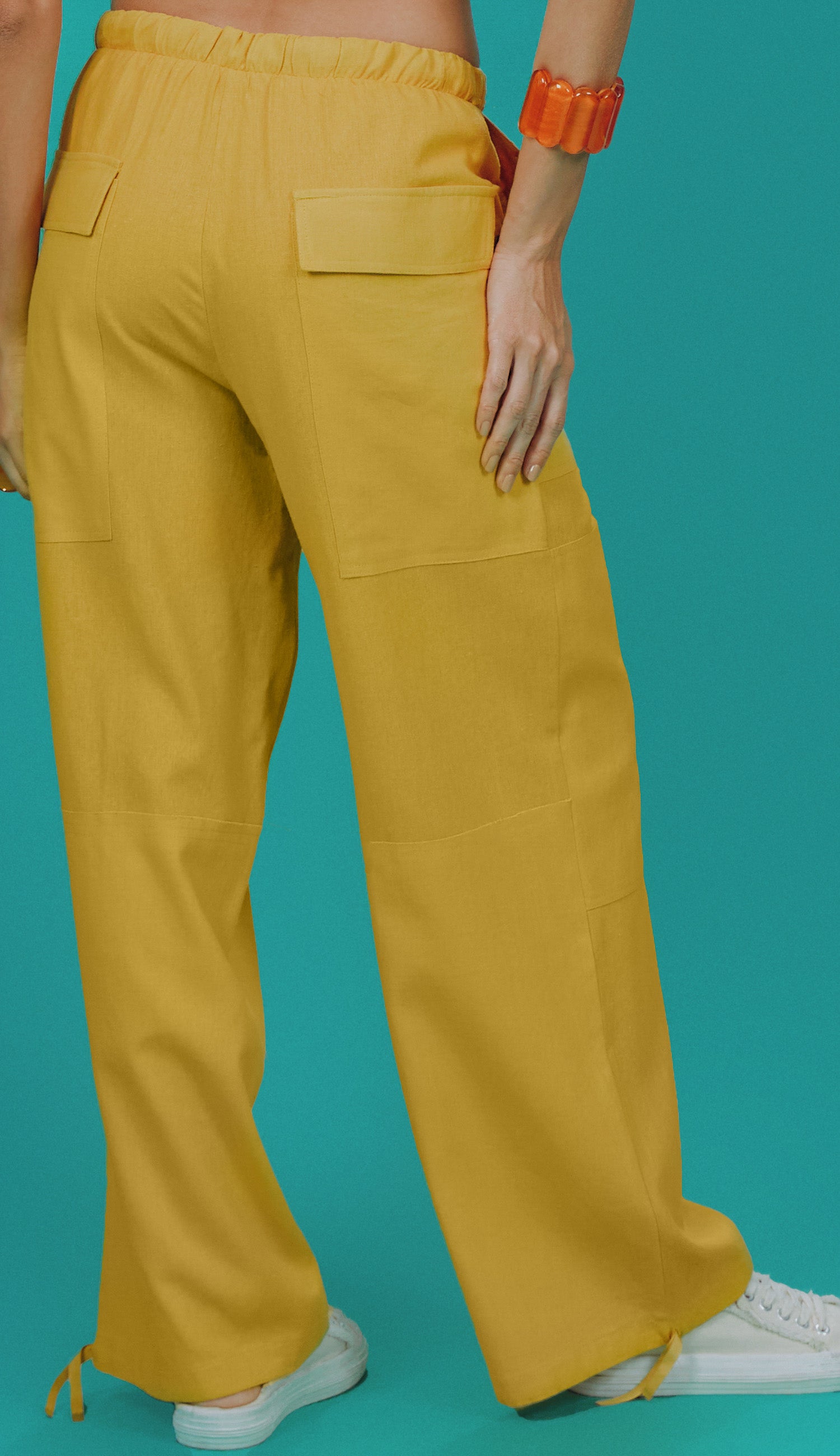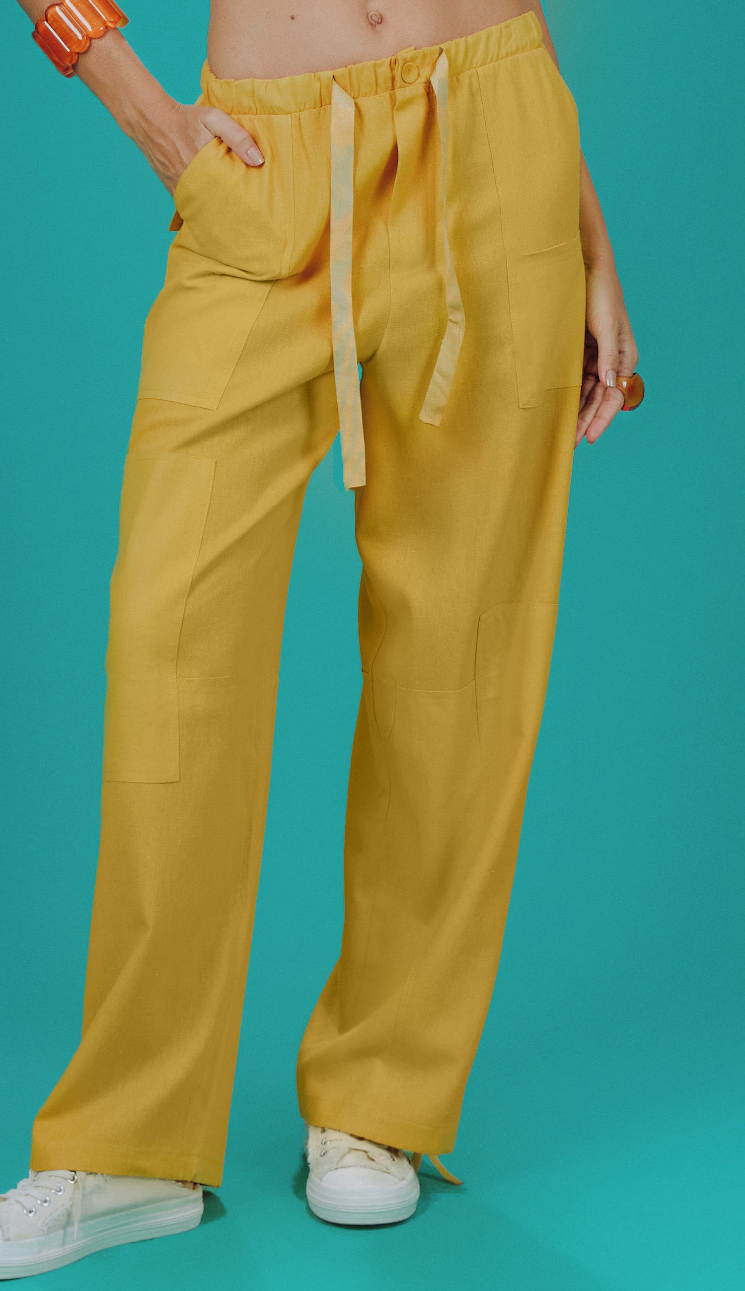 Calça wide confeccionada em linho. Possui elástico e fita gorgorão embutida para amarração no cós, bolsos laterais e bolsos traseiros com lapela, recortes frontais pespontados com detalhes desfiados parecendo "retalhos" e ajuste das pernas por fitas embutidas para amarração também.