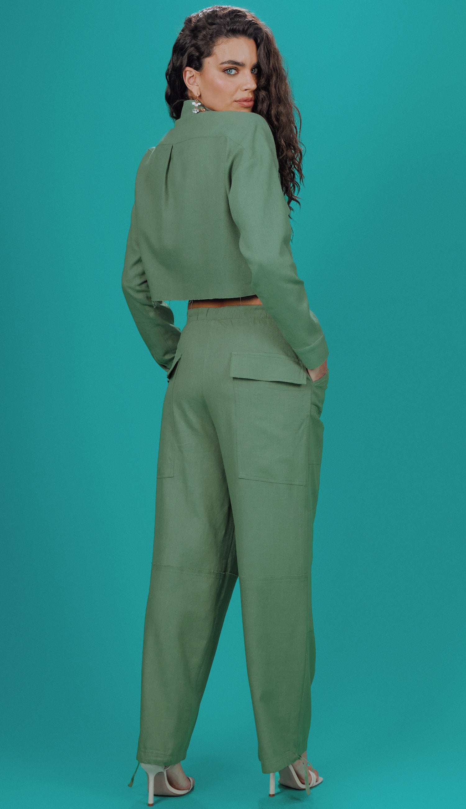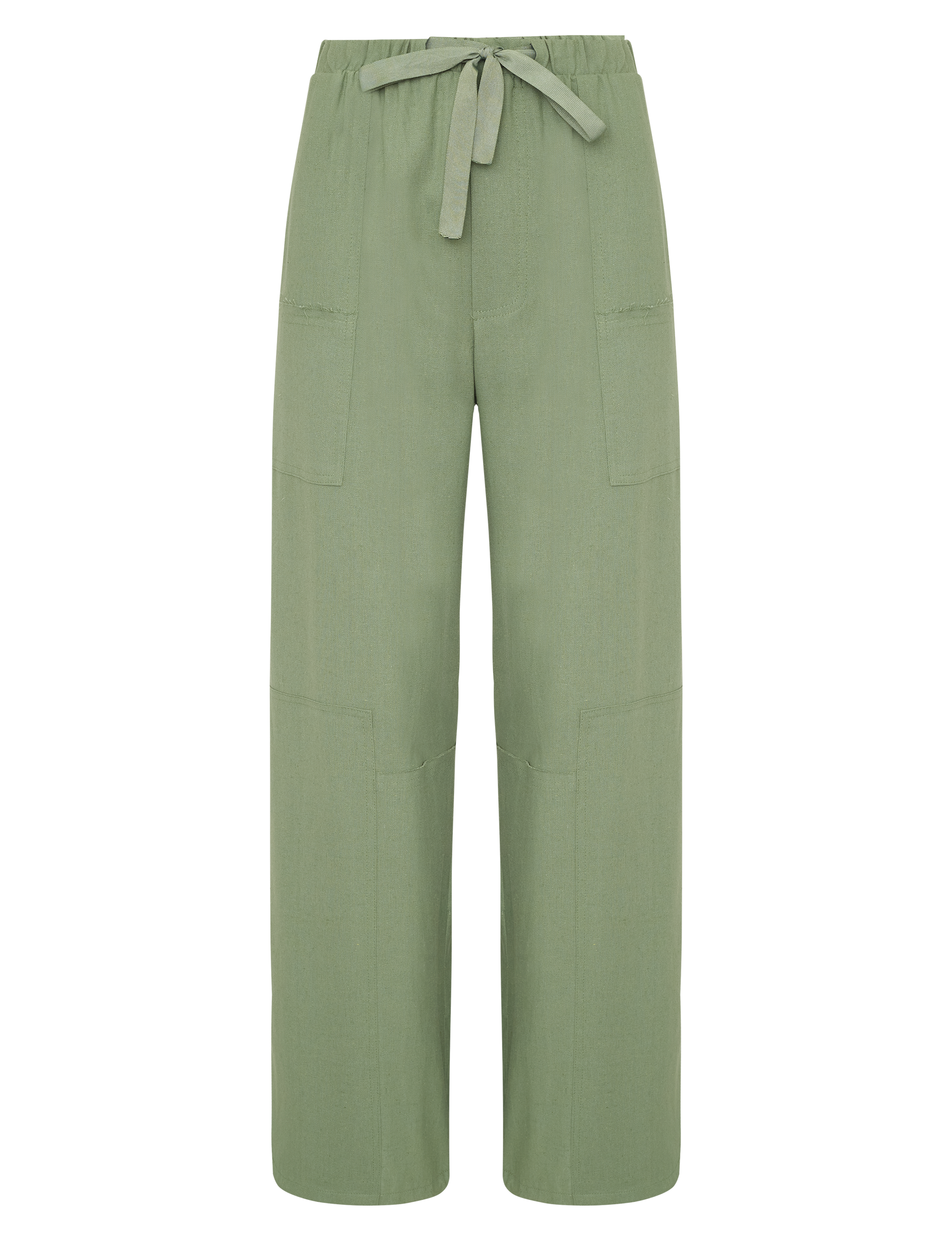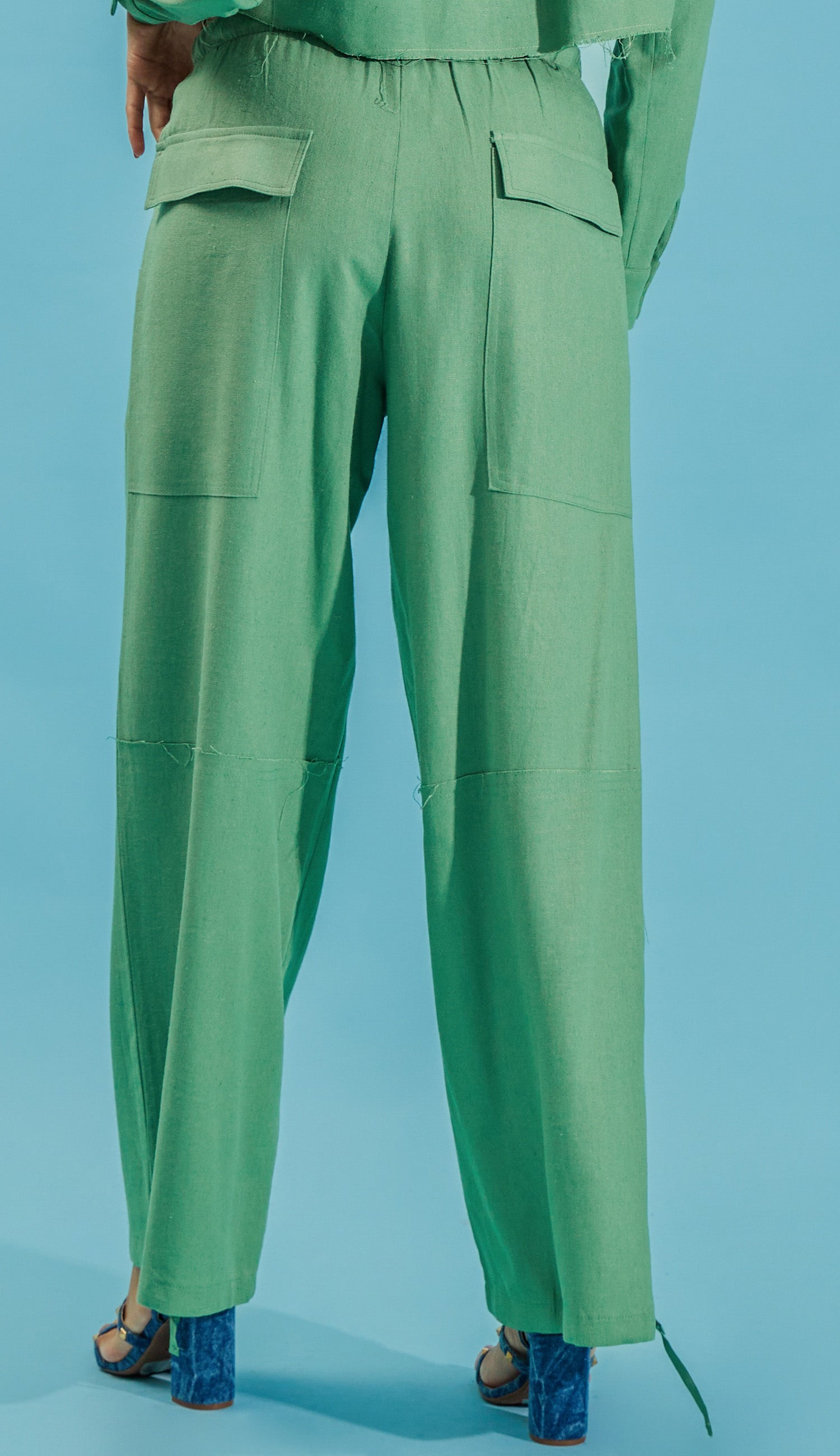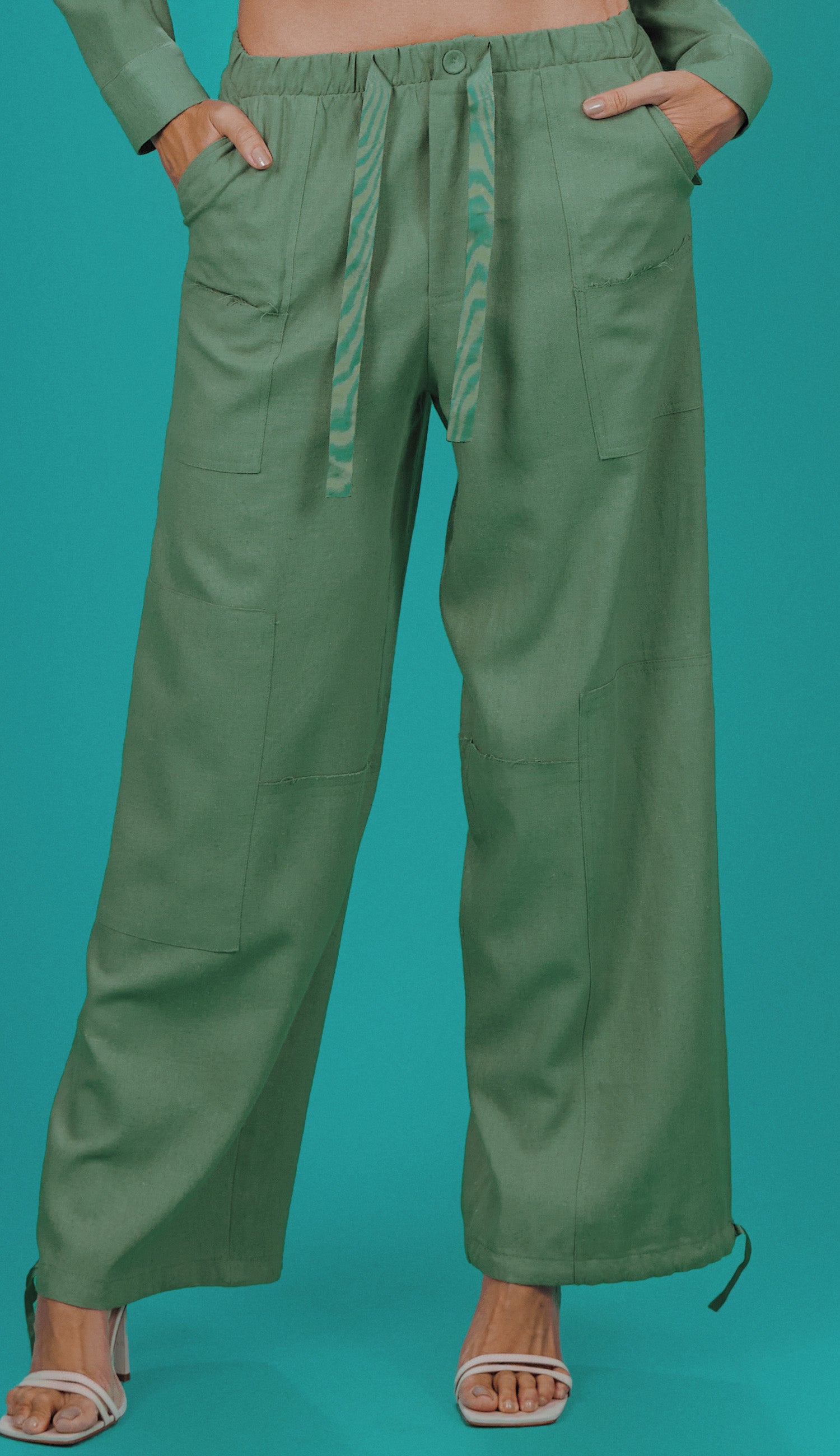 Calça wide confeccionada em linho. Possui elástico e fita gorgorão embutida para amarração no cós, bolsos laterais e bolsos traseiros com lapela, recortes frontais pespontados com detalhes desfiados parecendo "retalhos" e ajuste das pernas por fitas embutidas para amarração também.