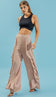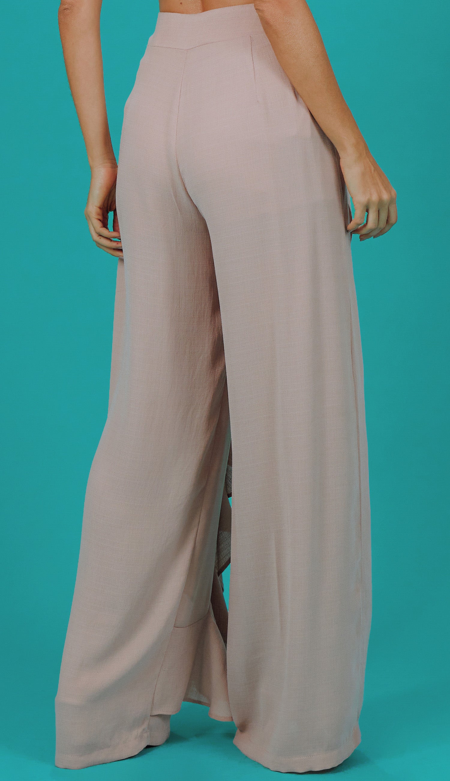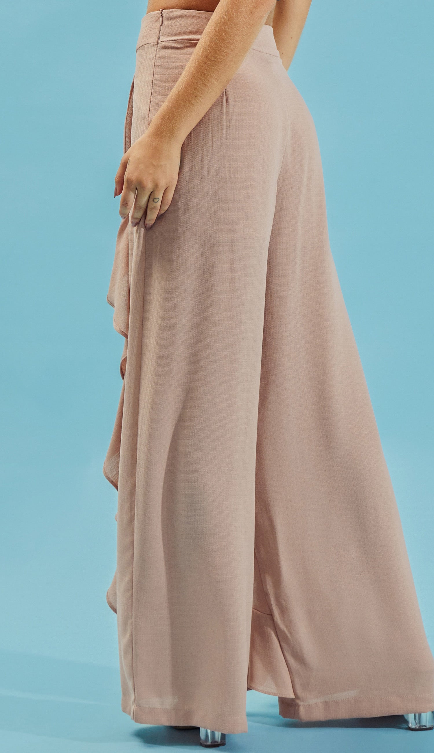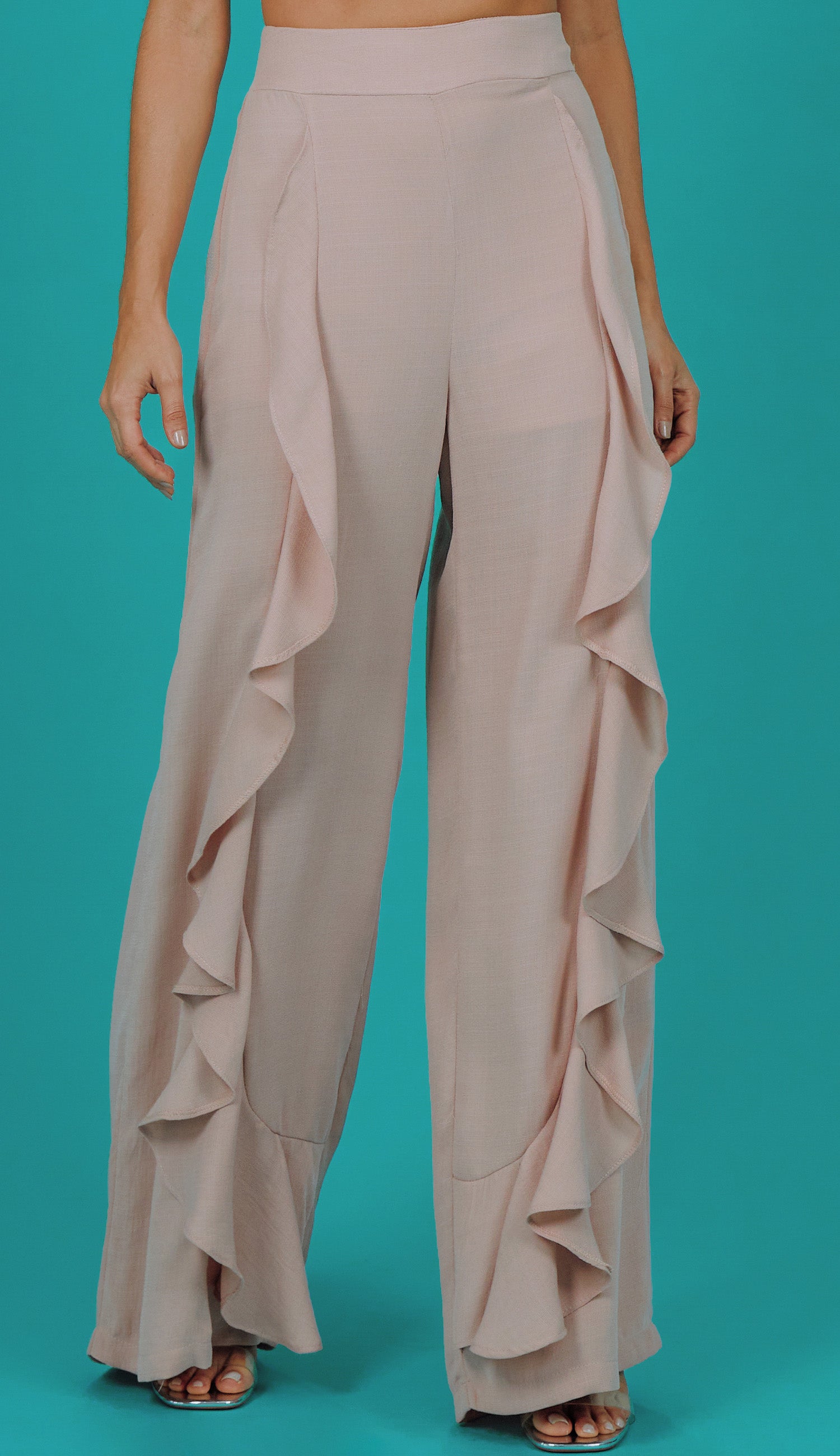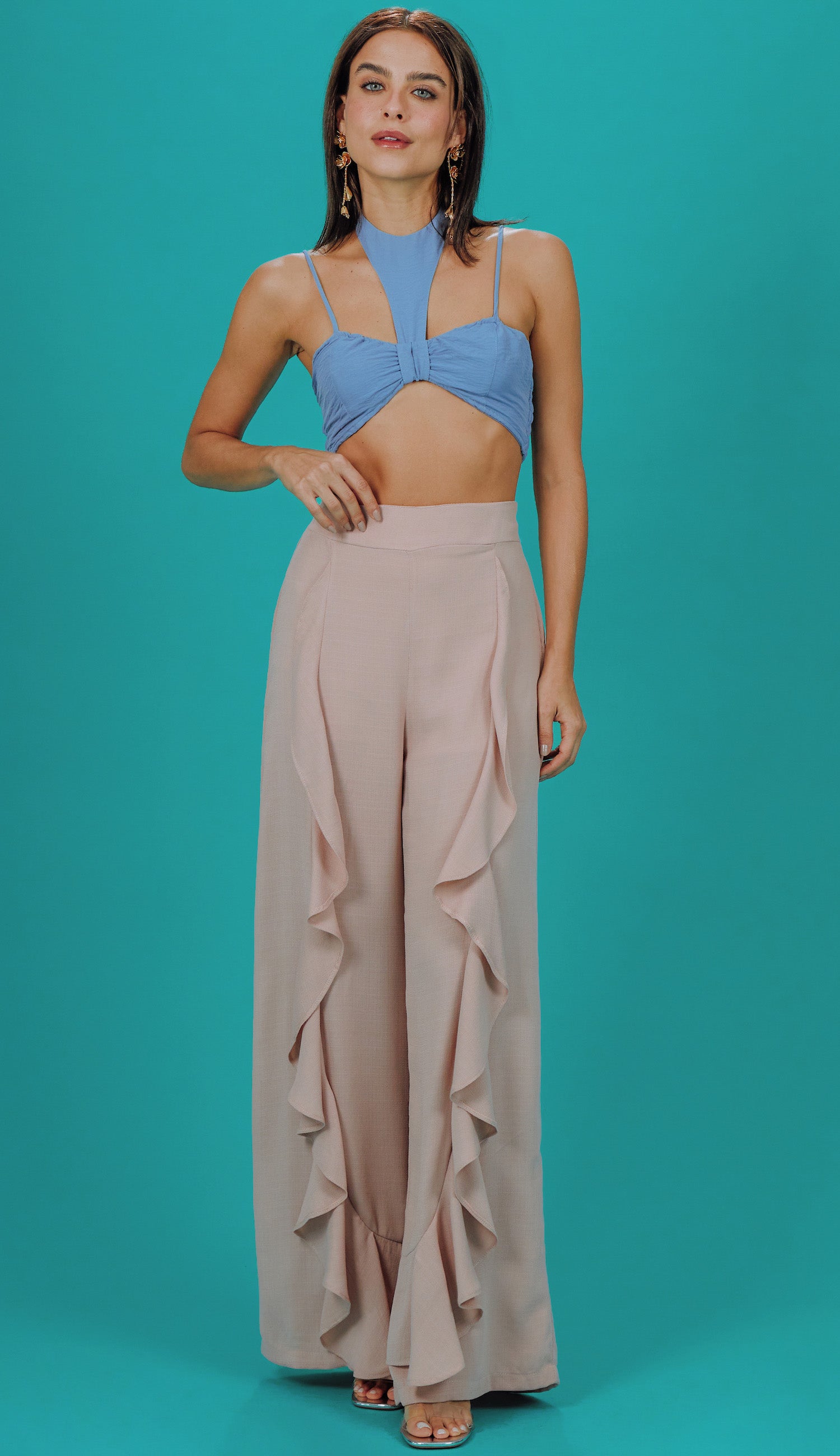 Calça pantalona com forro, confeccionada em crepe texturizado mais encorpadinho com aspecto de linho. Possui fechamento lateral por zíper invisível e recortes com aplicação de babados na frente.