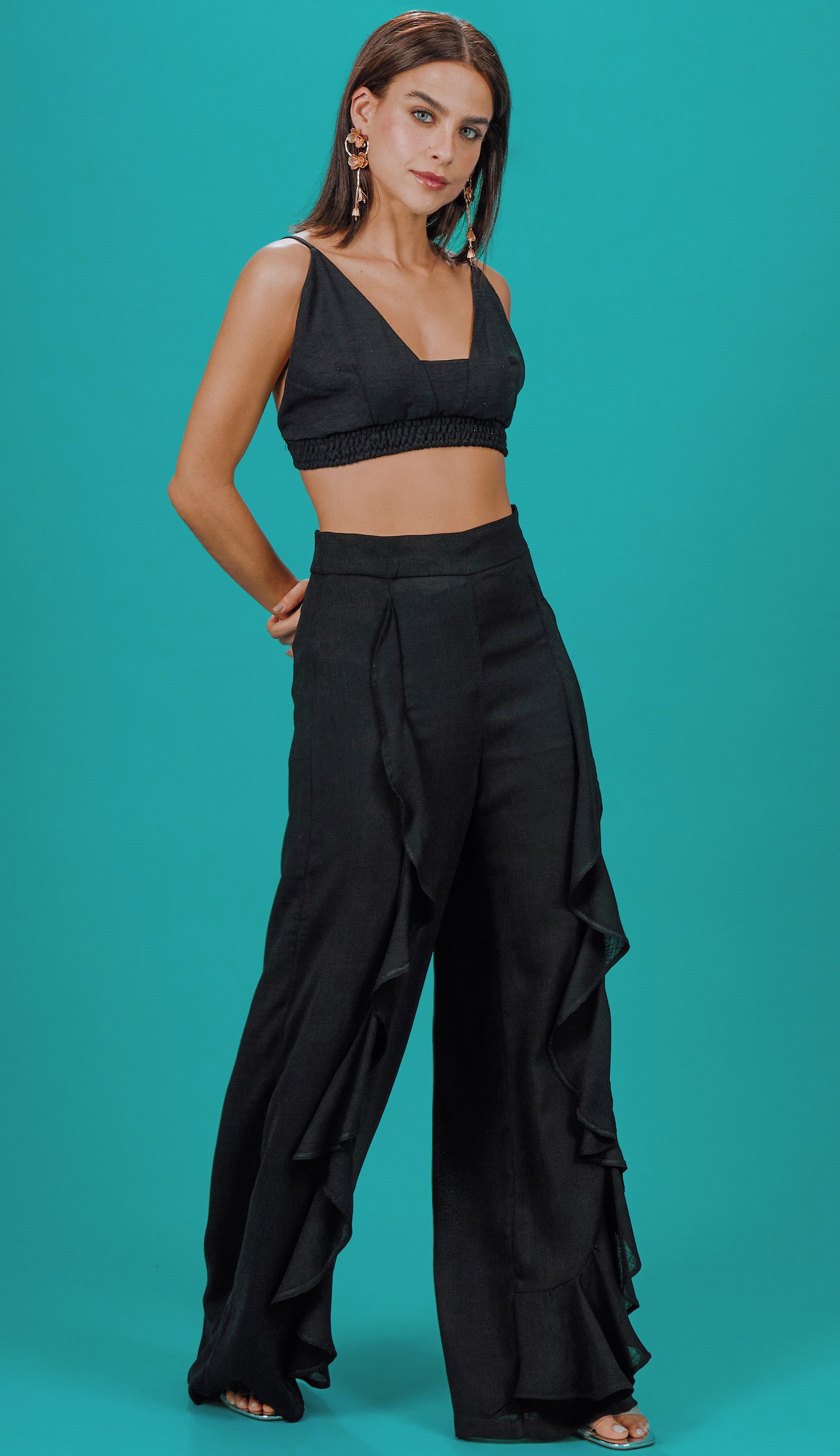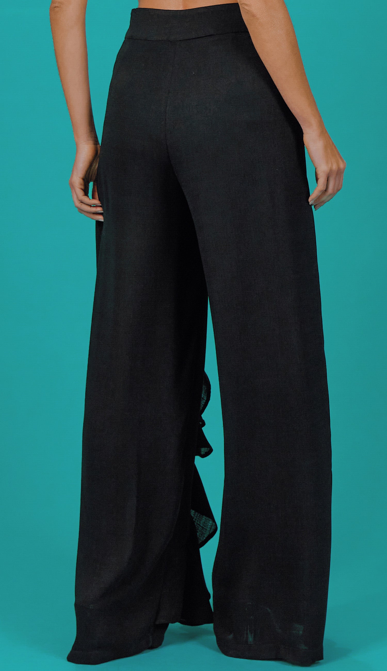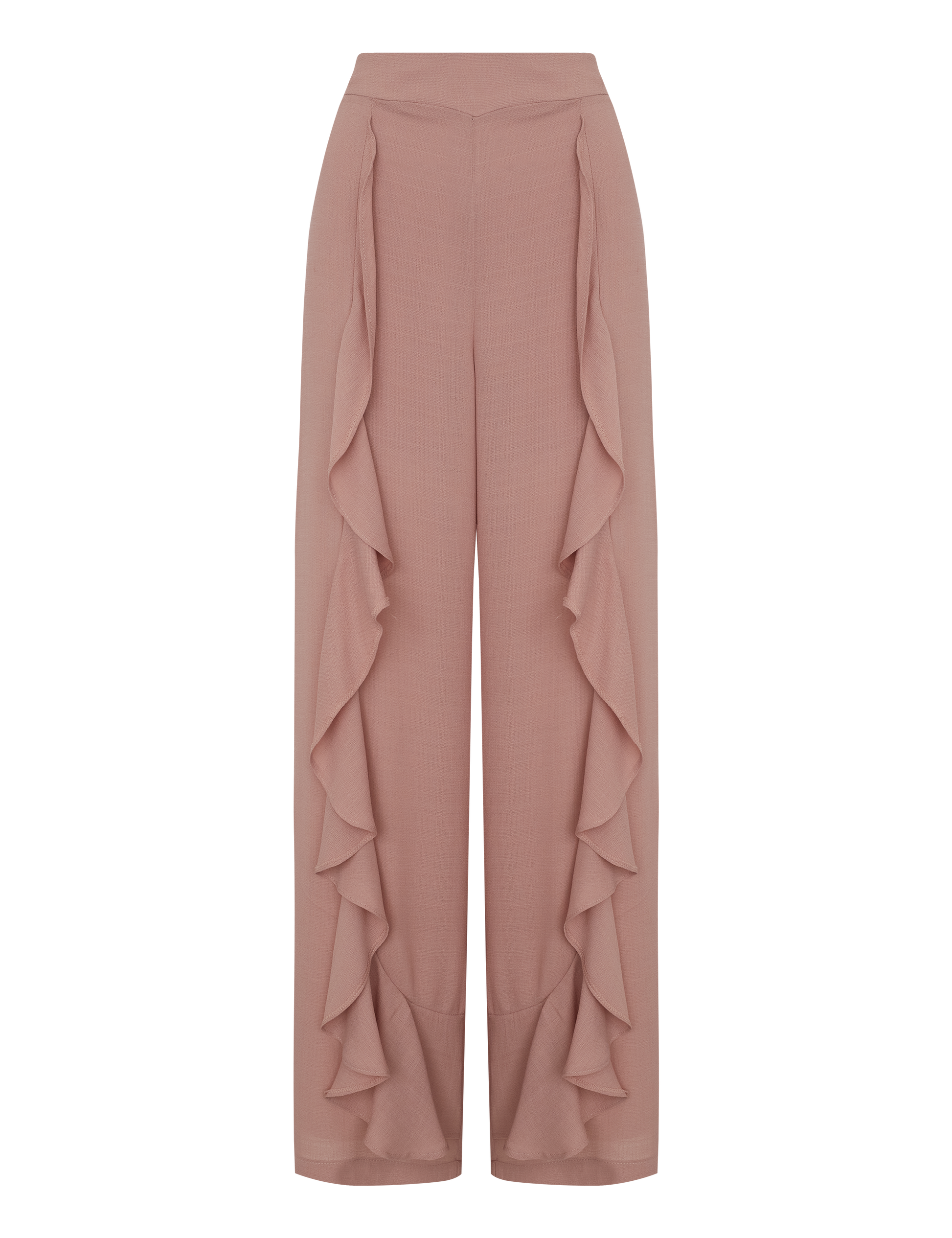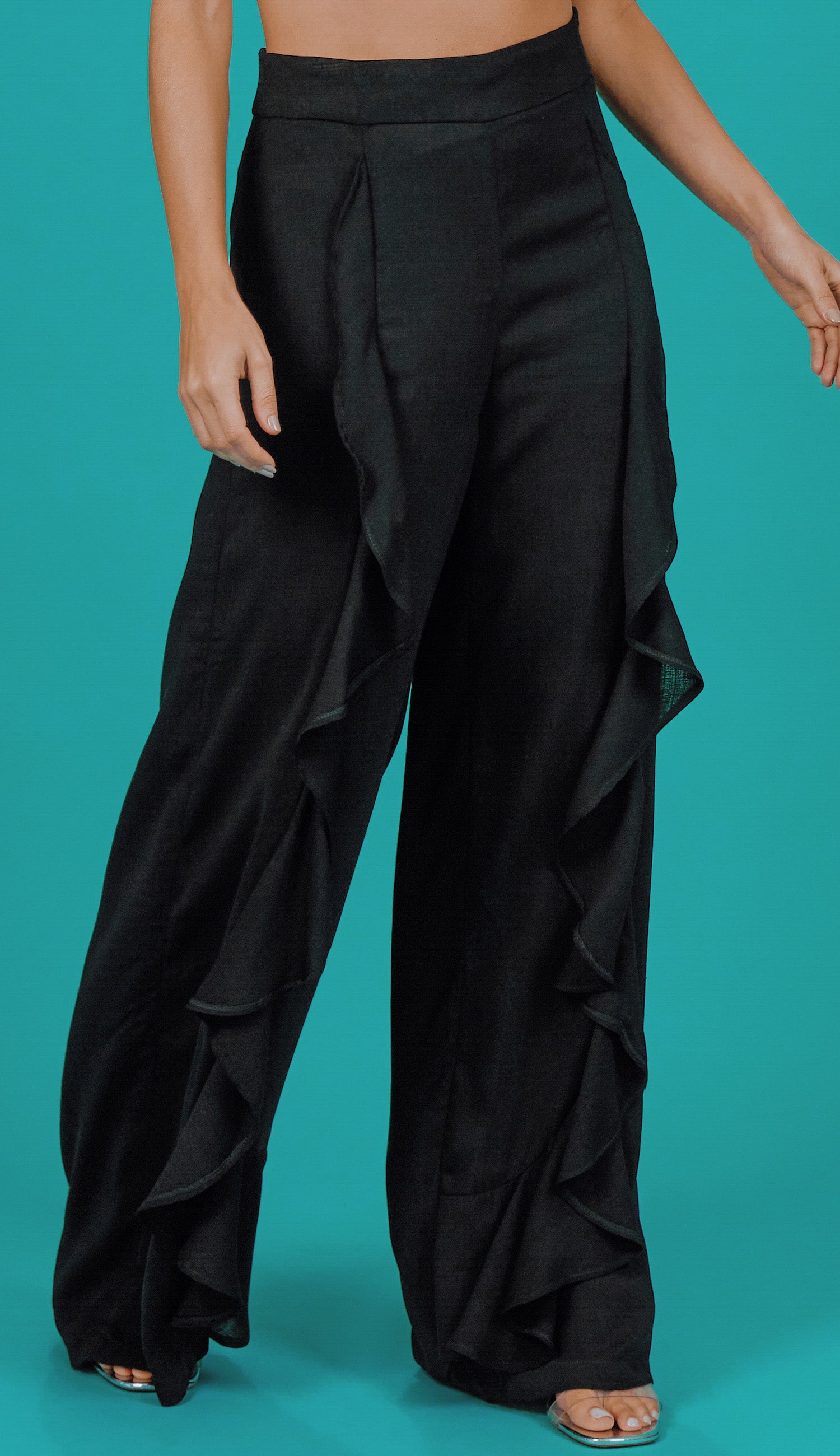 Calça pantalona com forro, confeccionada em crepe texturizado mais encorpadinho com aspecto de linho. Possui fechamento lateral por zíper invisível e recortes com aplicação de babados na frente.