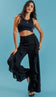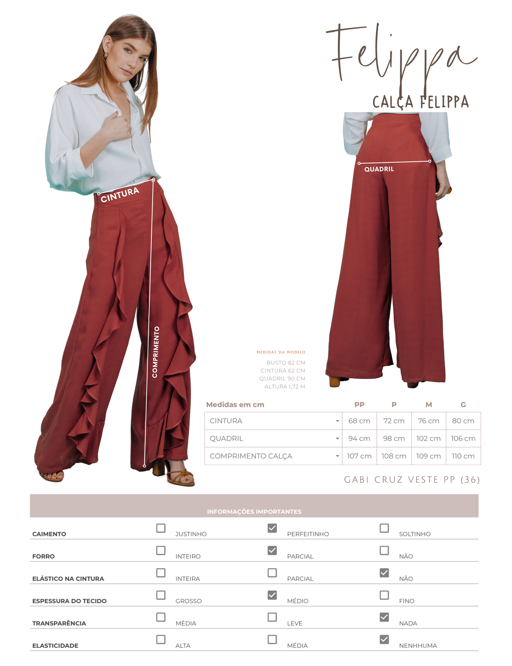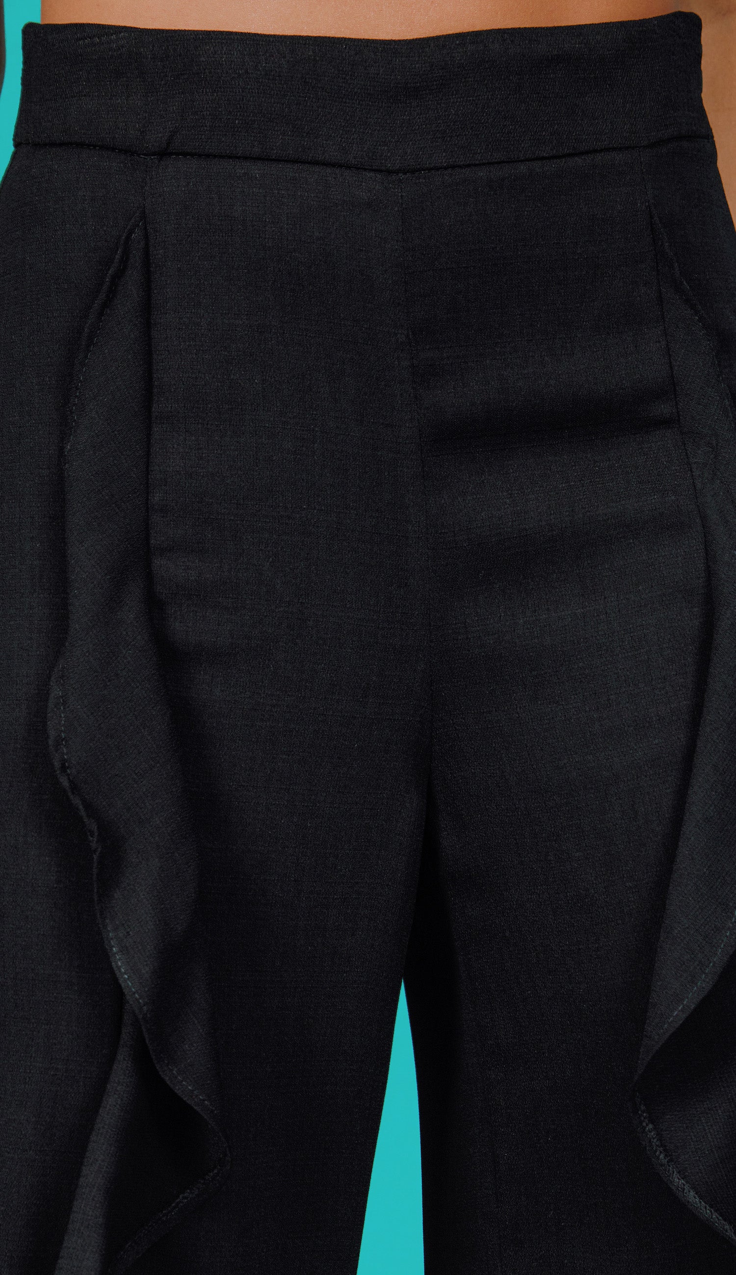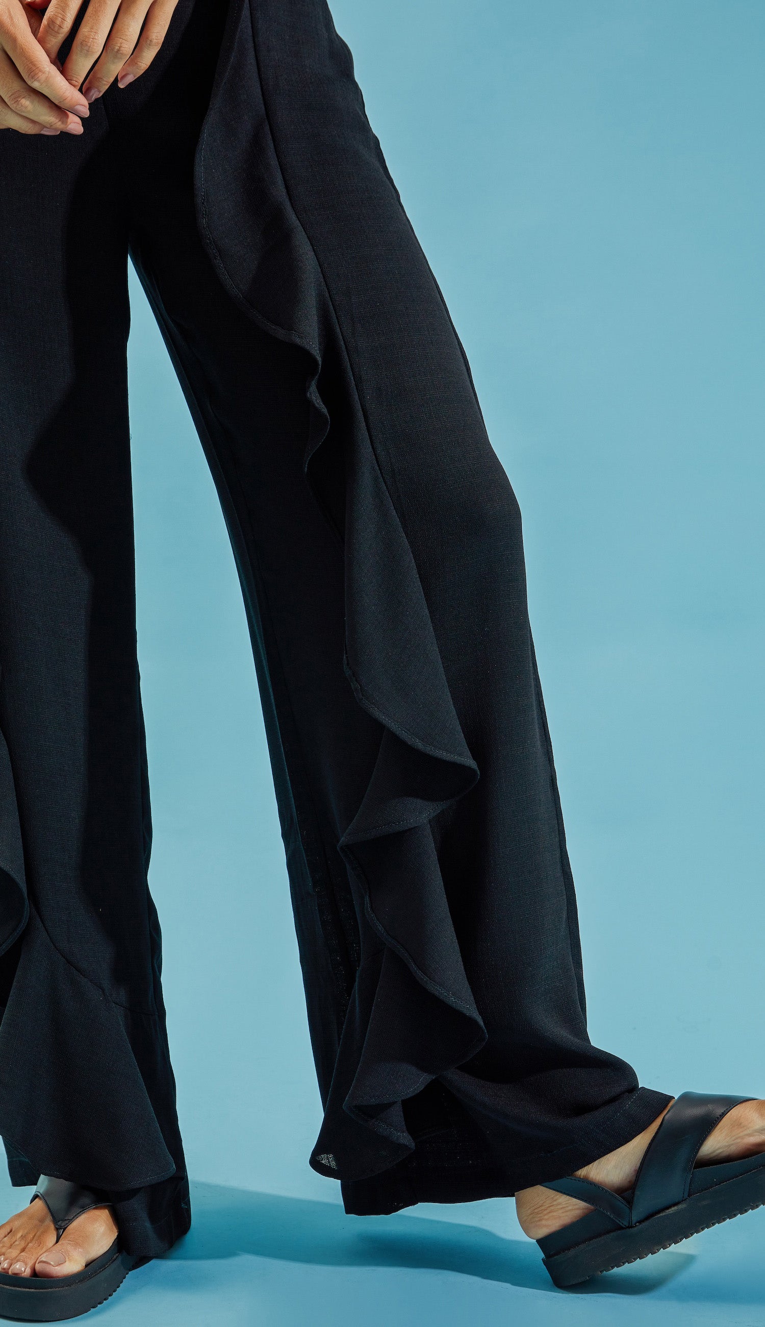 Calça pantalona com forro, confeccionada em crepe texturizado mais encorpadinho com aspecto de linho. Possui fechamento lateral por zíper invisível e recortes com aplicação de babados na frente.