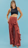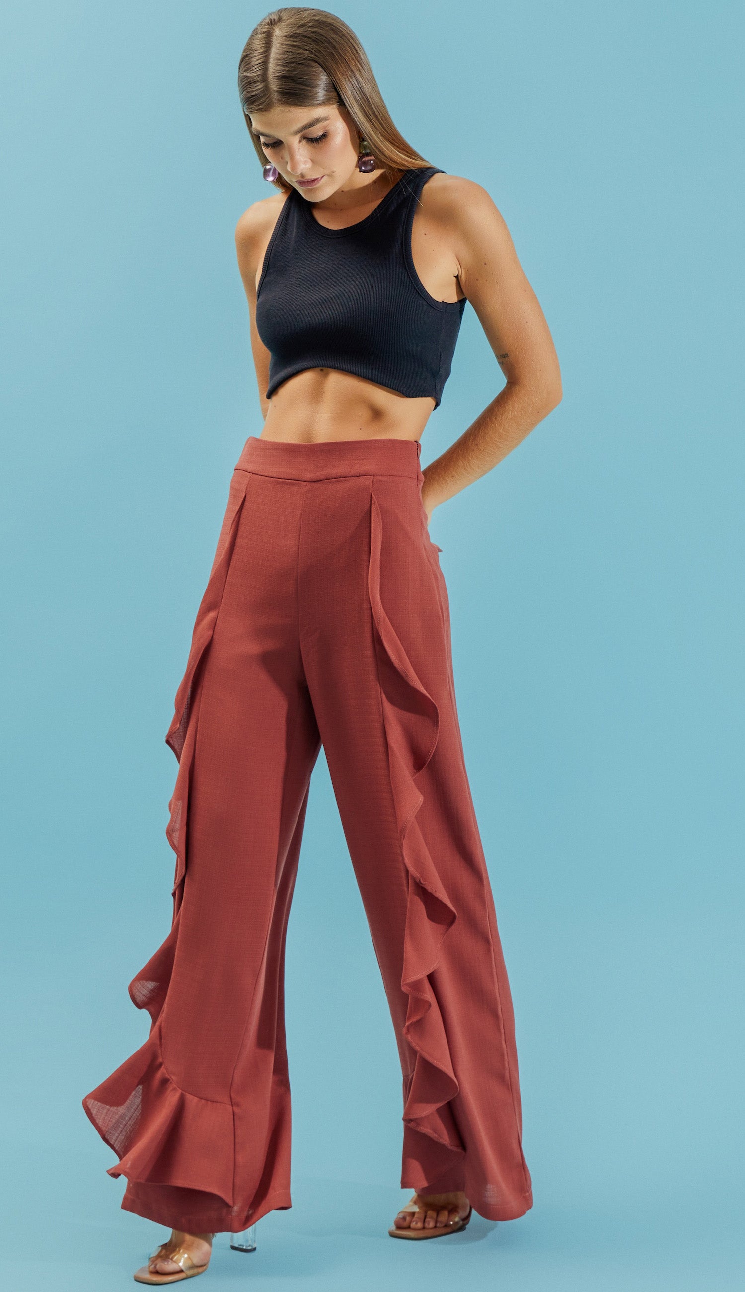 Calça pantalona com forro, confeccionada em crepe texturizado mais encorpadinho com aspecto de linho. Possui fechamento lateral por zíper invisível e recortes com aplicação de babados na frente.