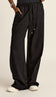 Calça confeccionada em moletom. Possui elástico franzido no cós com cordãozinho embutido para amarração que tem ponteiras de metal em formato de conchinhas; bolsos faca laterais e pernas soltinhas retas estilo wide.