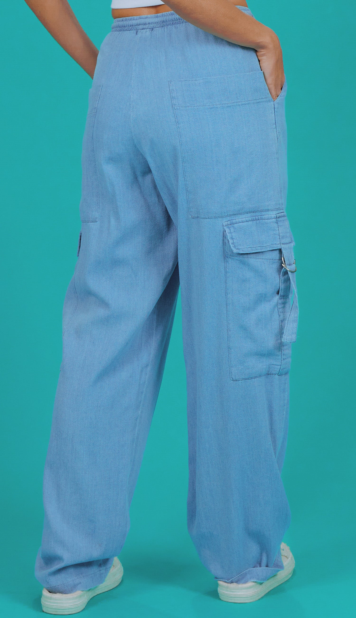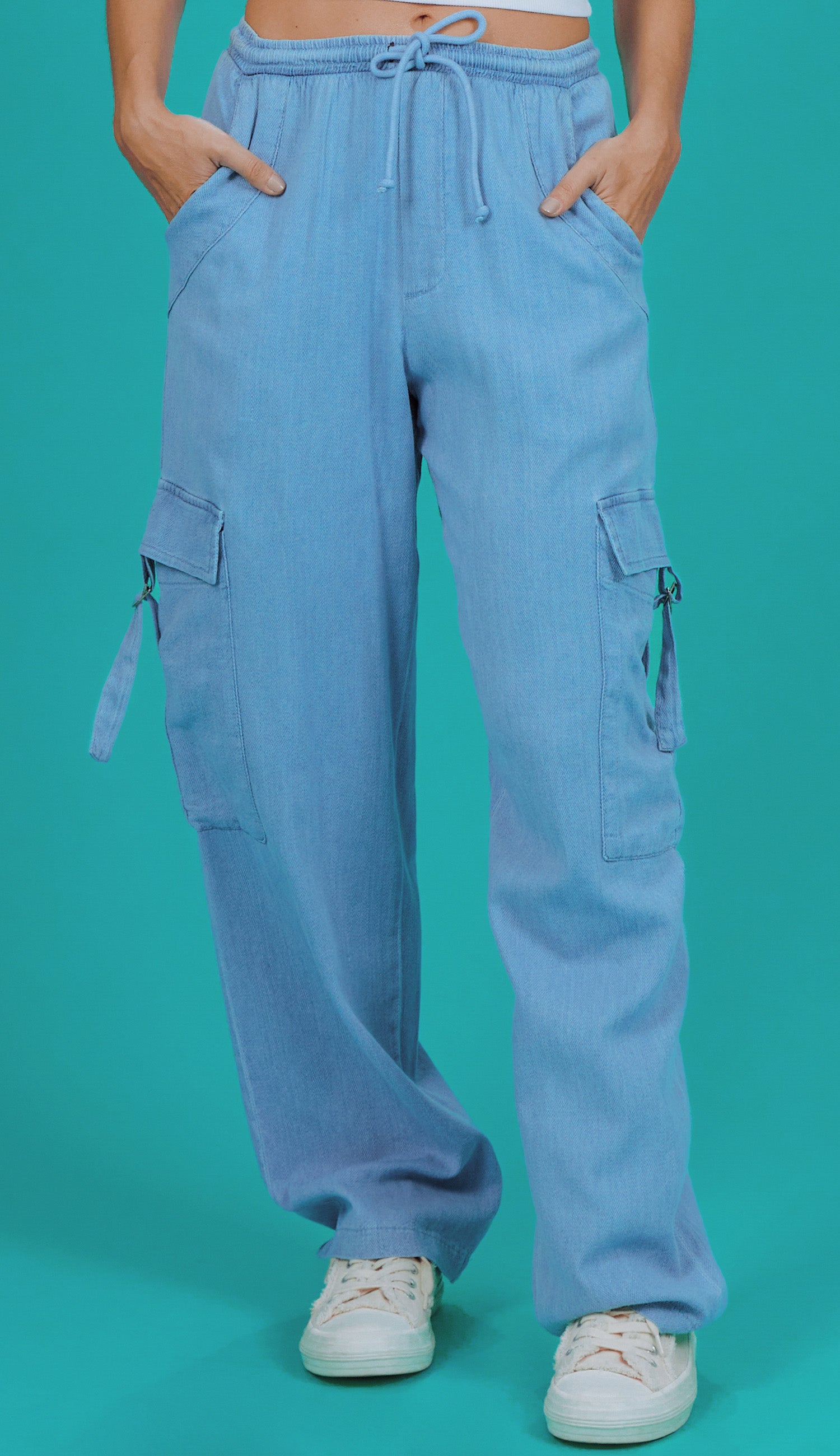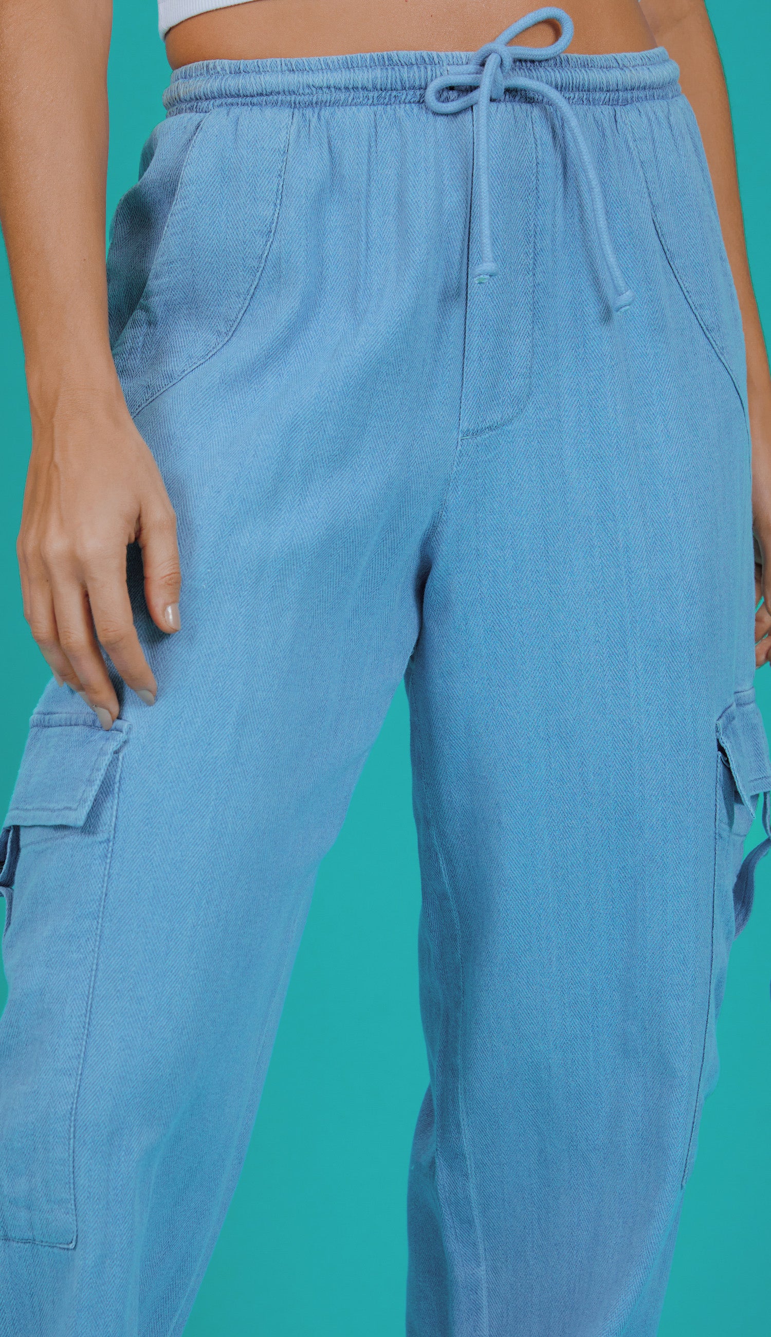 Calça jeans com modelagem solta, elástico e cordão embutido para amarração no cós, ajuste da barra também por tirinhas, bolsos frontais, maxi bolsos traseiros e laterais com lapela dobrada no estilo cargo e detalhe de argolas meia lua de metal com tirinhas. O tecido é leve, fresco e macio por dentro, perfeito para os climas mais quentes.