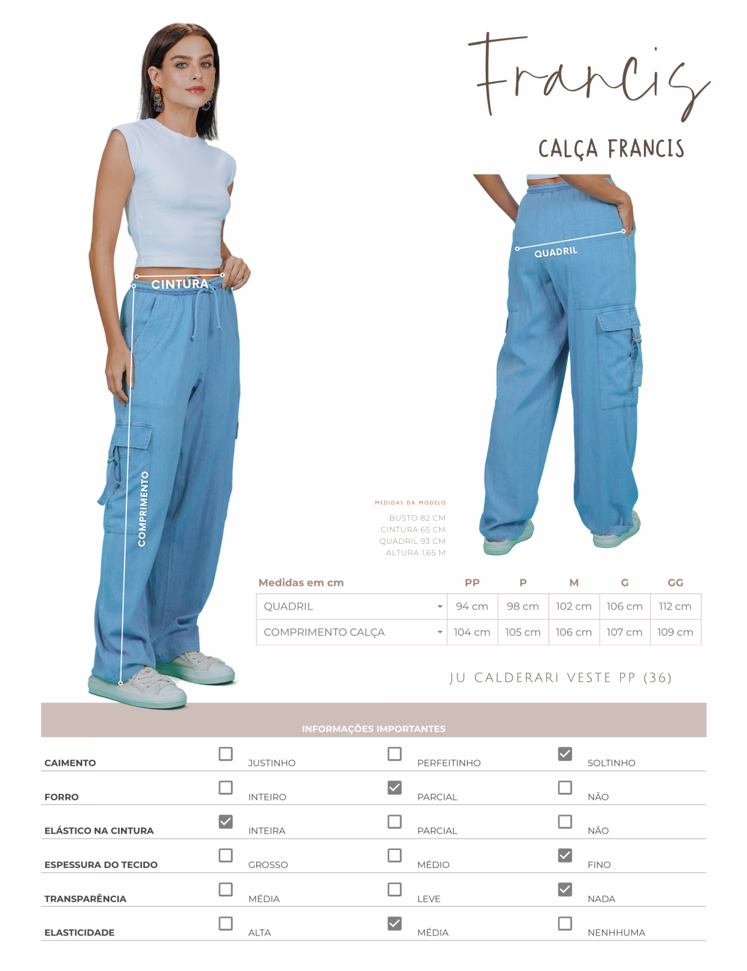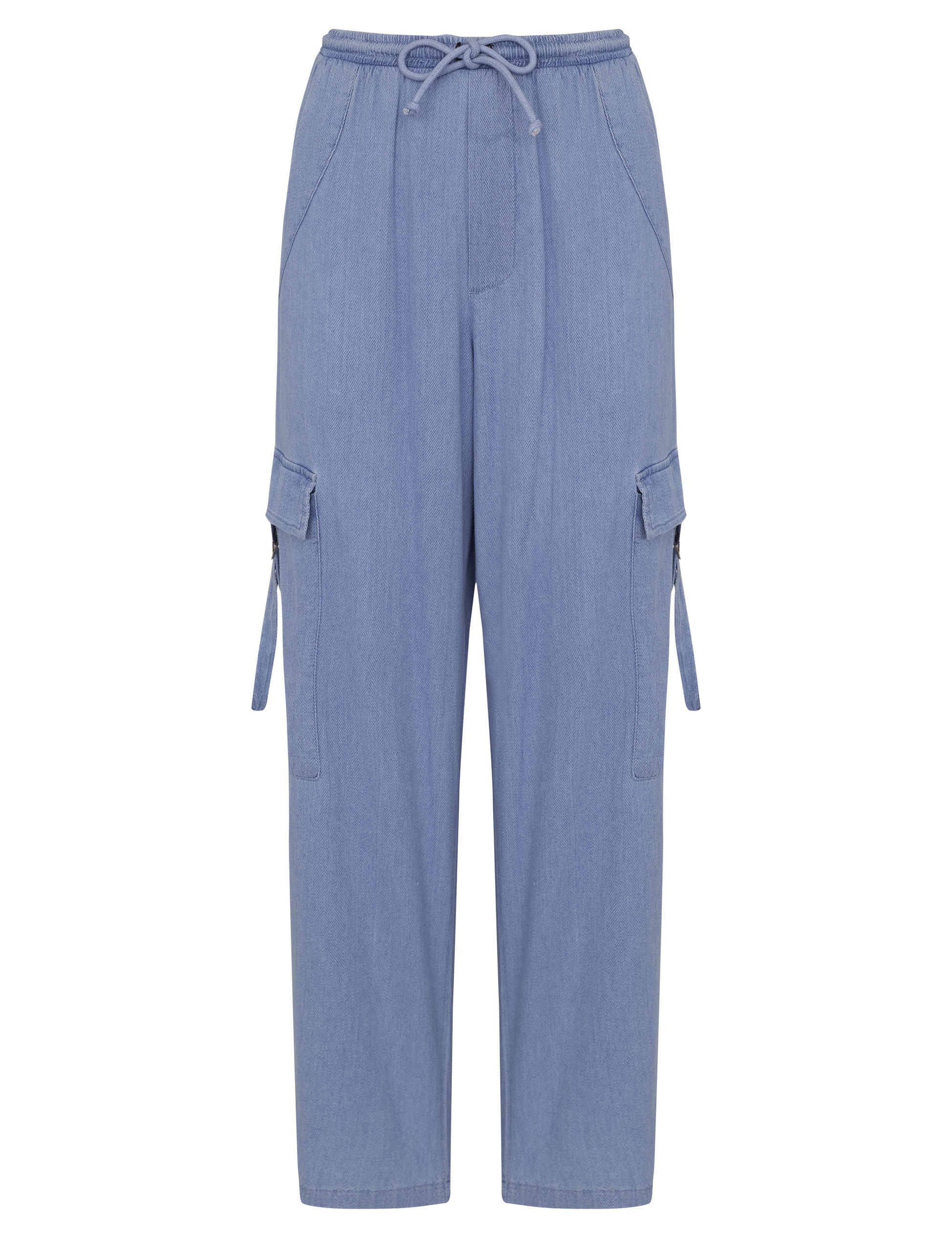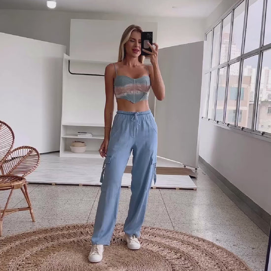 Calça jeans com modelagem solta, elástico e cordão embutido para amarração no cós, ajuste da barra também por tirinhas, bolsos frontais, maxi bolsos traseiros e laterais com lapela dobrada no estilo cargo e detalhe de argolas meia lua de metal com tirinhas. O tecido é leve, fresco e macio por dentro, perfeito para os climas mais quentes.