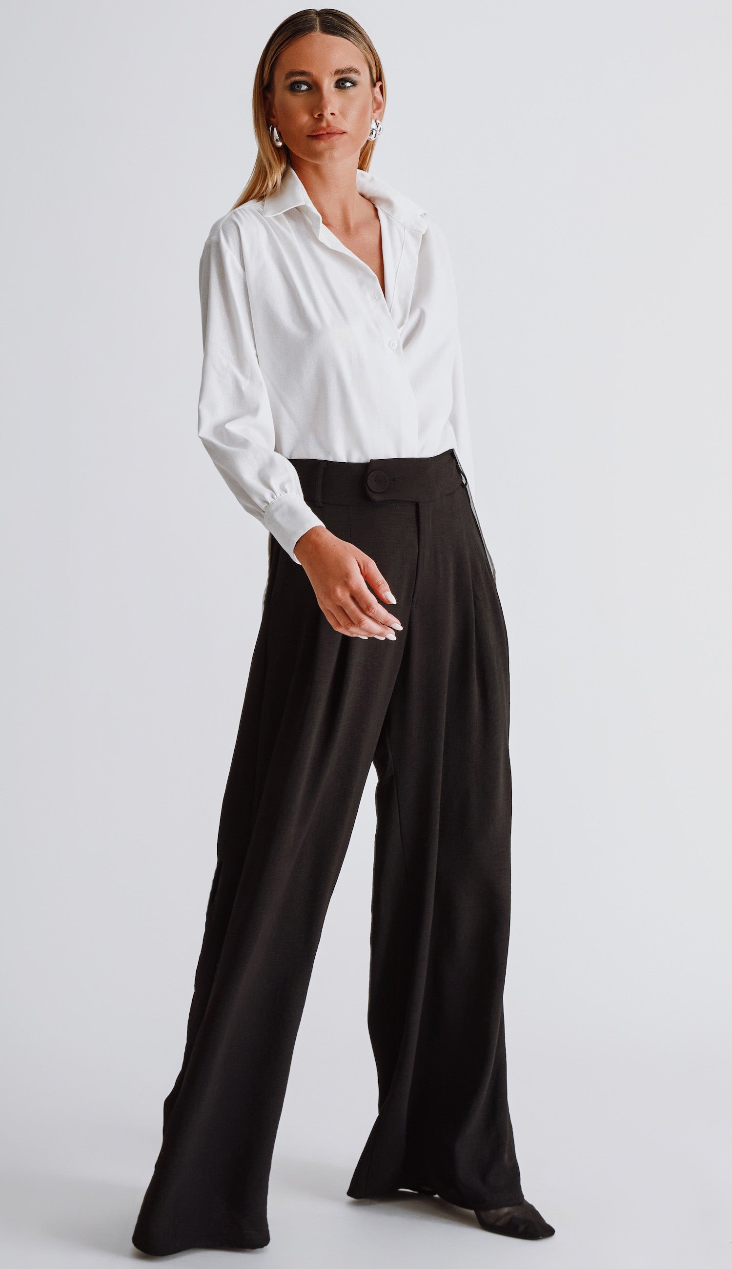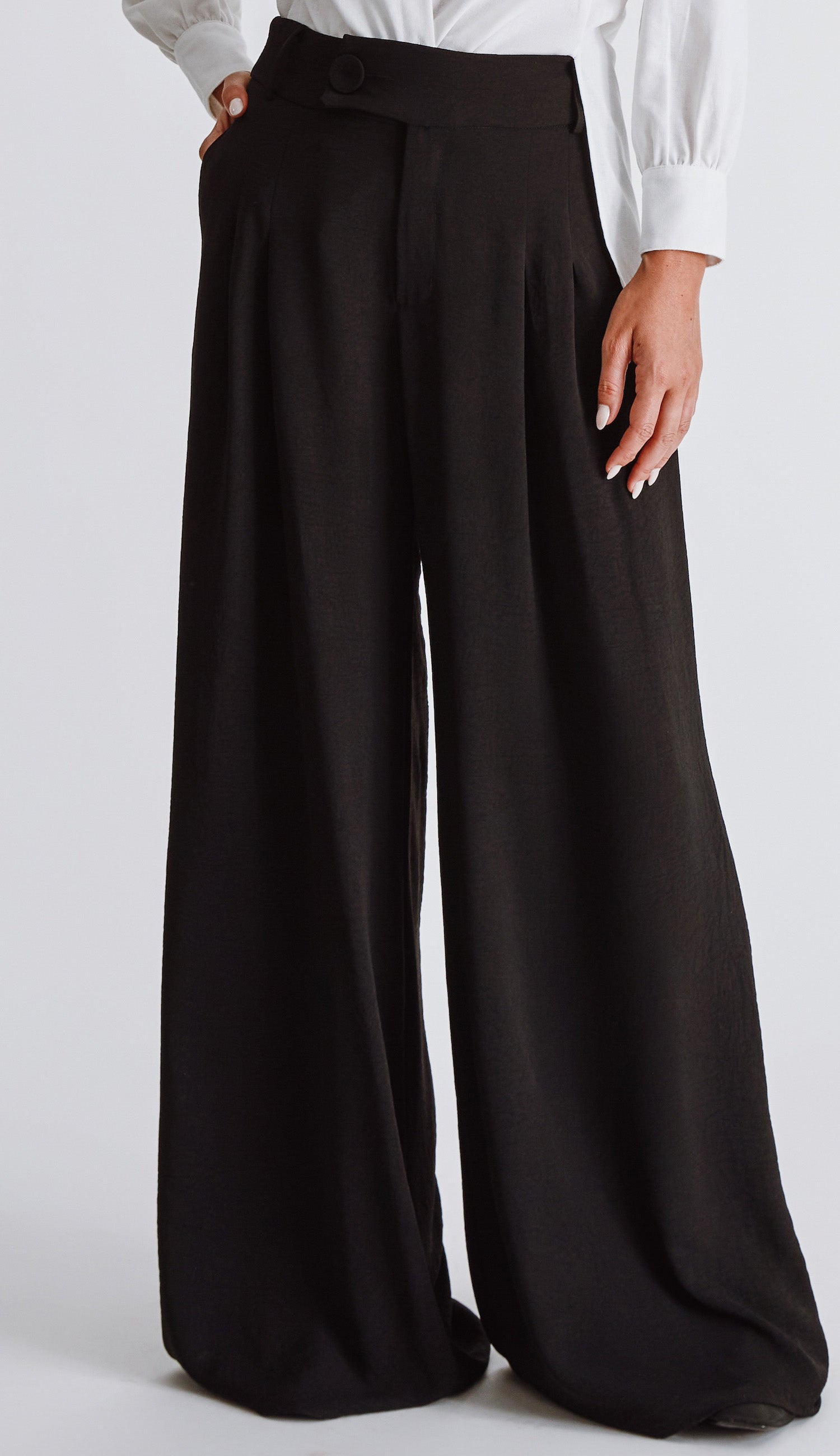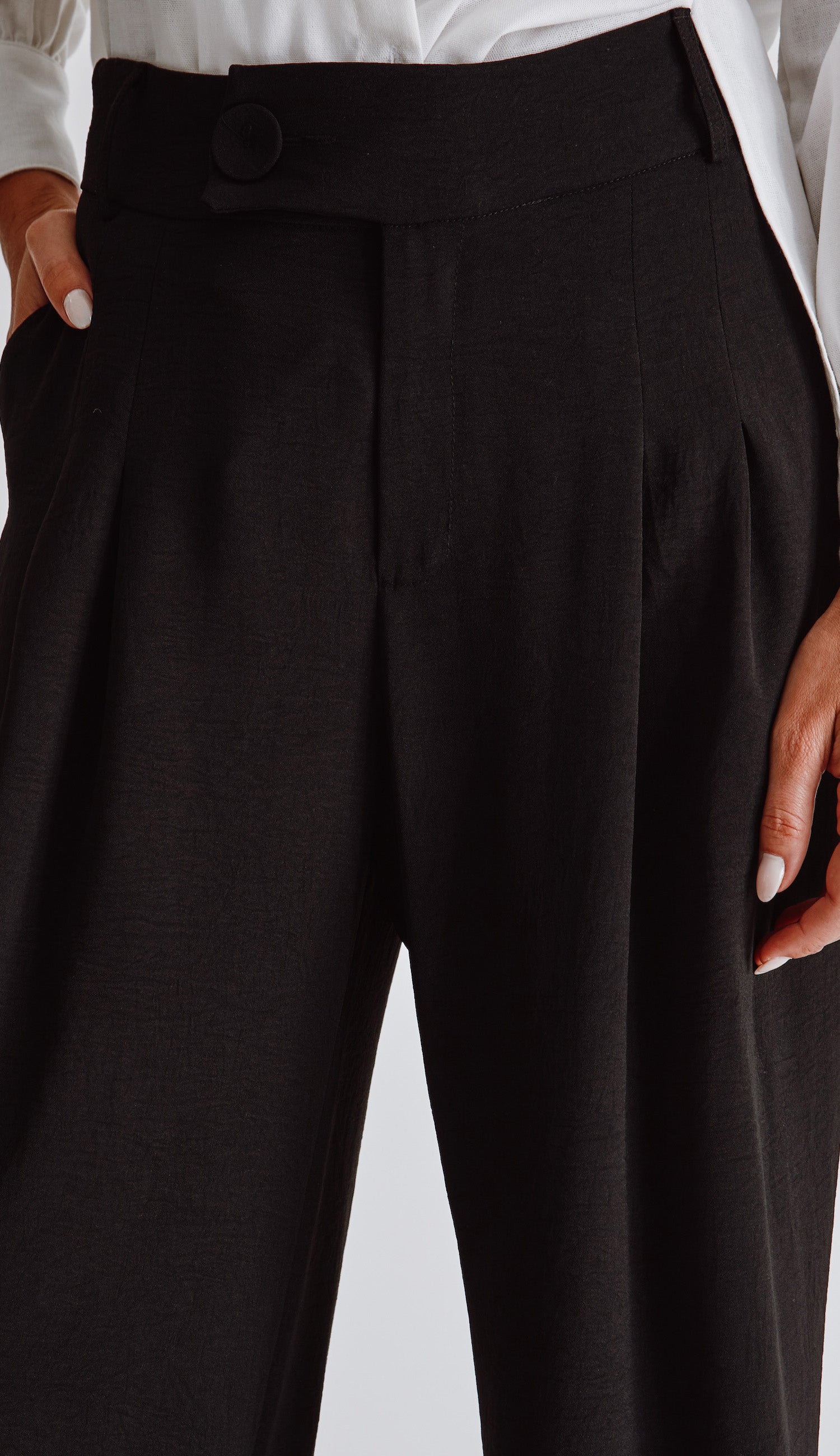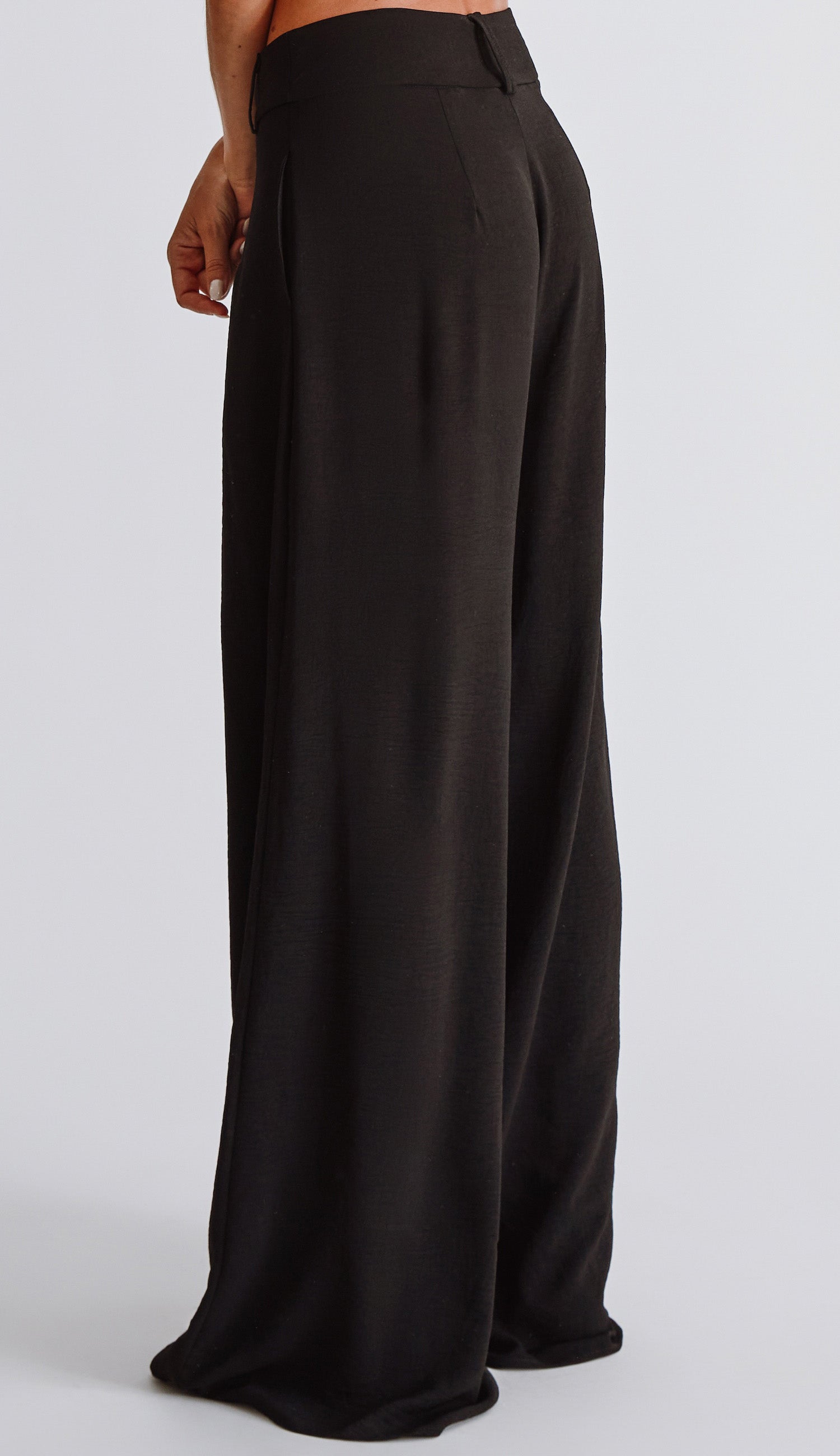 Calça pantalona confeccionada em crepe texturizado com efeito amassadinho.. Possui modelagem de alfaiataria com bolsos laterais, cós mais largo com passantes, pregas frontais e fechamento por zíper, botão forrado deslocado e botão interno.