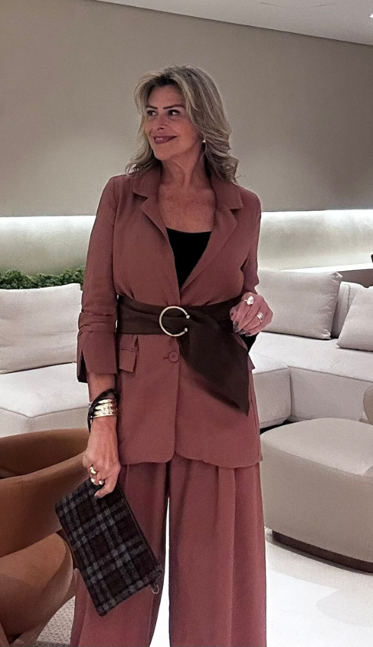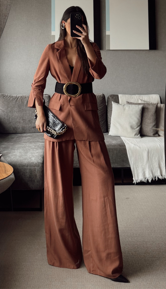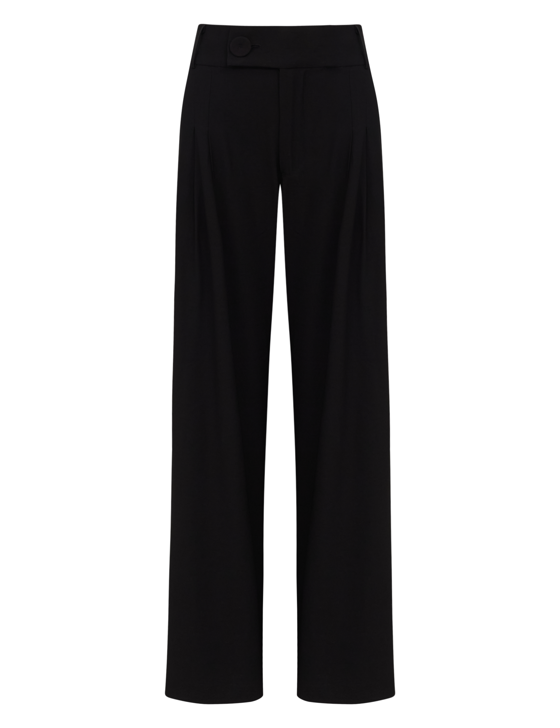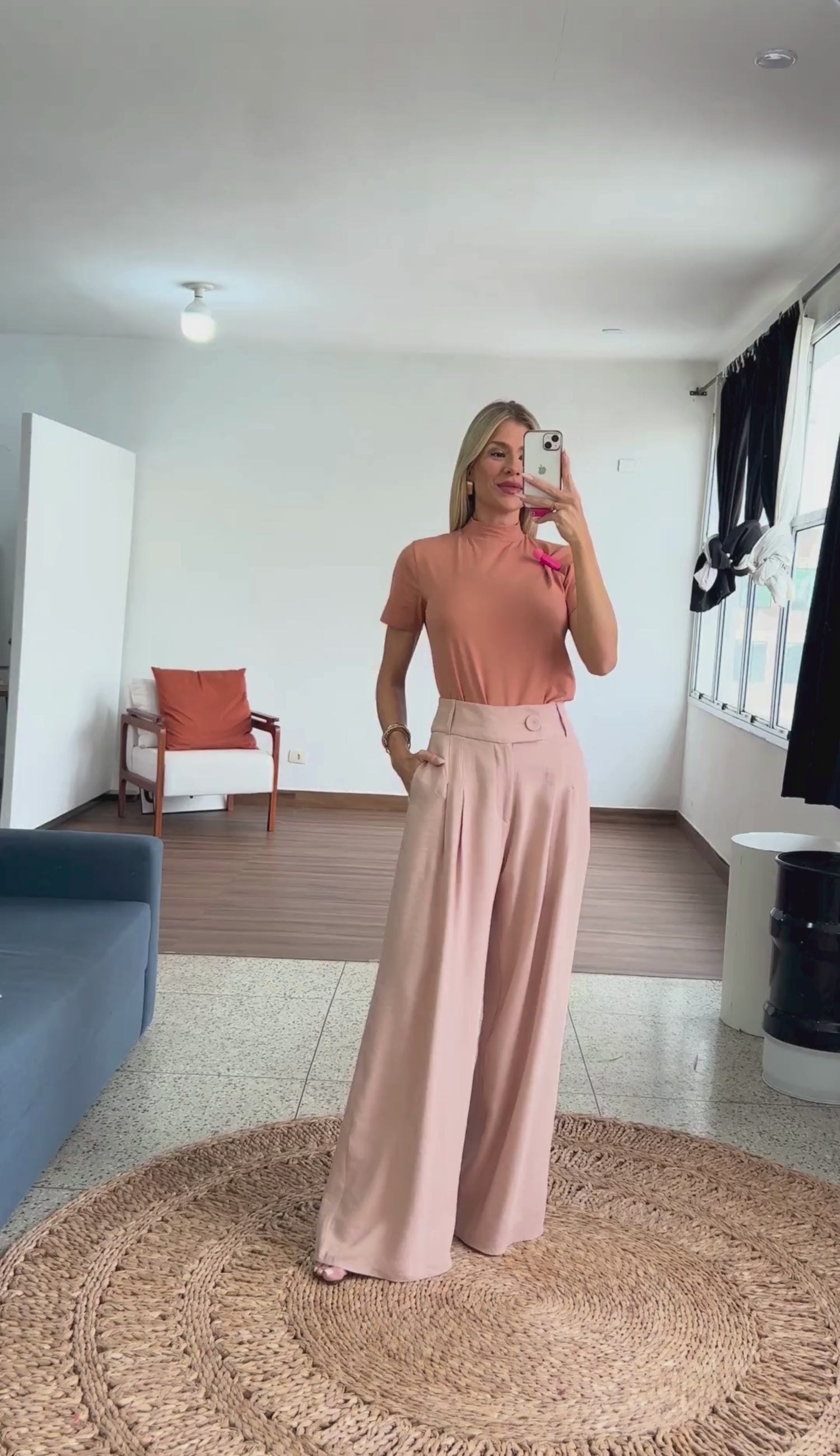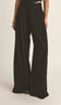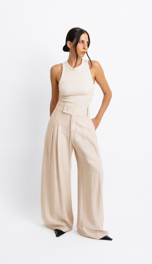 Calça pantalona com forro, confeccionada em alfaiataria de poliviscose com aspecto levemente amassadinho. Possui corte de alfaiataria com bolsos laterais, cós mais largo com passantes, pregas frontais e fechamento por zíper, botão forrado deslocado e botão interno.