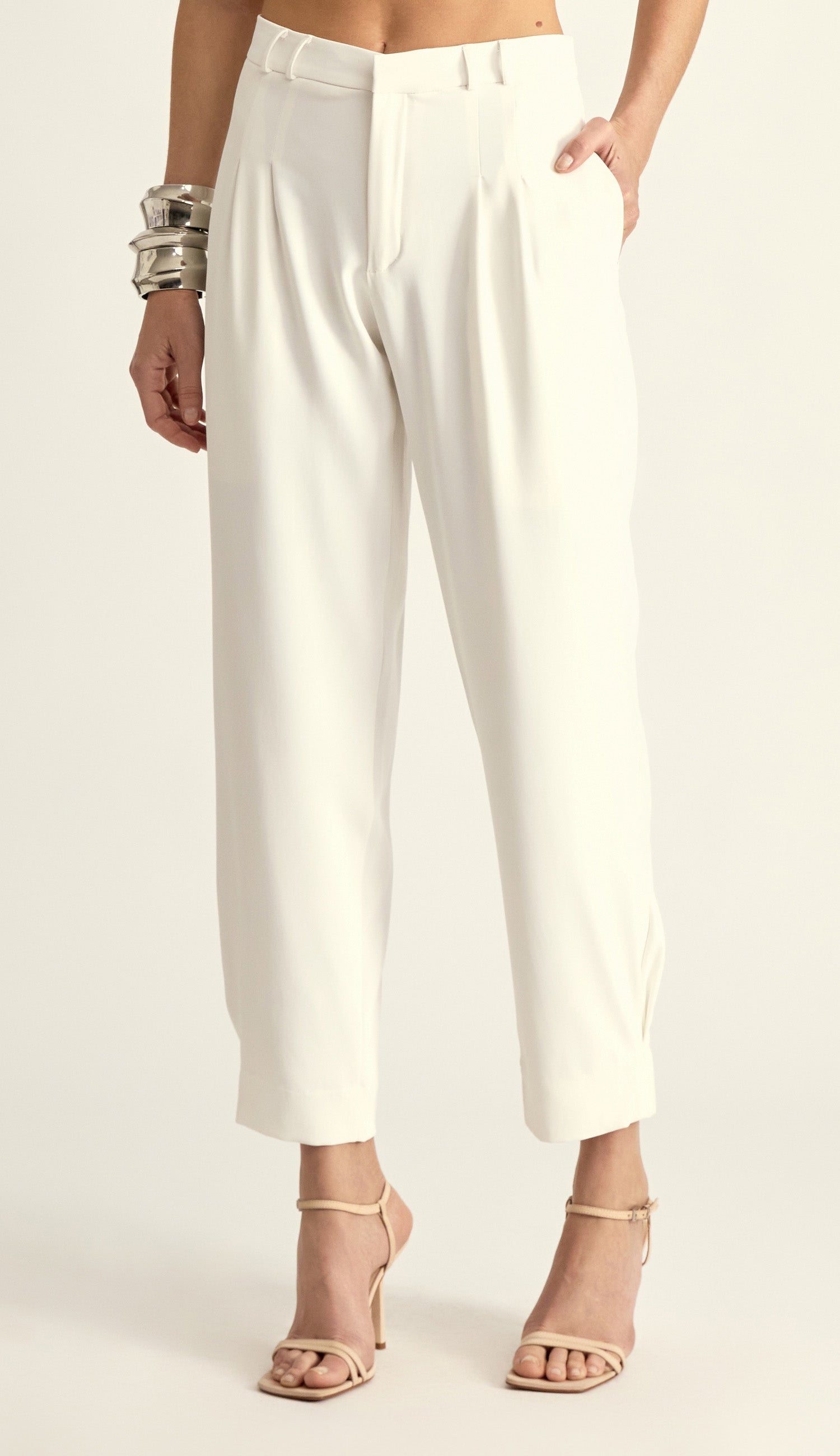 Calça carrot confeccionada em crepe de alfaiataria com forro na peça inteira. Possui passantes fininhos no cós, pregas, fechamento frontal não aparente por zíper e colchete de metal, bolsos faca laterais e traseiros embutidos e punhos ajustados com preguinha nas barras. A peça que une elegância e funcionalidade; oferece a versatilidade da alfaiataria perfeita para compor looks que vão do clássico ao moderno.