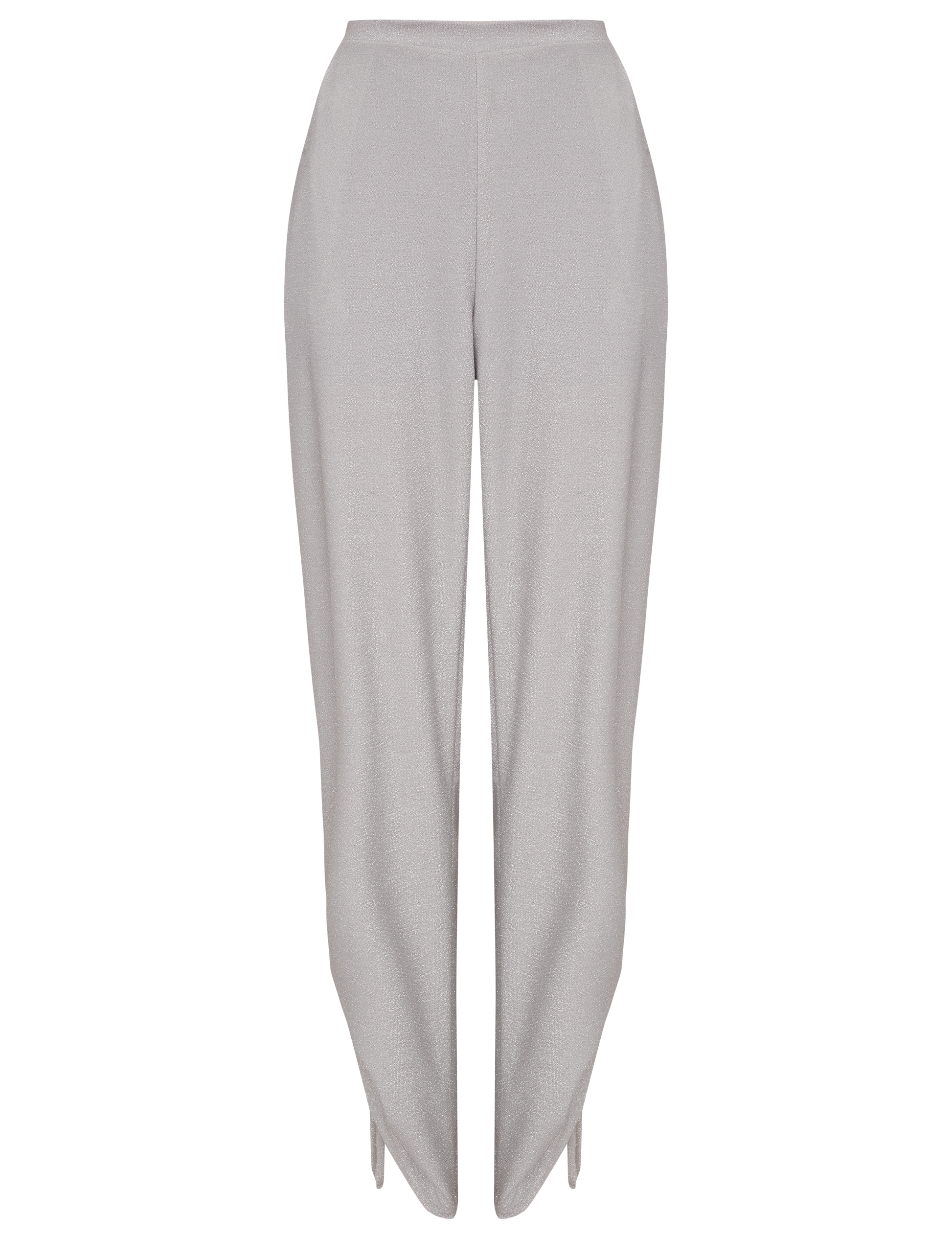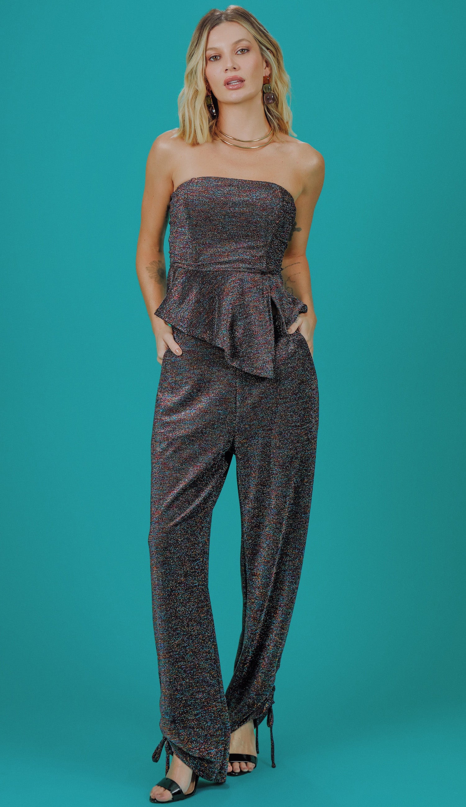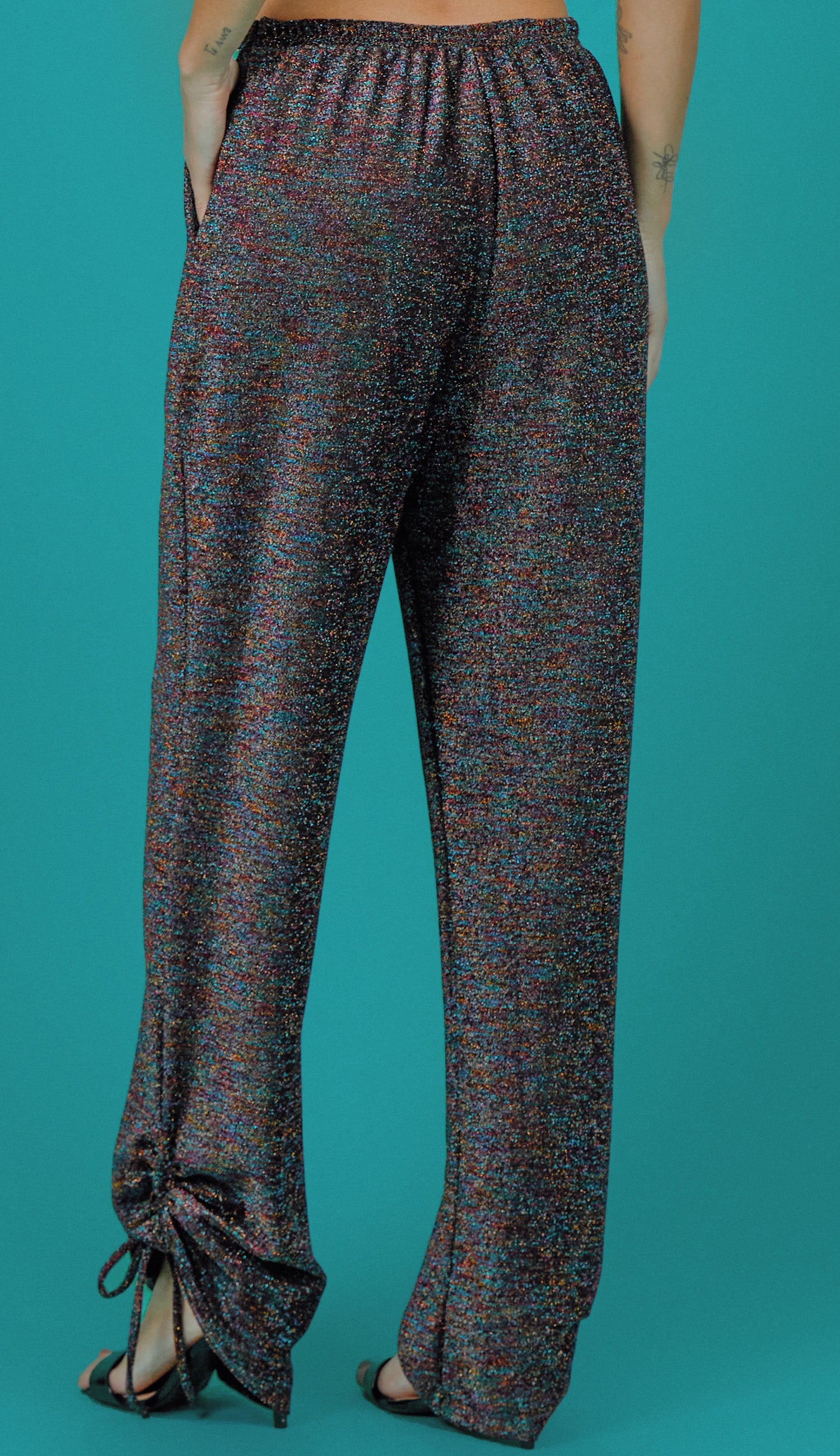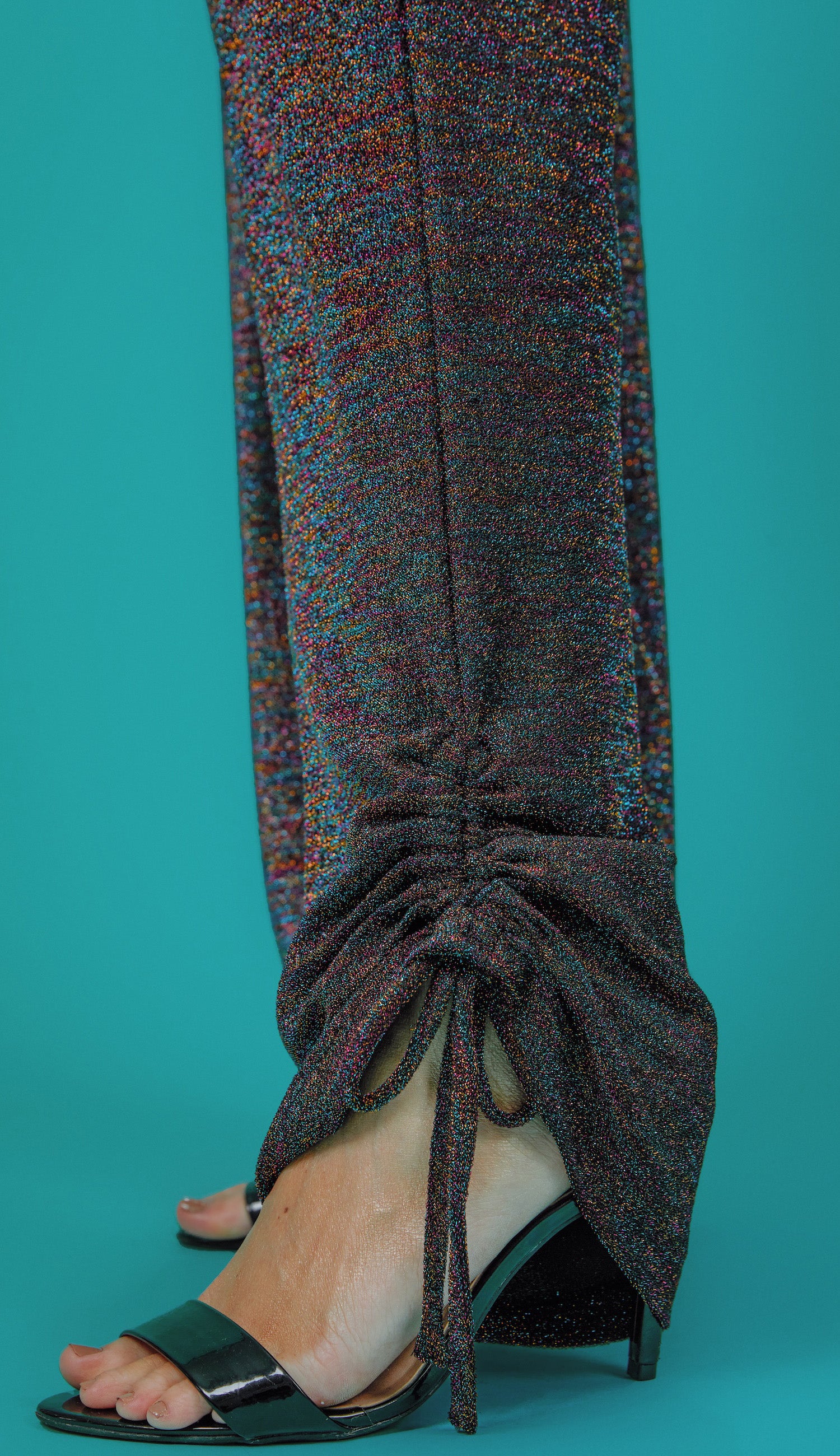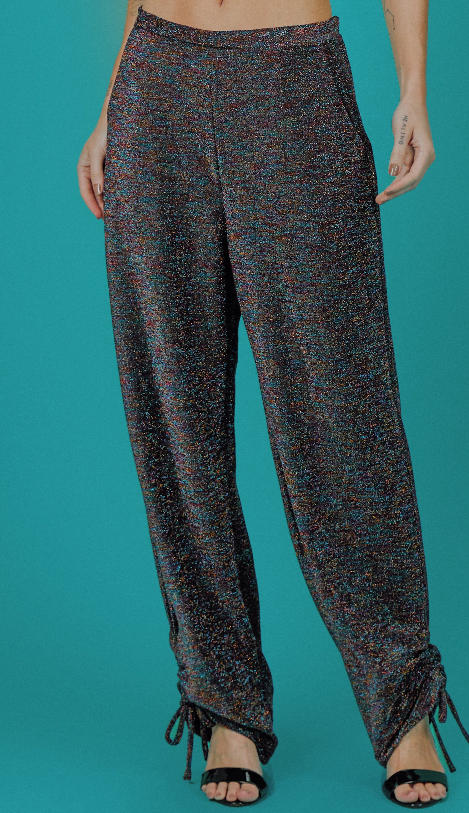 Calça confeccionada em malha de lurex com forro. Possui elástico no cós costas, bolsos laterais, fechamento lateral por zíper invisível e ajuste da barra por tirinhas embutidas para franzido e amarração.