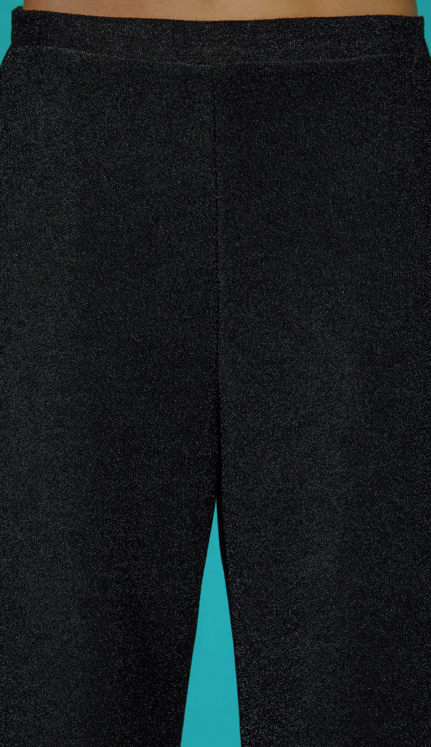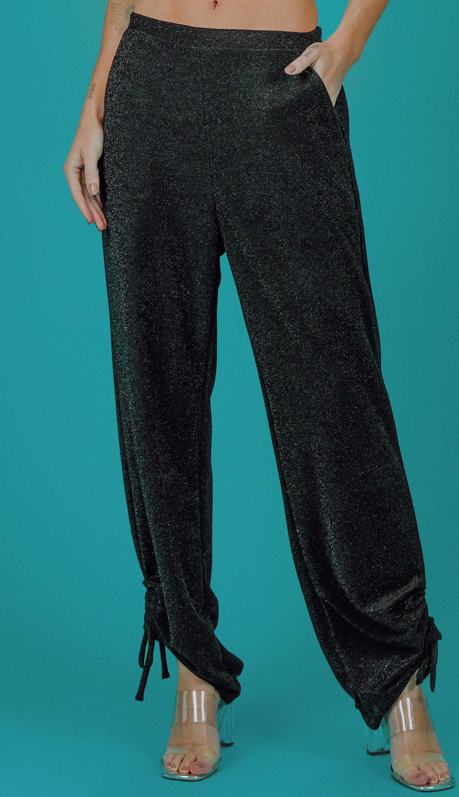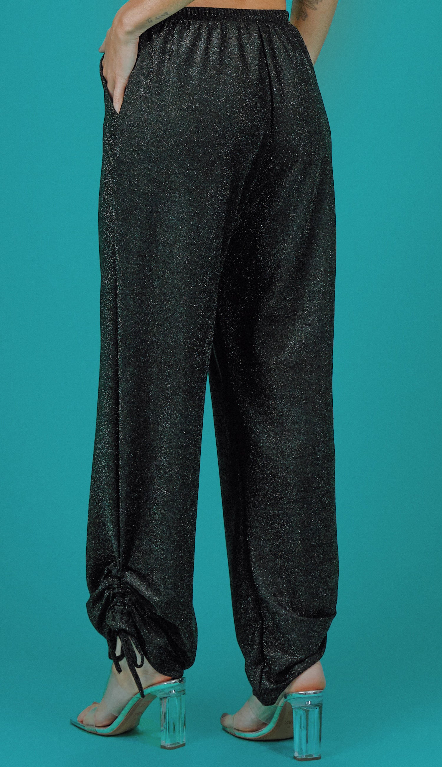 Calça confeccionada em malha de lurex com forro. Possui elástico no cós costas, bolsos laterais, fechamento lateral por zíper invisível e ajuste da barra por tirinhas embutidas para franzido e amarração.