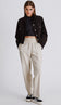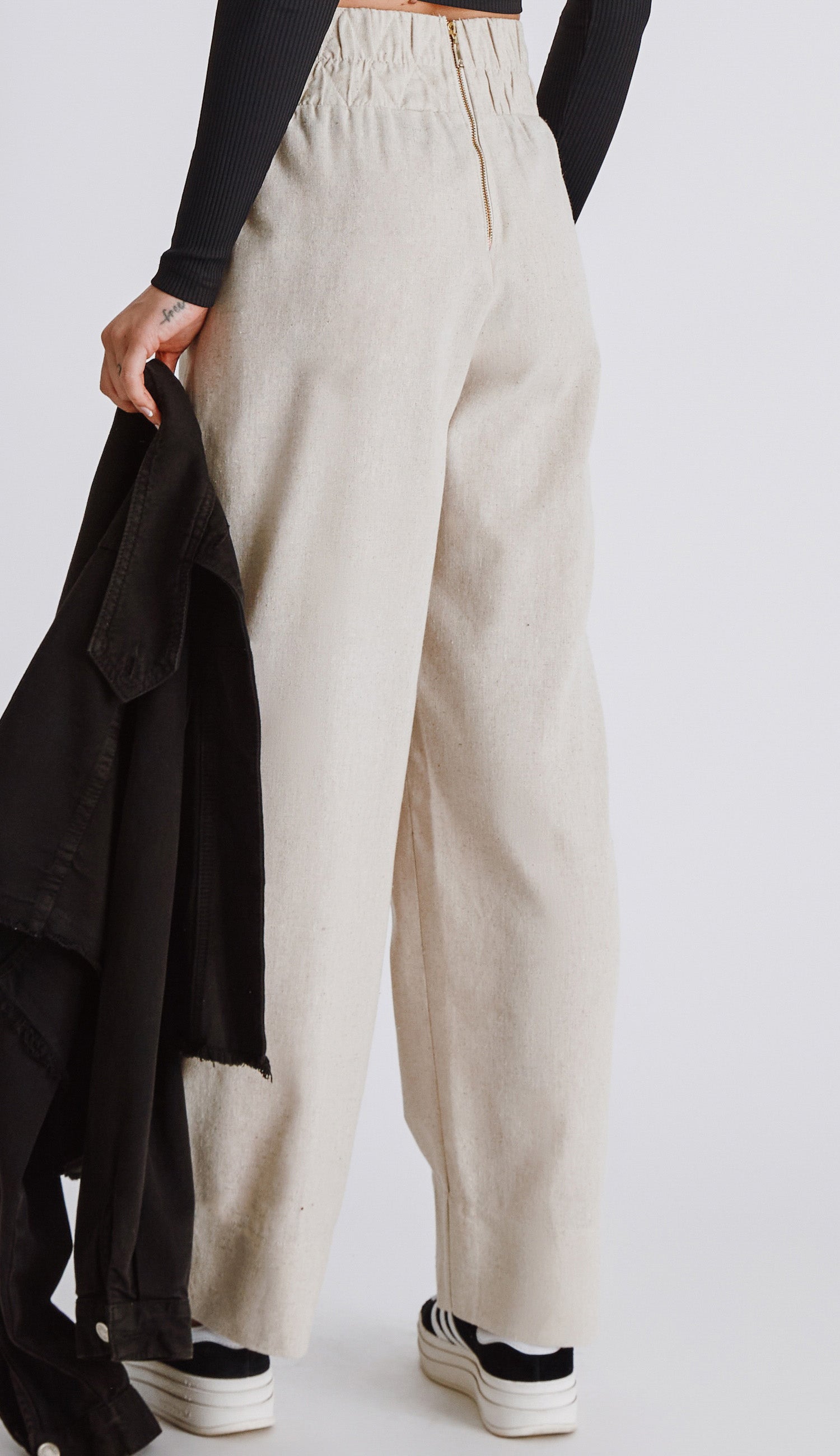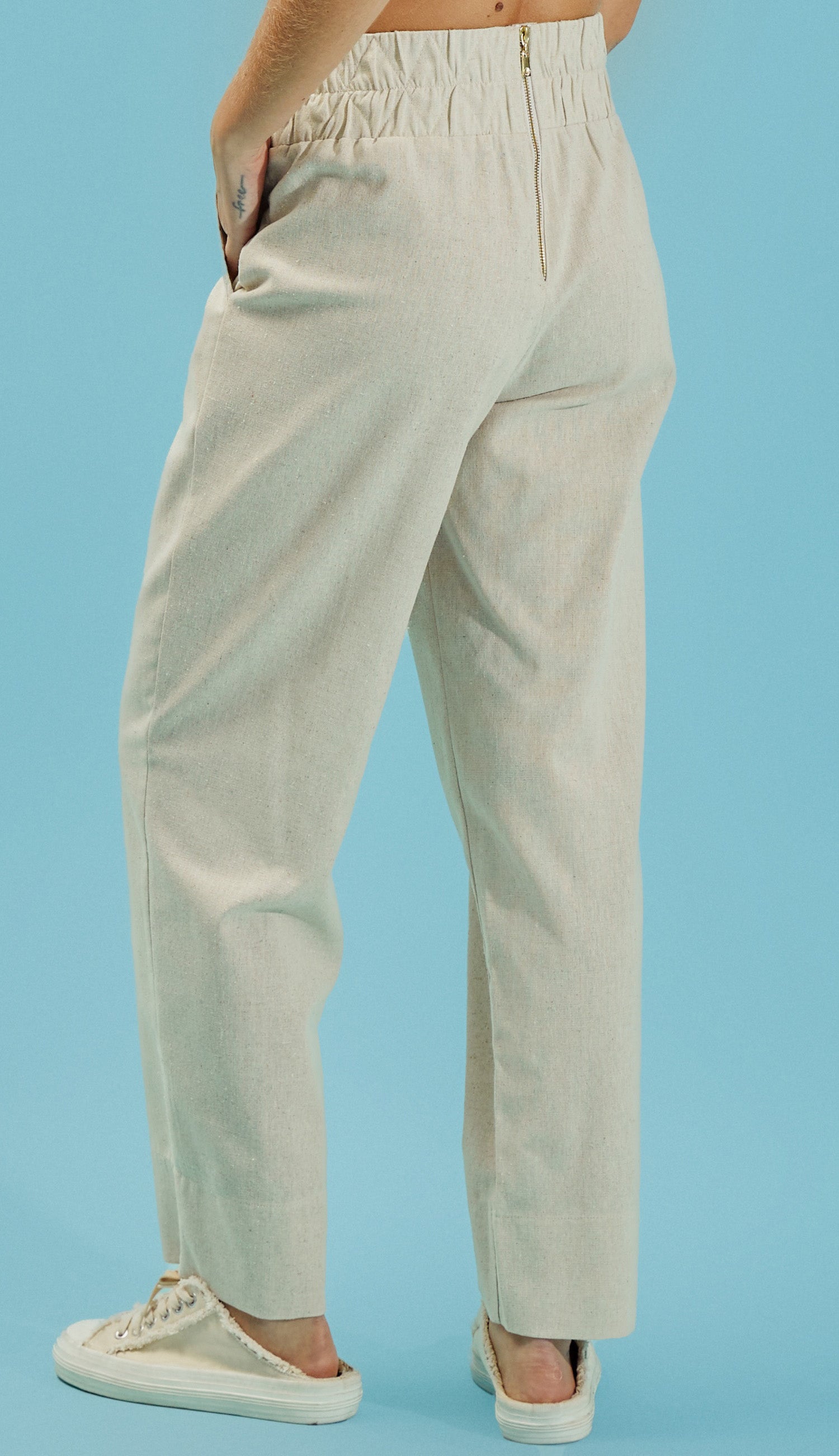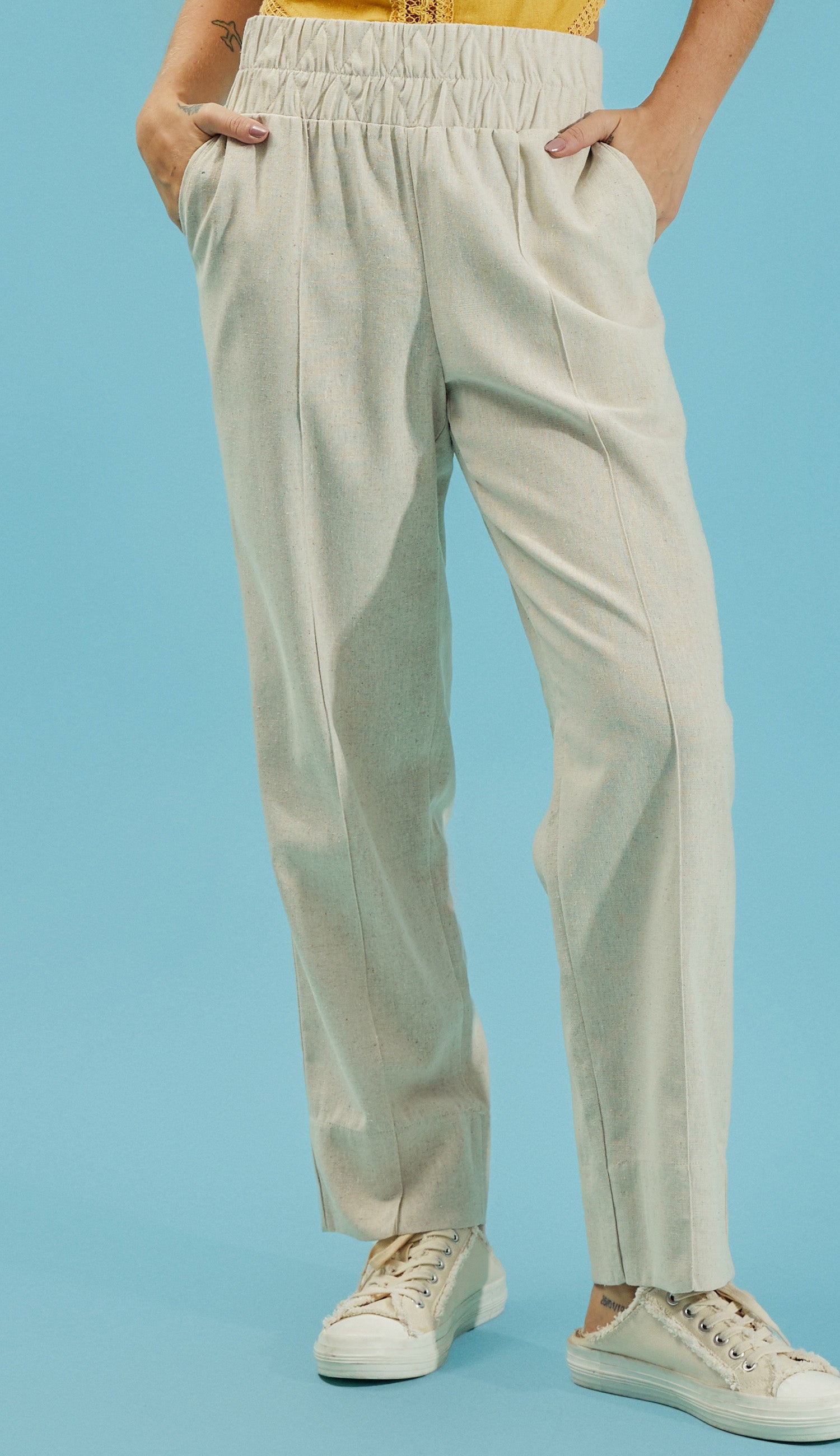 Calça confeccionada em linho. Possui cós largo com elástico franzido, vincos frontais, bolsos laterais, fendinha na lateral da barra e fechamento traseiro por zíper de metal.
