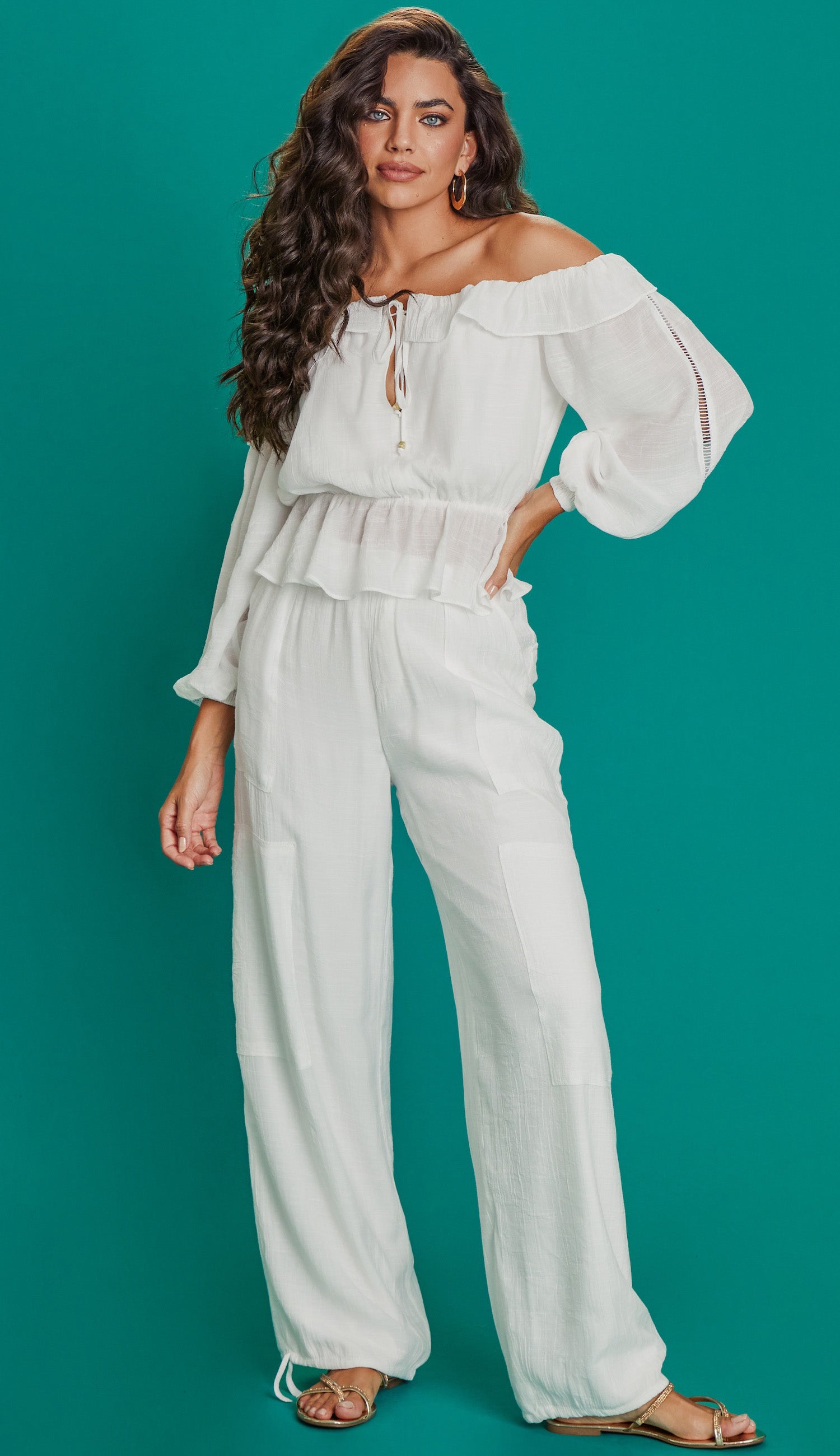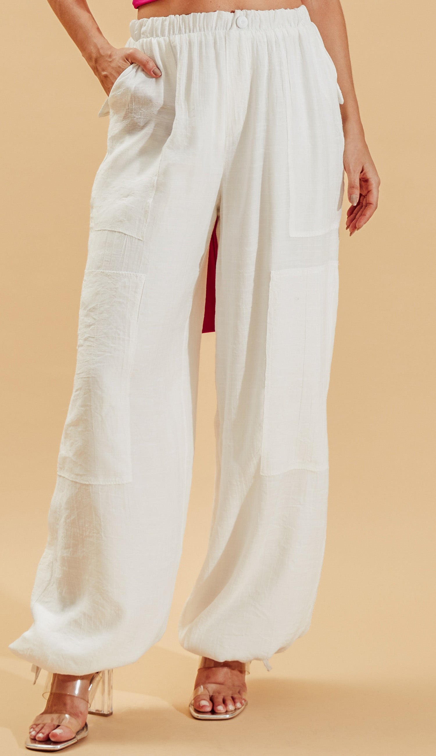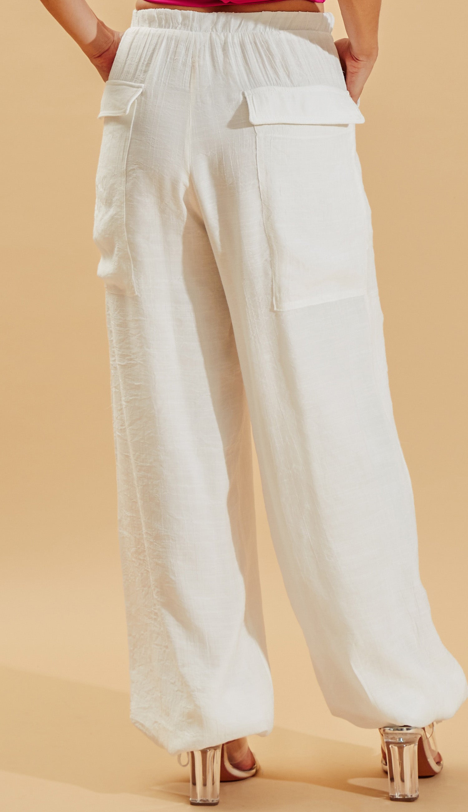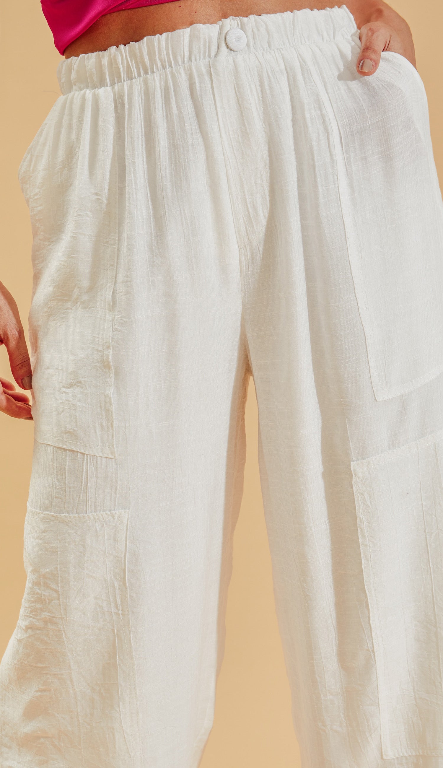 Calça jogger com forro inteiro, confeccionada em poliviscose texturizado com aspecto de linho e efeito amassadinho. Possui elástico no cós, botão forrado de enfeite, maxi bolsos laterais e maxi bolsos traseiros com lapela, recortes na perna parecendo "retalho" e ajuste da barra com tirinha embutida para amarração.