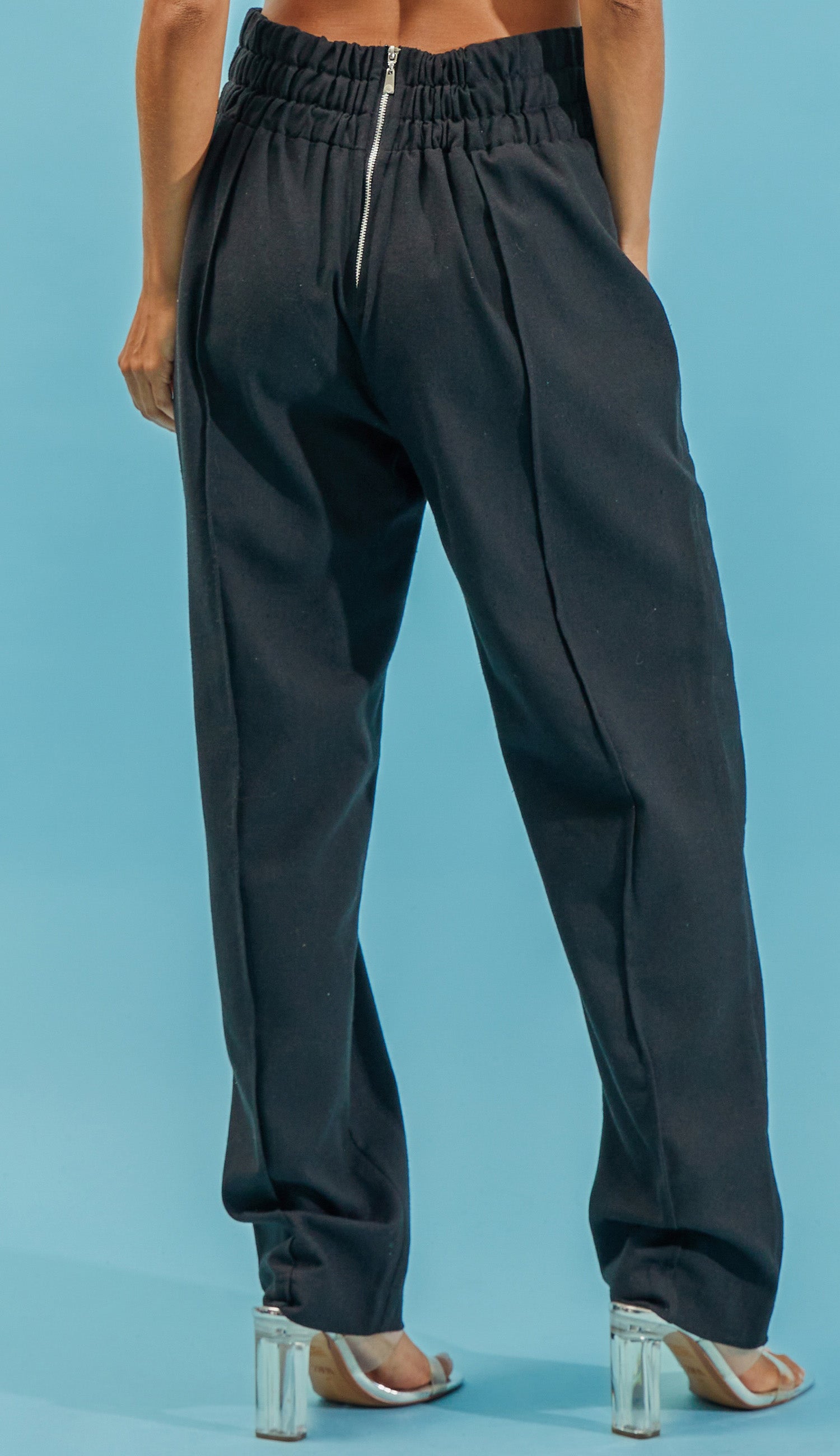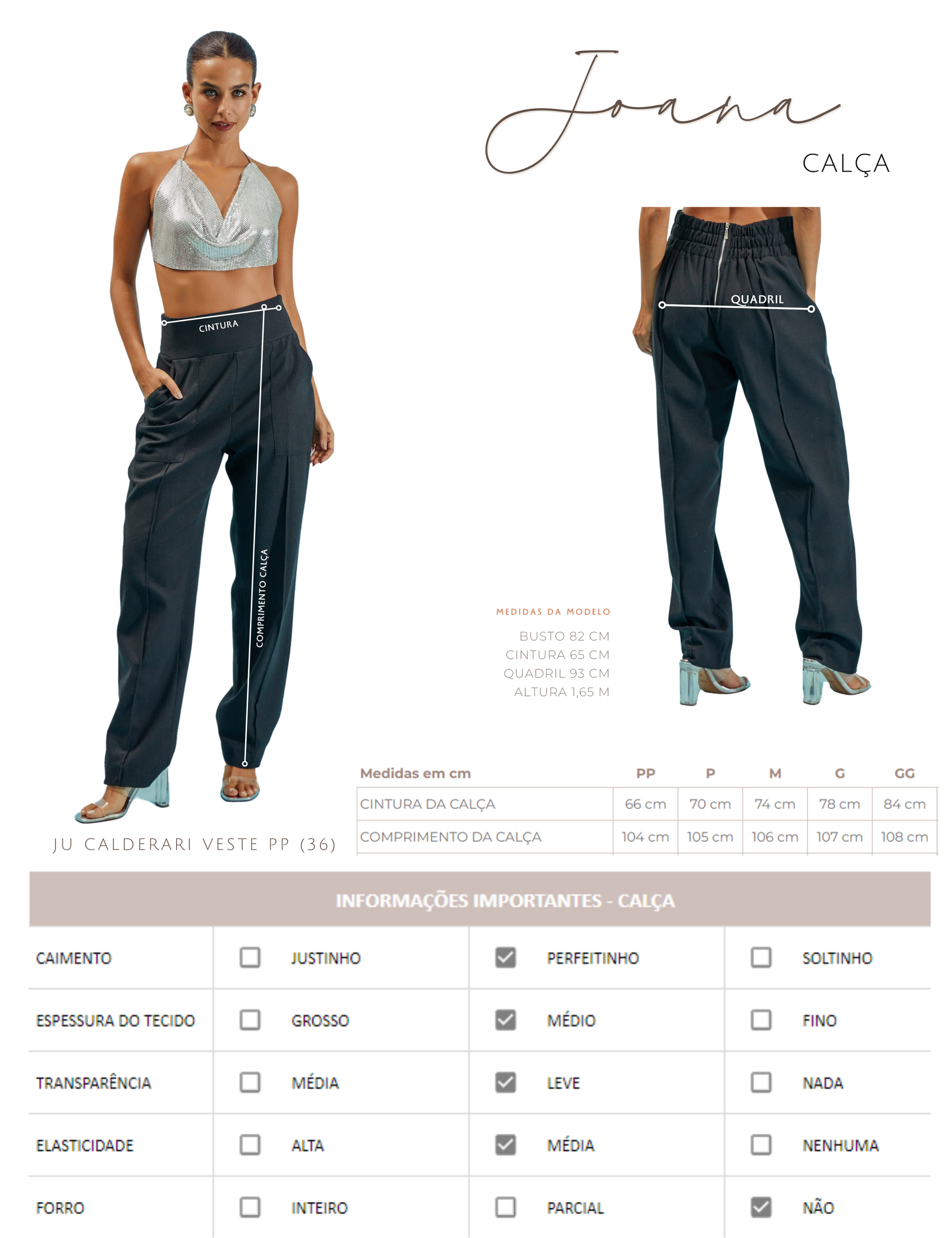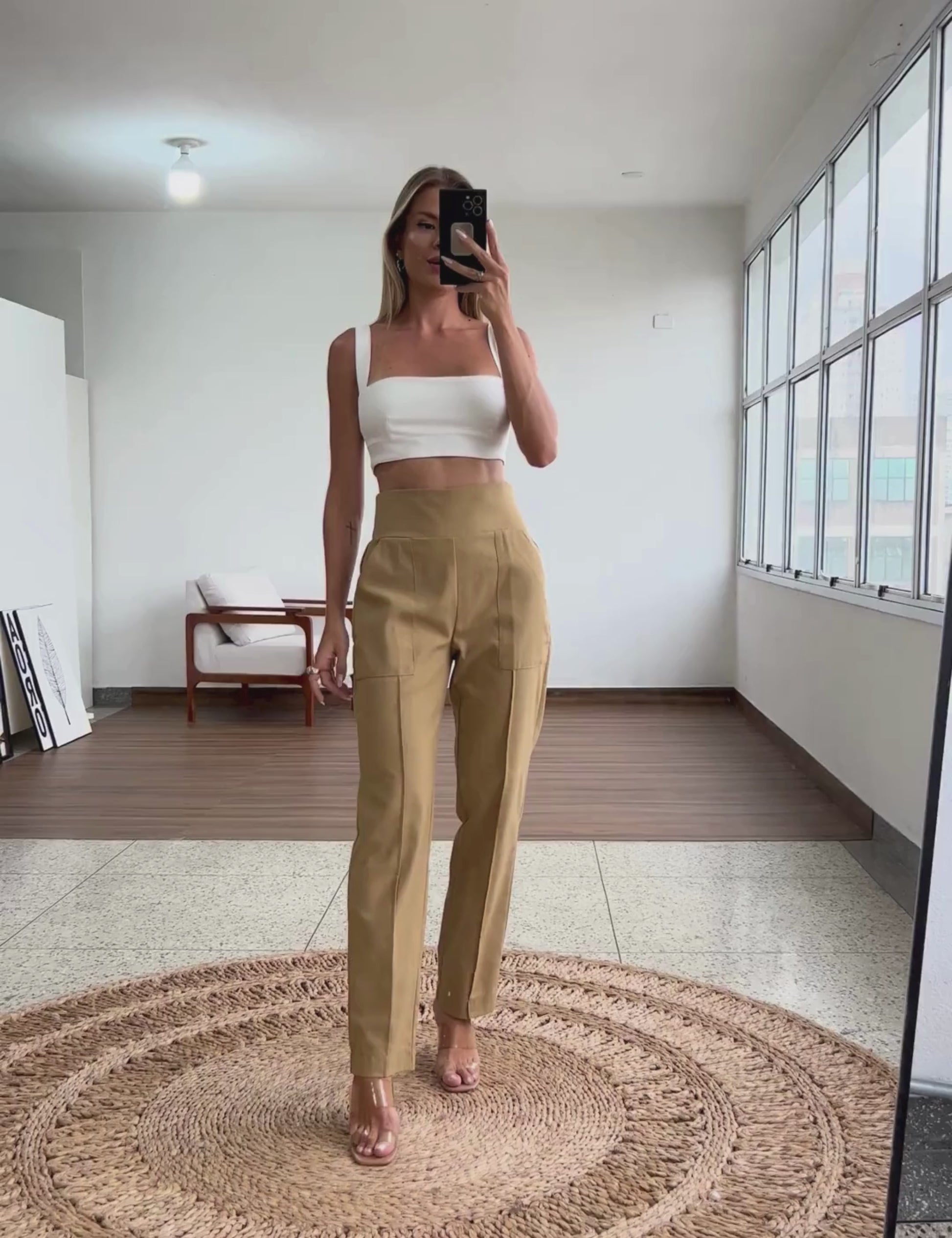 Calça confeccionada em linho. Possui modelagem ajustada de alfaiataria, cós largo, bolsos laterais, vincos frontais, elástico largo franzido no cós costas e fechamento traseiro por zíper de metal com pingente que possui o delicado detalhe da conchinha da Laguna gravado, o que dá um charme todo especial à peça.