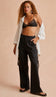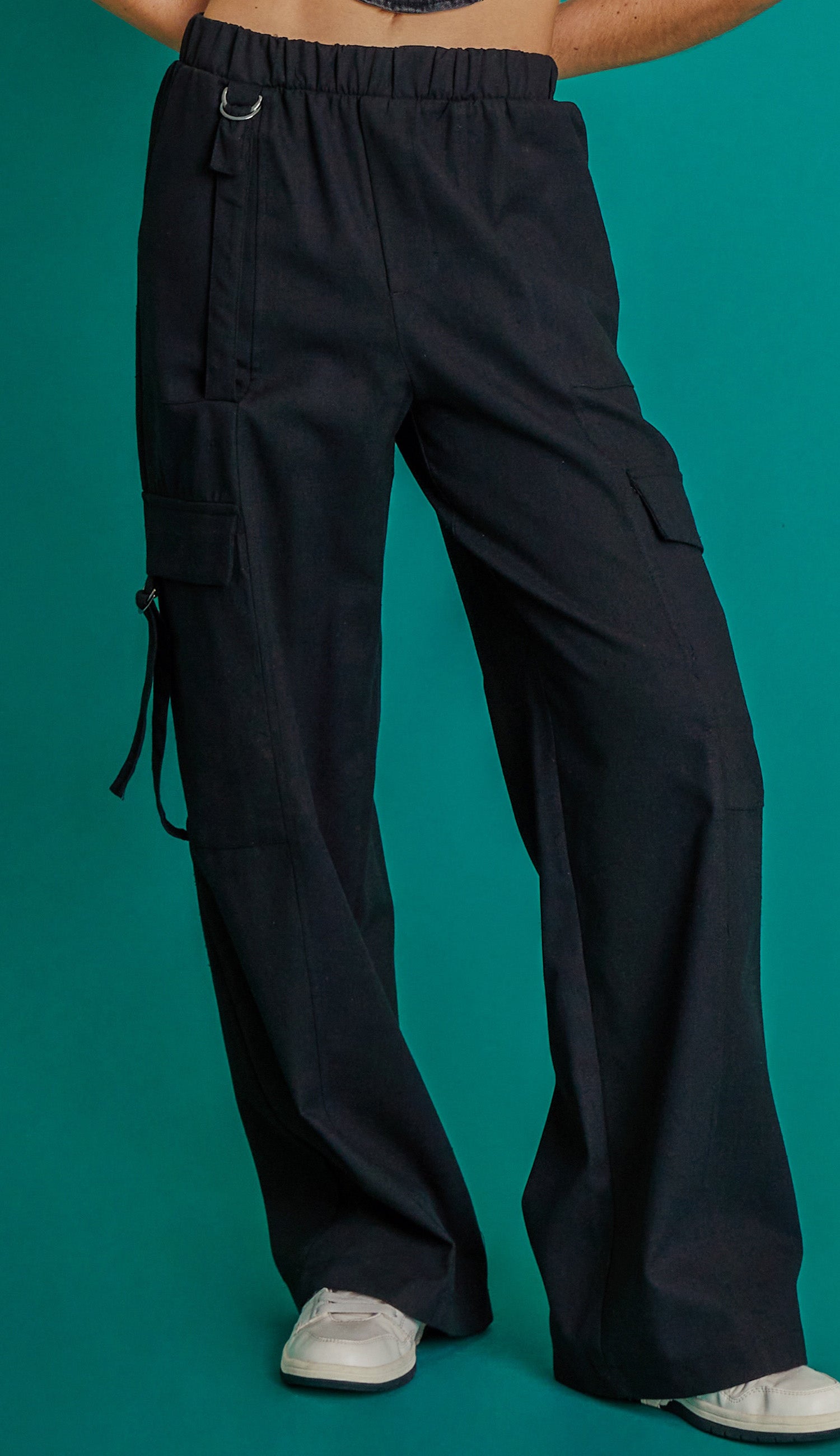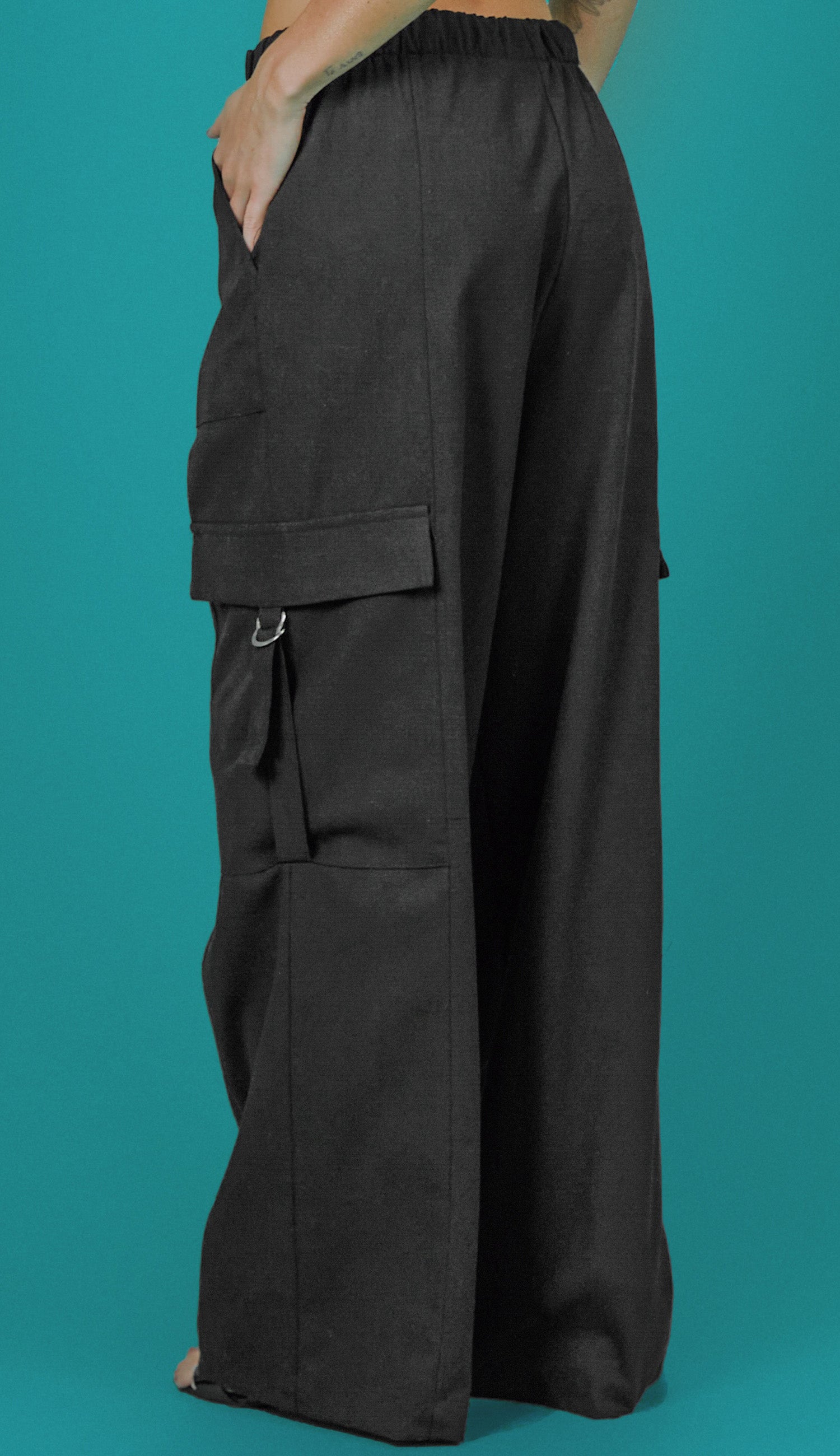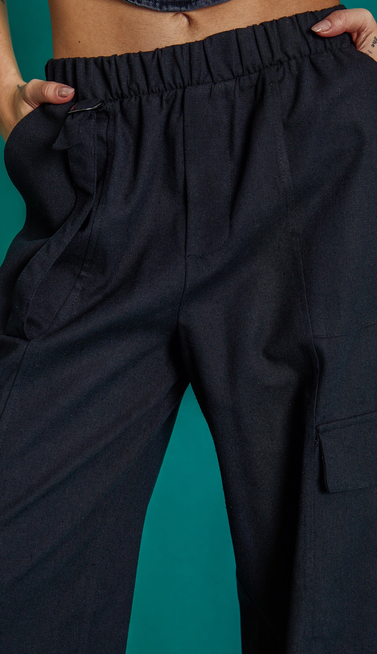 Calça wide confeccionada em linho. Possui elástico franzido no cós, bolsos laterais aplicados com detalhe de tirinha e argolas meia lua de metal em uma das laterais, recortes frontais, maxi bolsos nas pernas no estilo cargo, com lapela dobrada e fechamento por tirinha e argolas meia lua de metal.