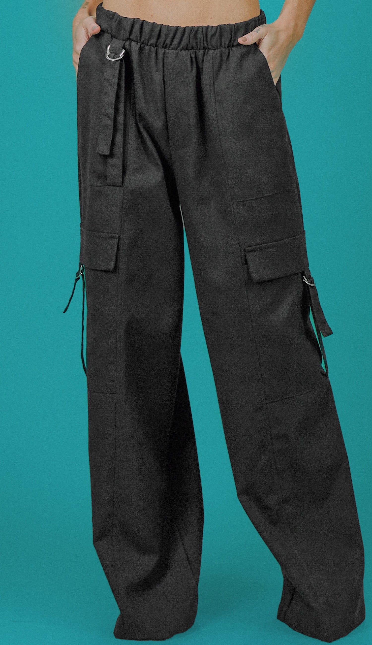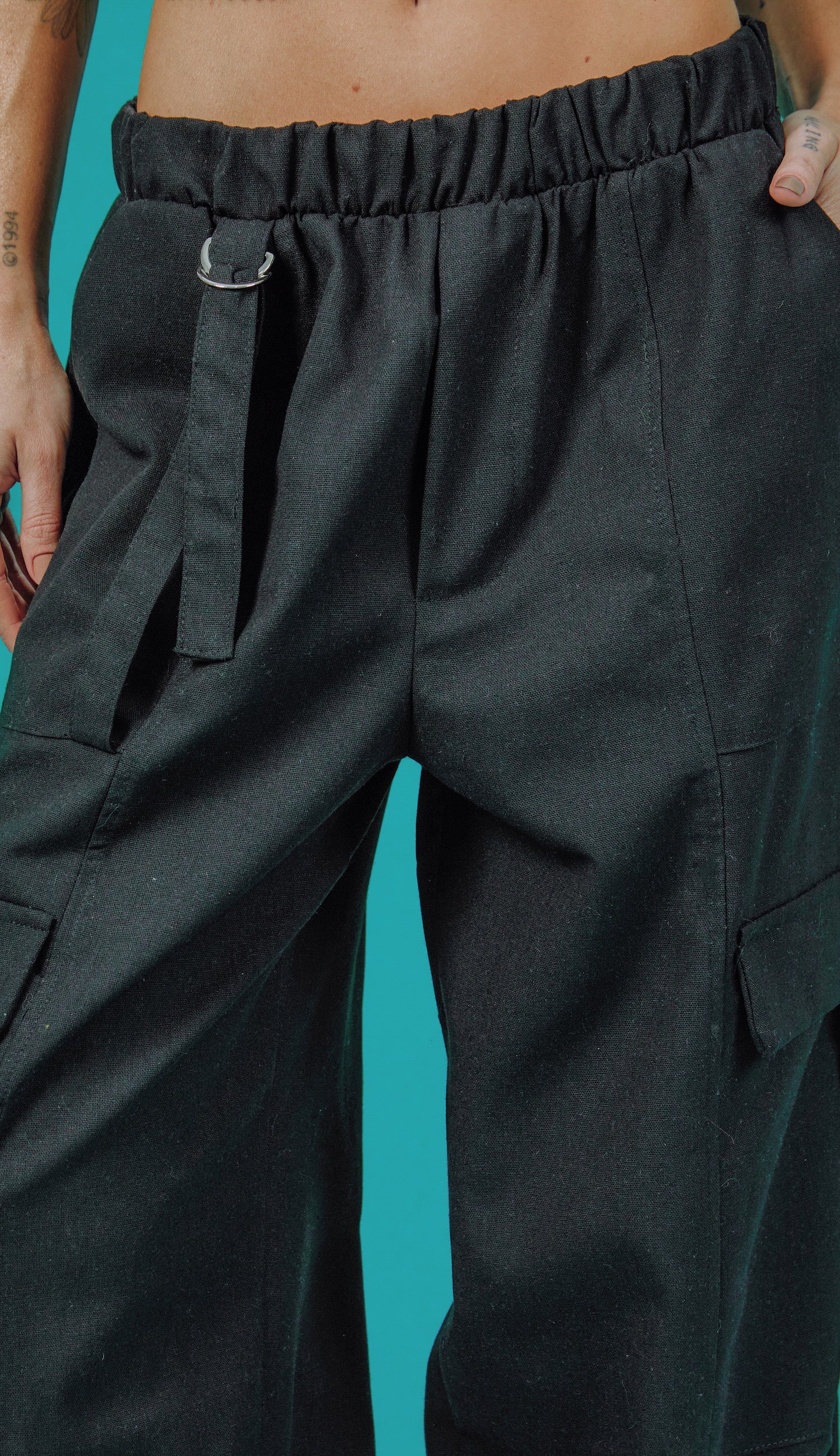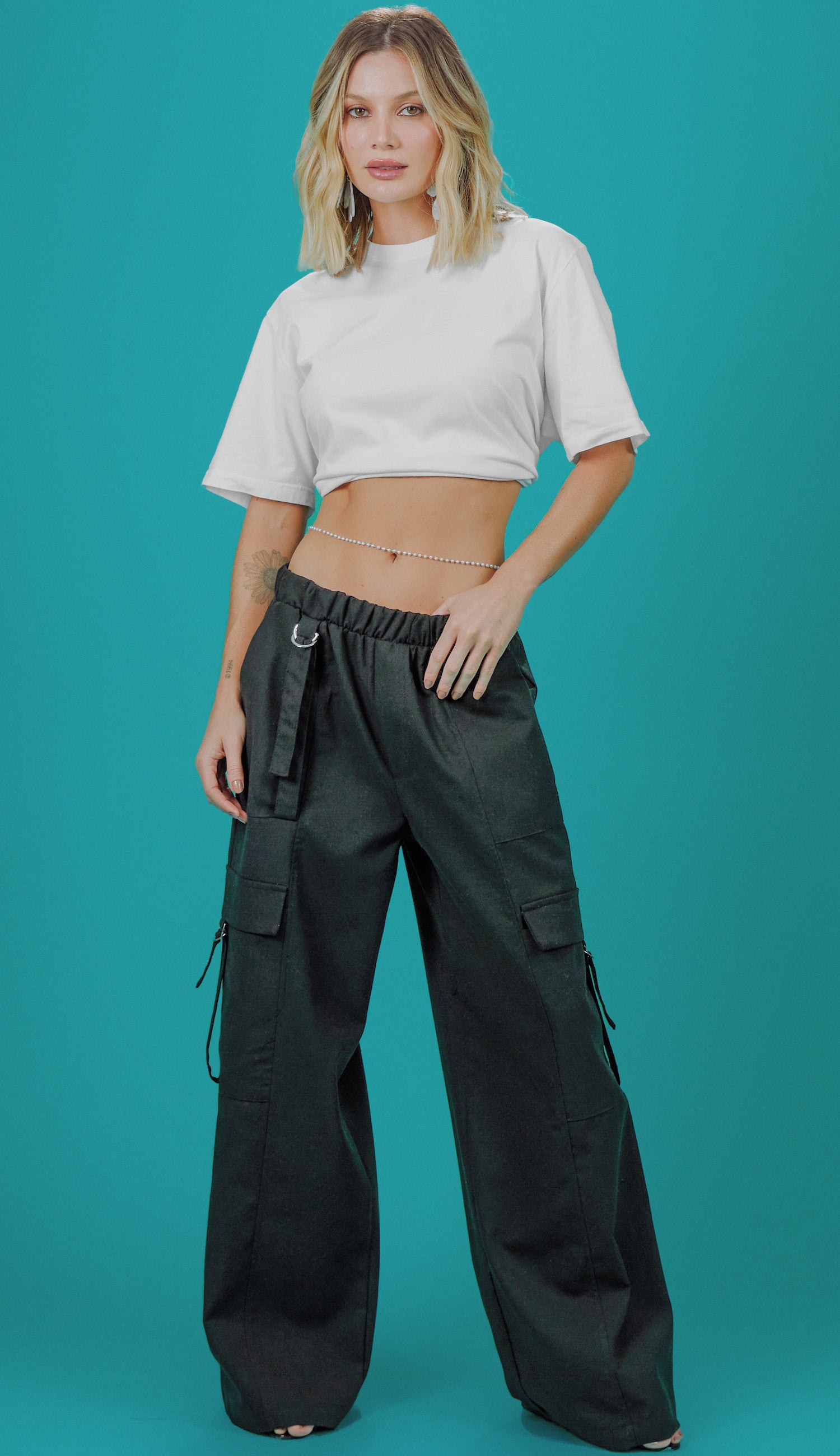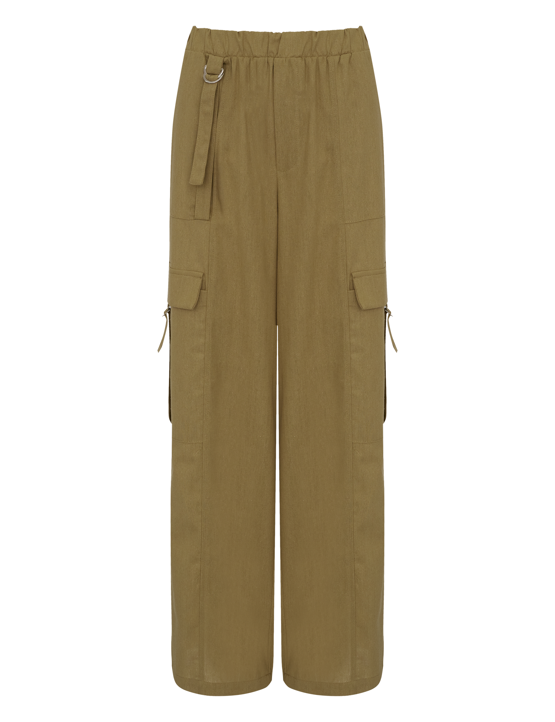 Calça wide confeccionada em linho. Possui elástico franzido no cós, bolsos laterais aplicados com detalhe de tirinha e argolas meia lua de metal em uma das laterais, recortes frontais, maxi bolsos nas pernas no estilo cargo, com lapela dobrada e fechamento por tirinha e argolas meia lua de metal.