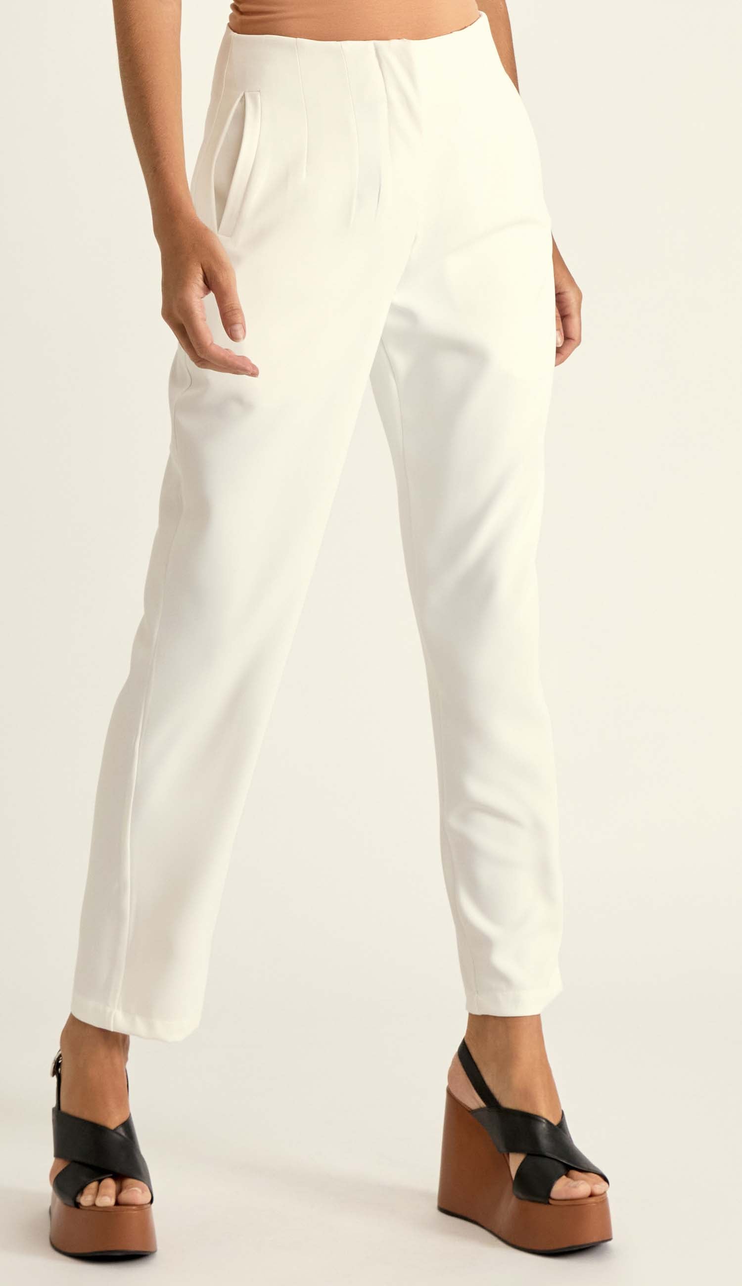 Calça carrot em alfaiataria. Possui cintura alta com pregas frontais que desenham a silhueta; bolsos laterais embutidos e fechamento frontal por zíper não aparente.
