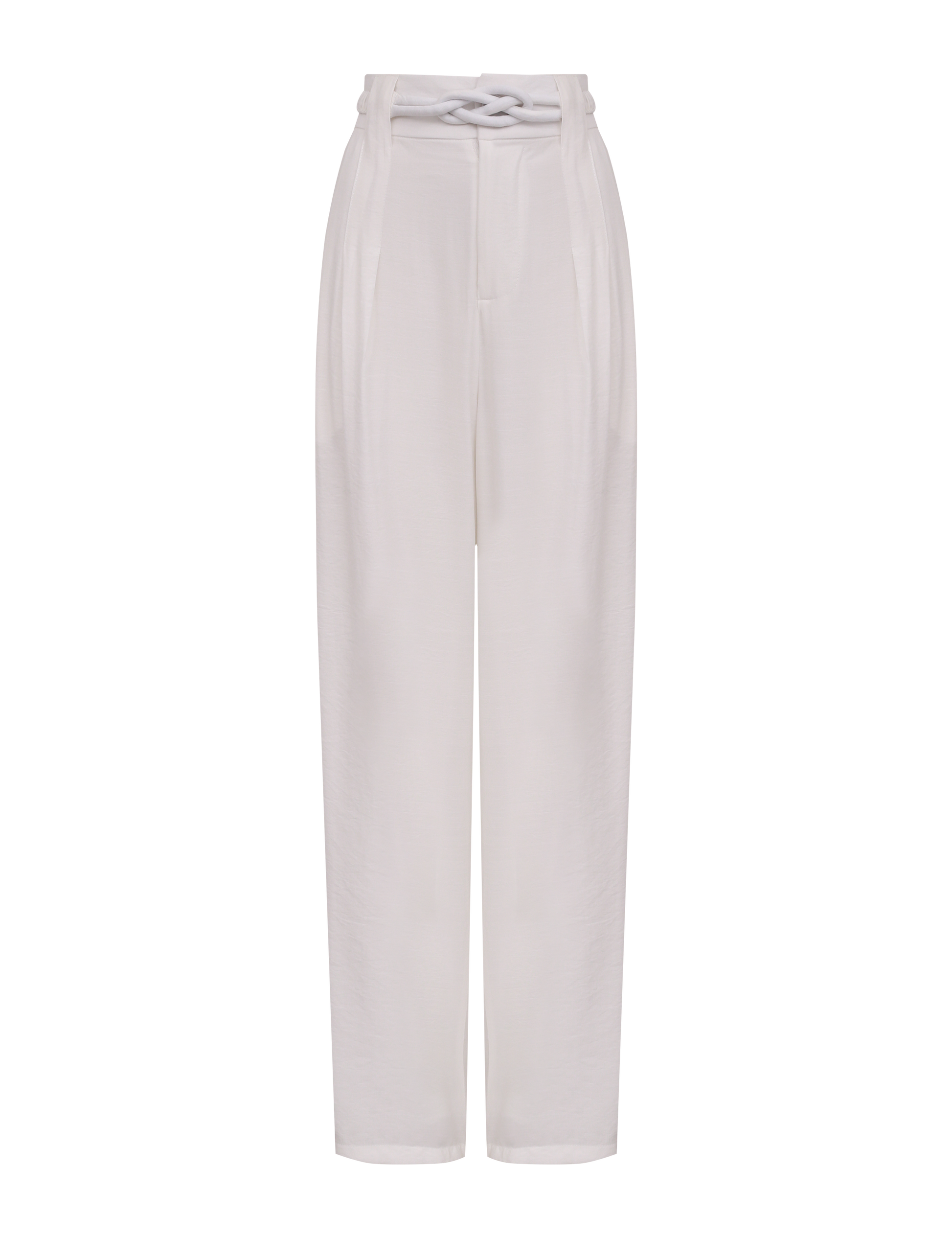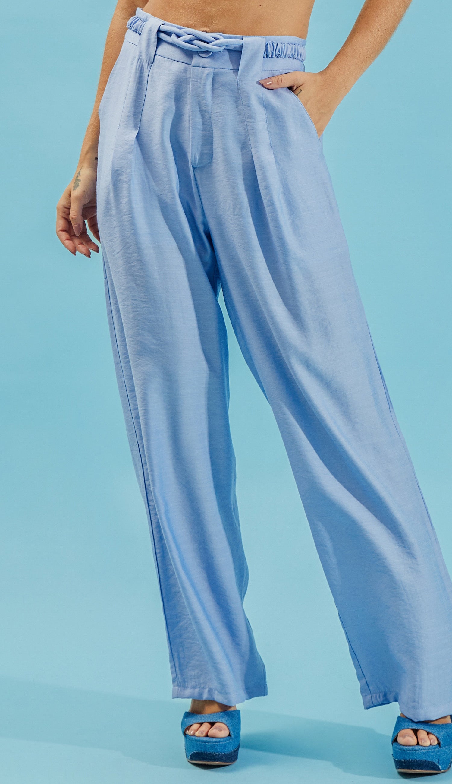 Calça wide com forro, confeccionada em poliviscose com aspecto de liocel, aparência amassadinha e efeito levemente cintilante no tecido. Possui fechamento frontal por zíper e botão forrado, passantes no cós, pregas frontais, bolsos faca laterais, maxi bolsos traseiros e acompanha cinto no mesmo tecido com elástico franzido, detalhe de cordão forrado em nó e fechamento do cinto por botão esmaltado. O aspecto de 'tecido nobre' dá um ar sofisticado ao look.