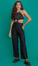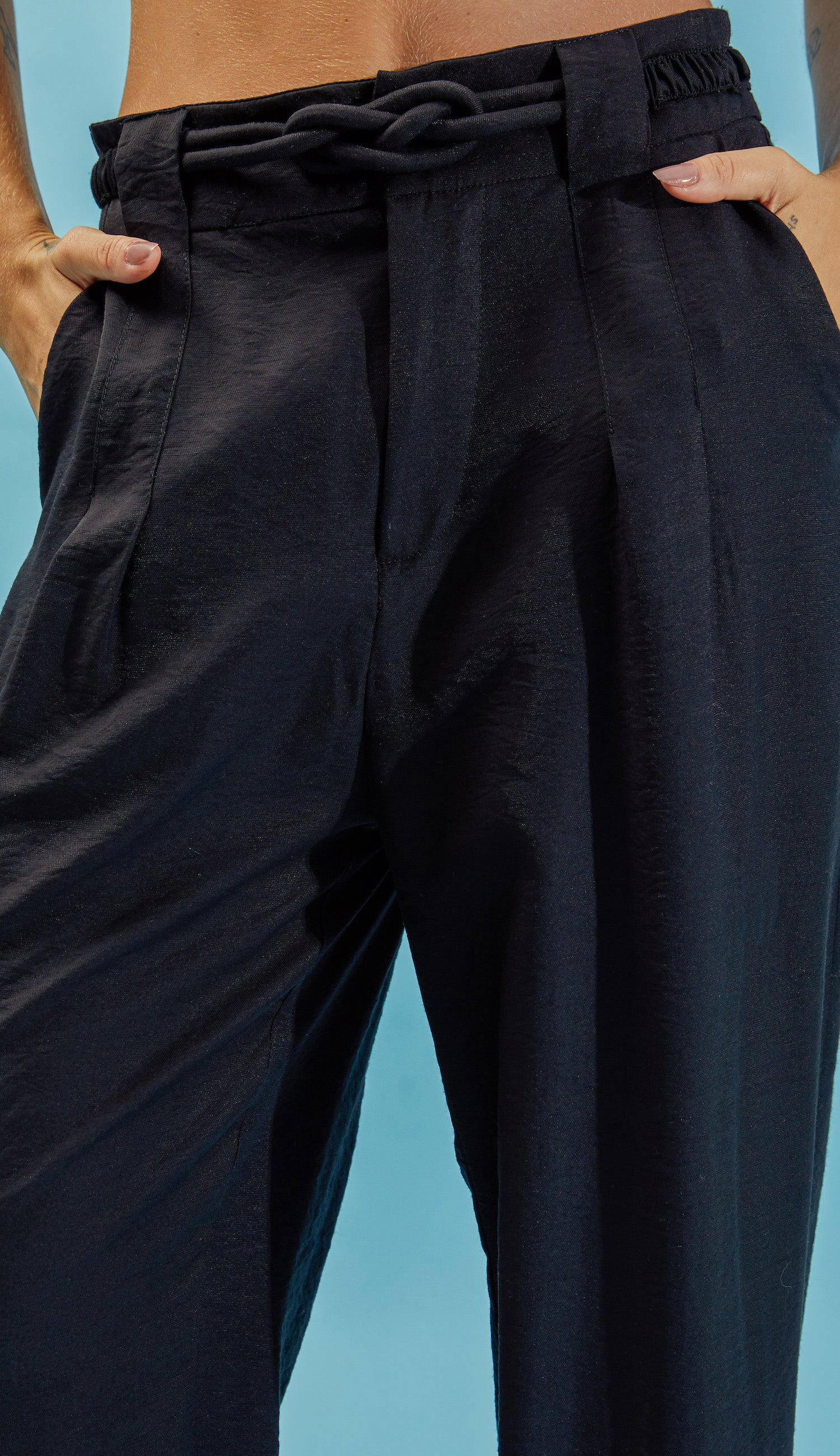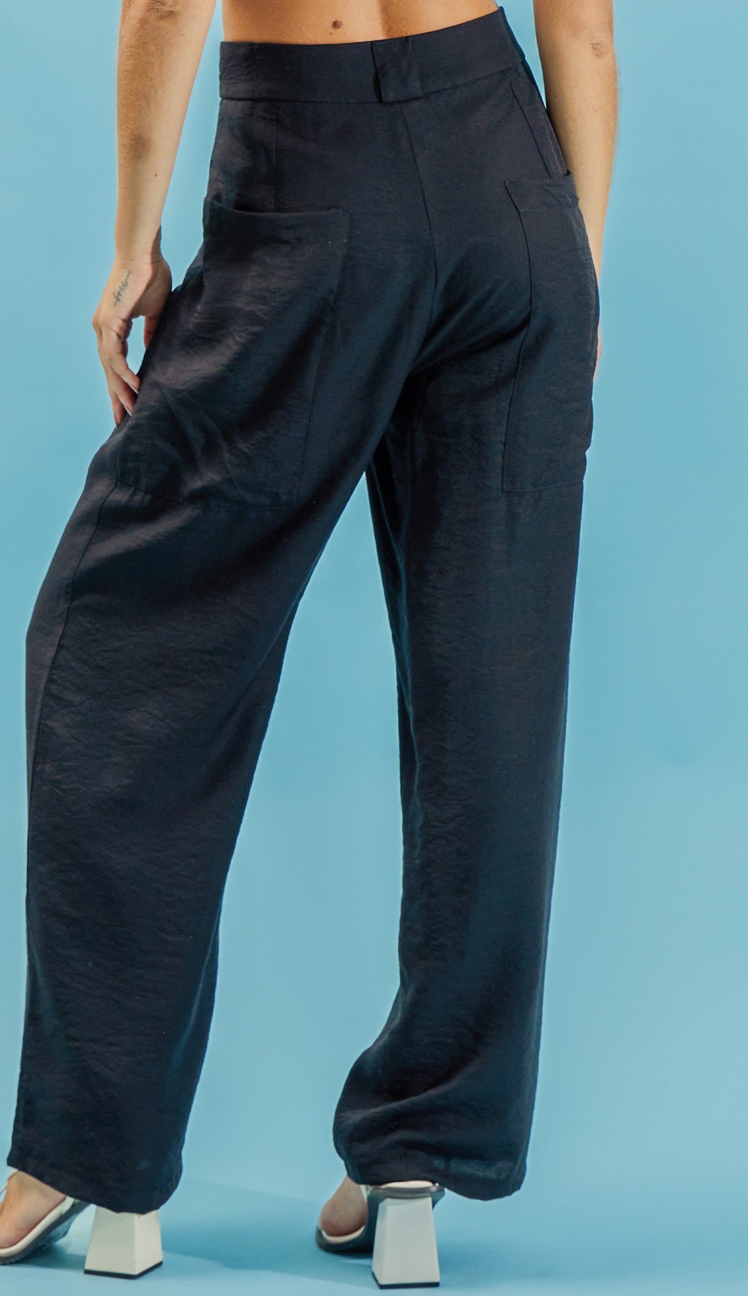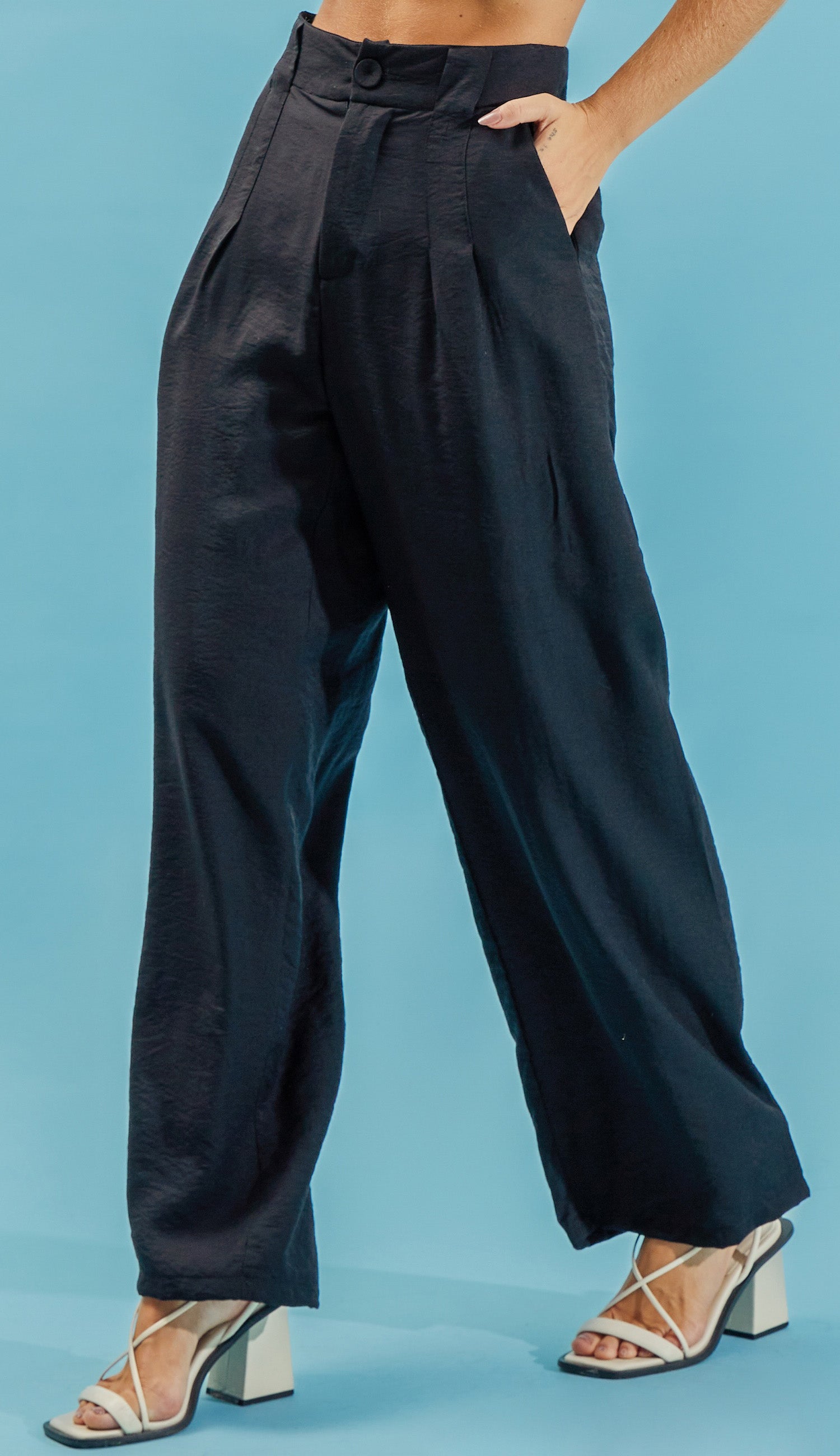 Calça wide com forro, confeccionada em poliviscose com aspecto de liocel, aparência amassadinha e efeito levemente cintilante no tecido. Possui fechamento frontal por zíper e botão forrado, passantes no cós, pregas frontais, bolsos faca laterais, maxi bolsos traseiros e acompanha cinto no mesmo tecido com elástico franzido, detalhe de cordão forrado em nó e fechamento do cinto por botão esmaltado. O aspecto de 'tecido nobre' dá um ar sofisticado ao look.