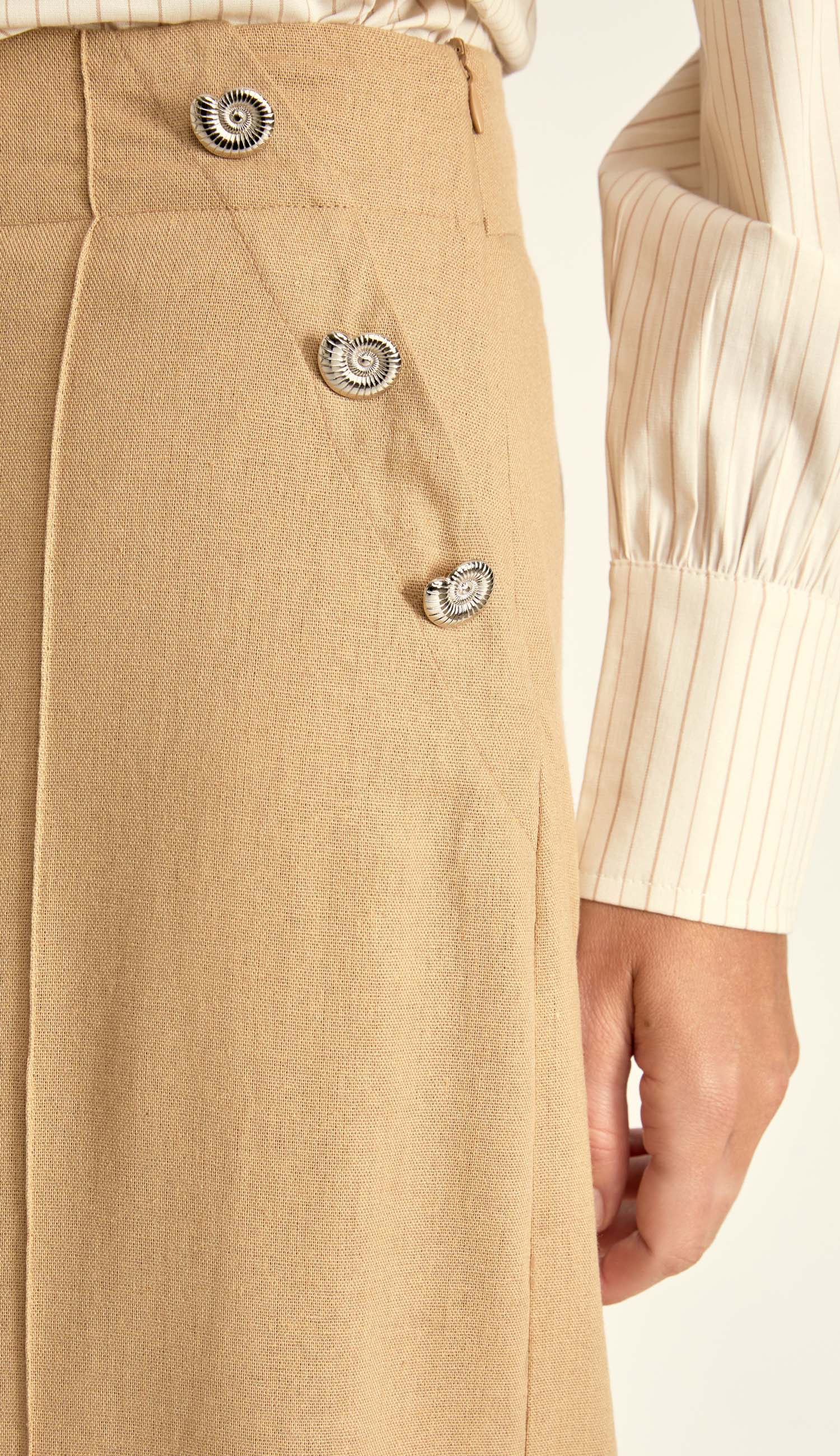 Calça wide confeccionada em linho com forro. Possui cintura ajustada e pernas soltinhas, detalhe de vincos frontais que alongam a silhueta, recortes laterais como bolsos falsos com detalhe de pingentes de metal em formato de conchinhas, bolso embutido traseiro e fechamento lateral por zíper invisível.