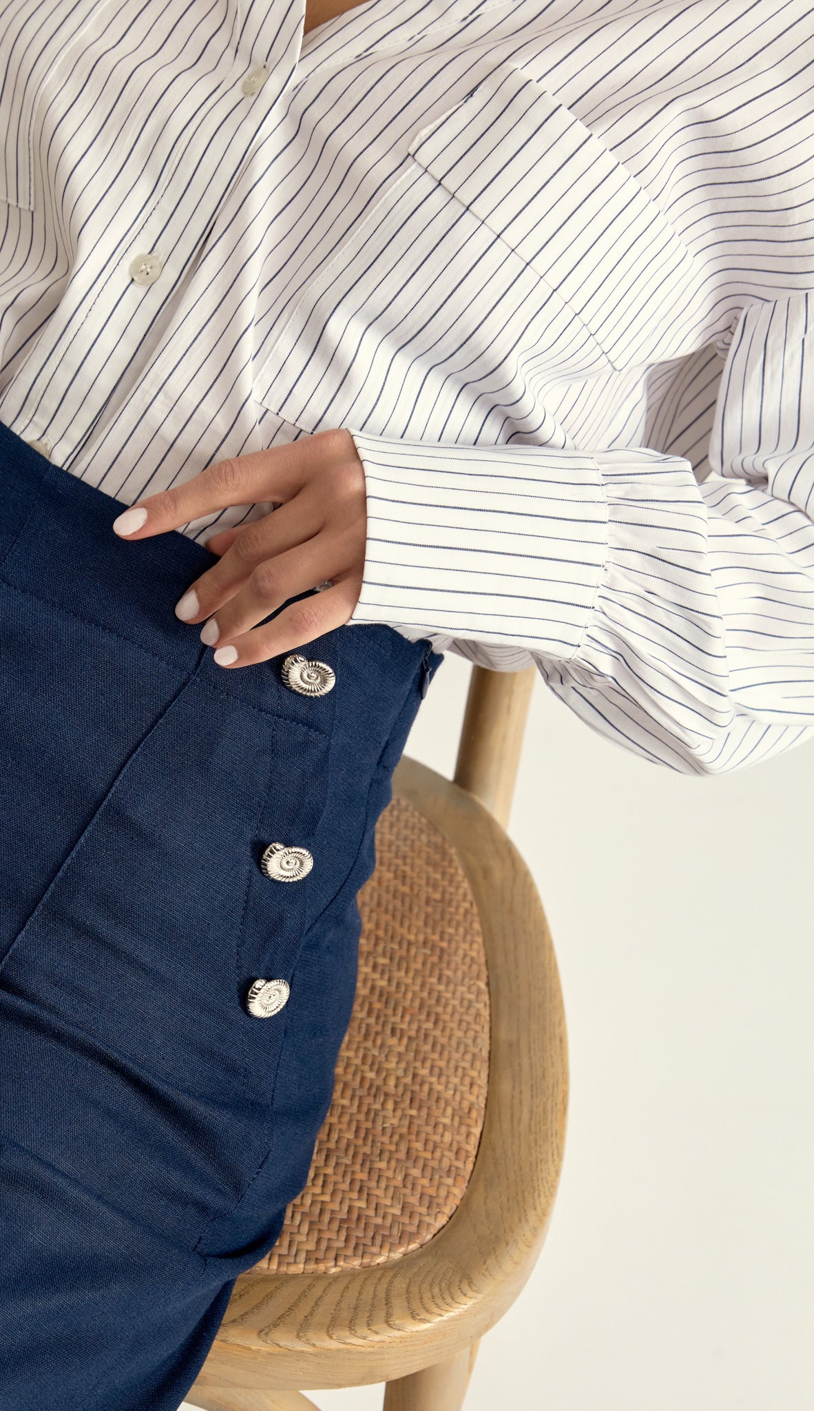 Calça wide confeccionada em linho com forro. Possui cintura ajustada e pernas soltinhas, detalhe de vincos frontais que alongam a silhueta, recortes laterais como bolsos falsos com detalhe de pingentes de metal em formato de conchinhas, bolso embutido traseiro e fechamento lateral por zíper invisível.