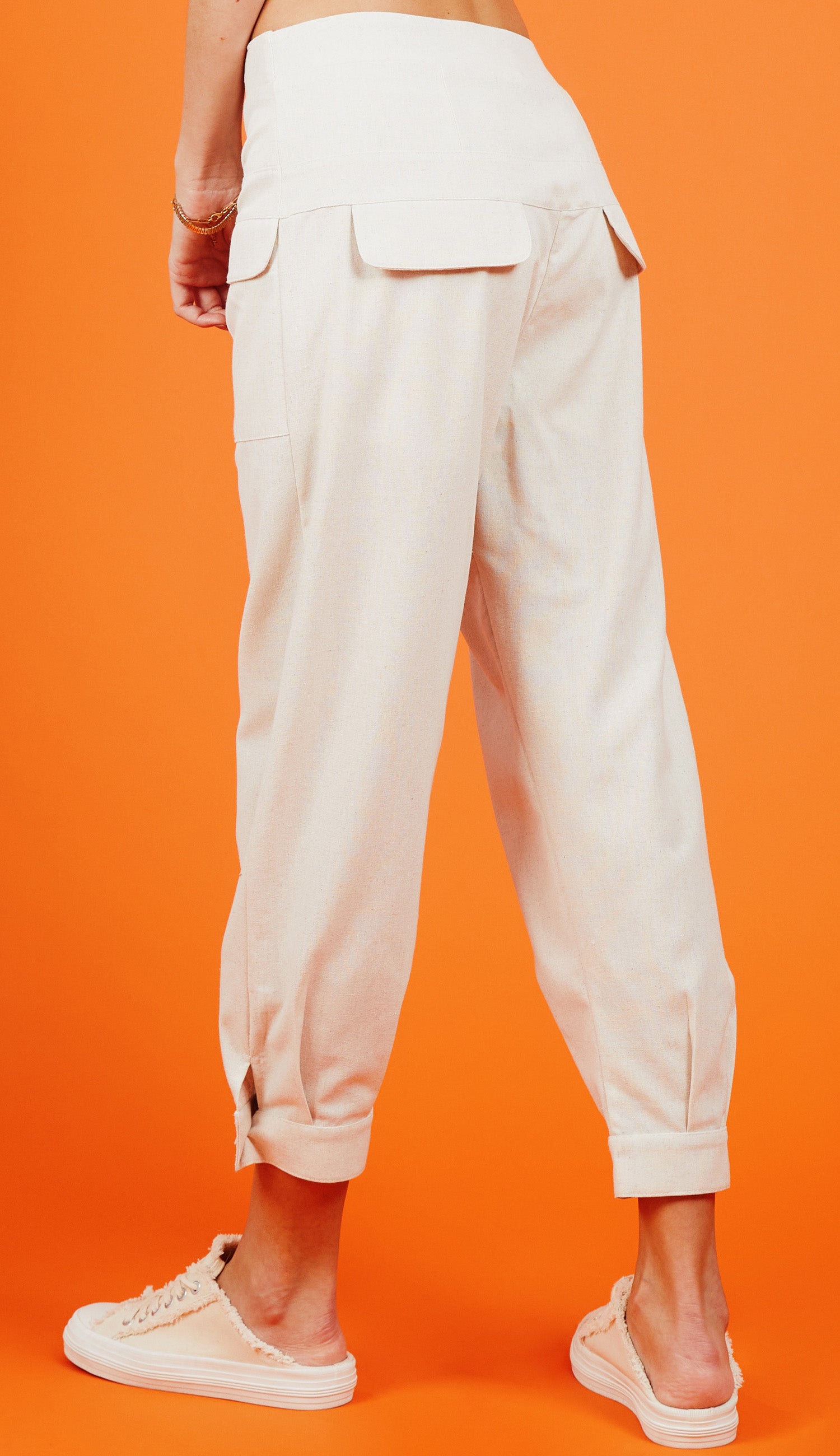 Calça confeccionada em linho com forro. Possui cós mais largo, bolsos frontais com lapela, fechamento frontal por zíper comum e pregas nos punhos com botão forrado.