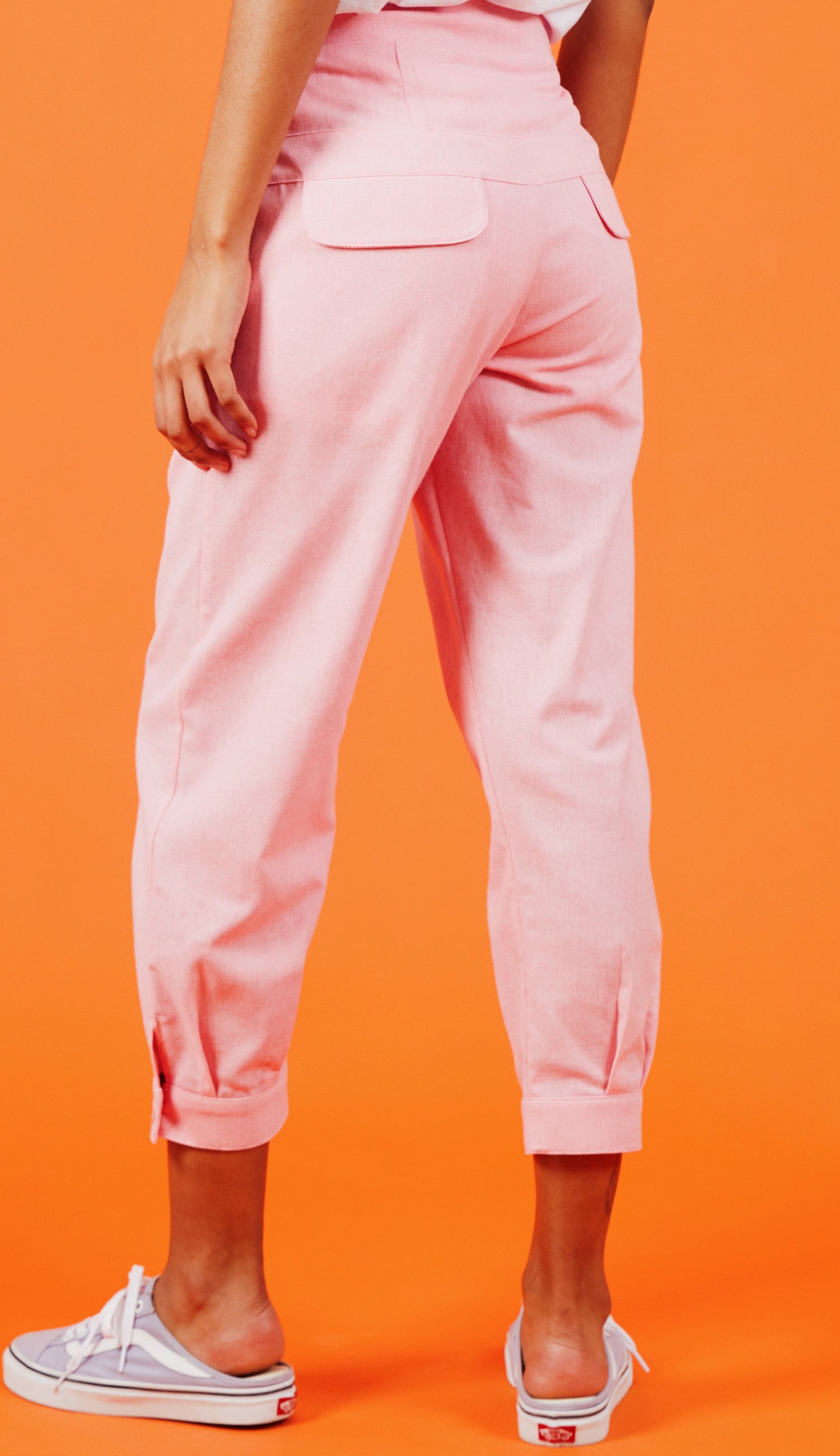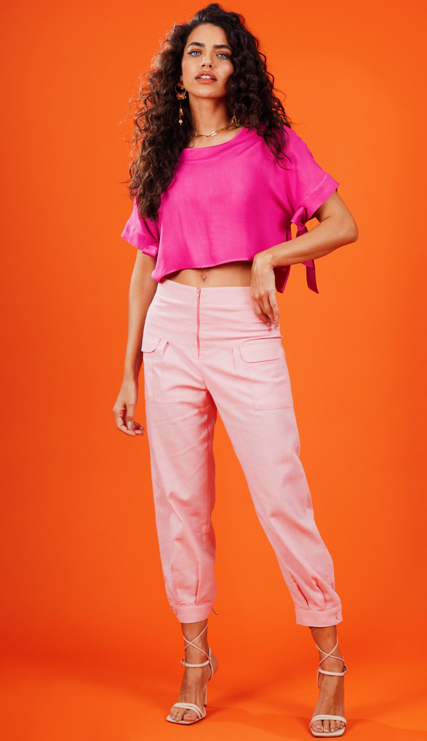 Calça confeccionada em linho com forro. Possui cós mais largo, bolsos frontais com lapela, fechamento frontal por zíper comum e pregas nos punhos com botão forrado.