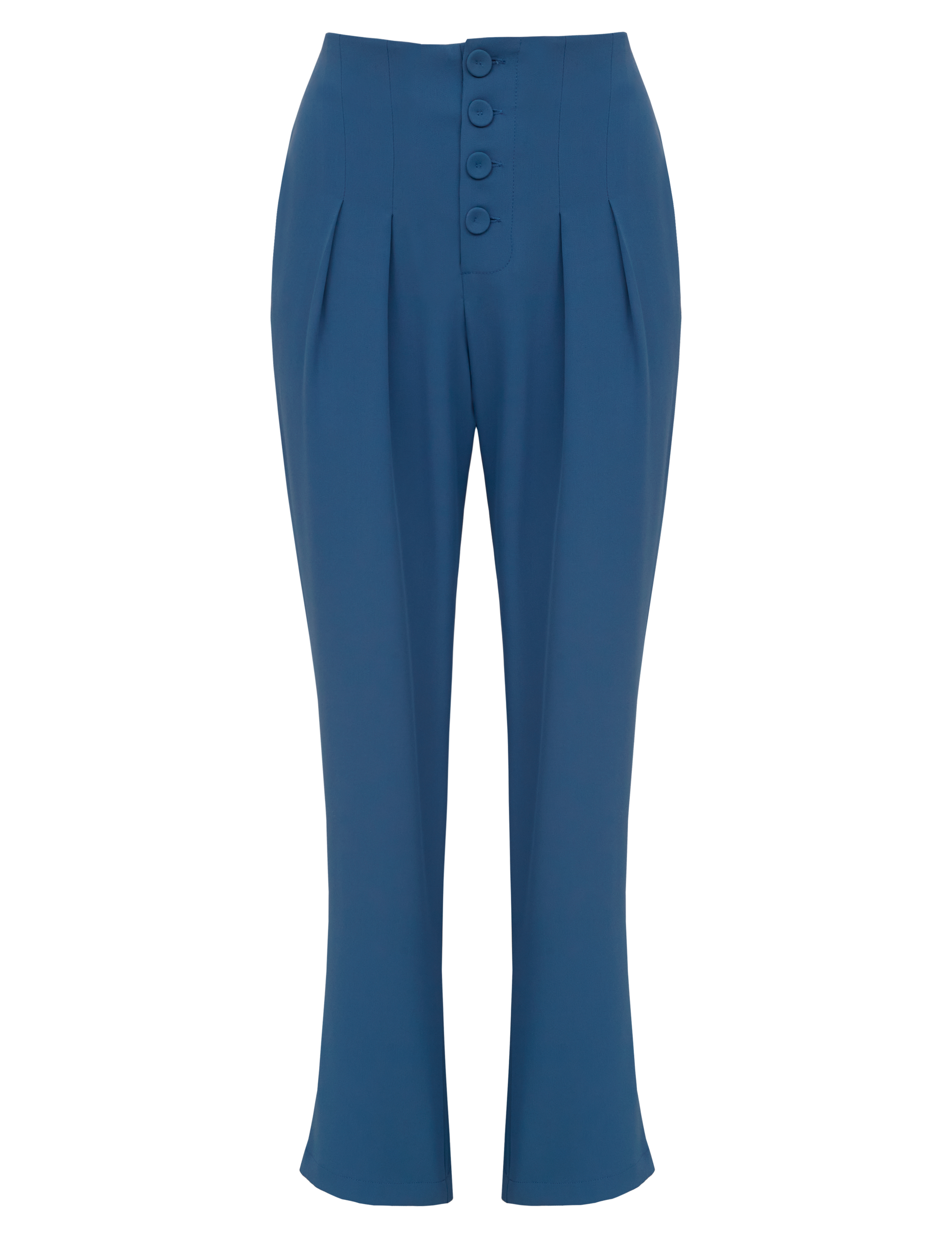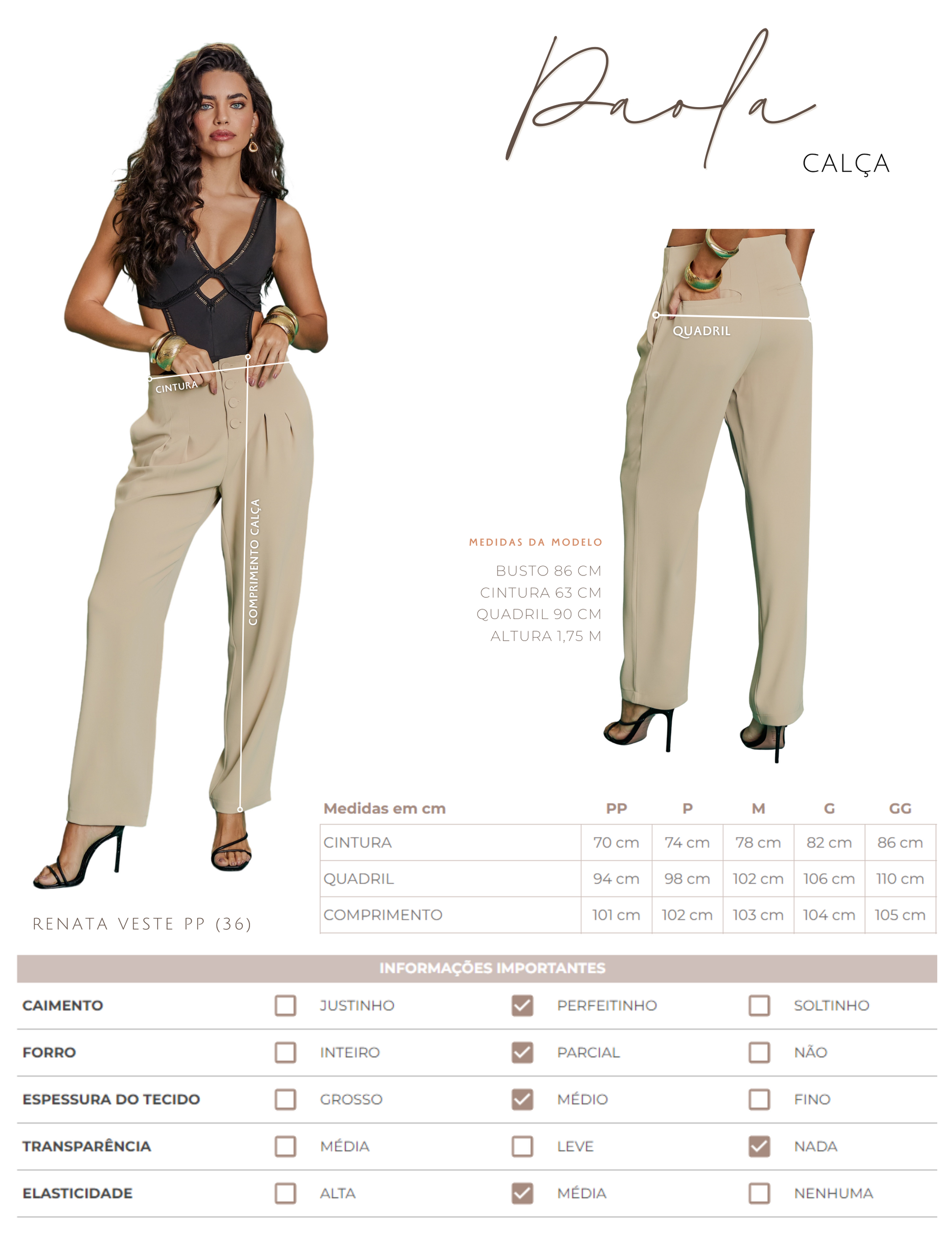 Calça de alfaiataria confeccionada em crepe. Possui fechamento frontal por botões forrados, pregas frontais, pernas soltinhas e bolsos laterais e traseiros.
