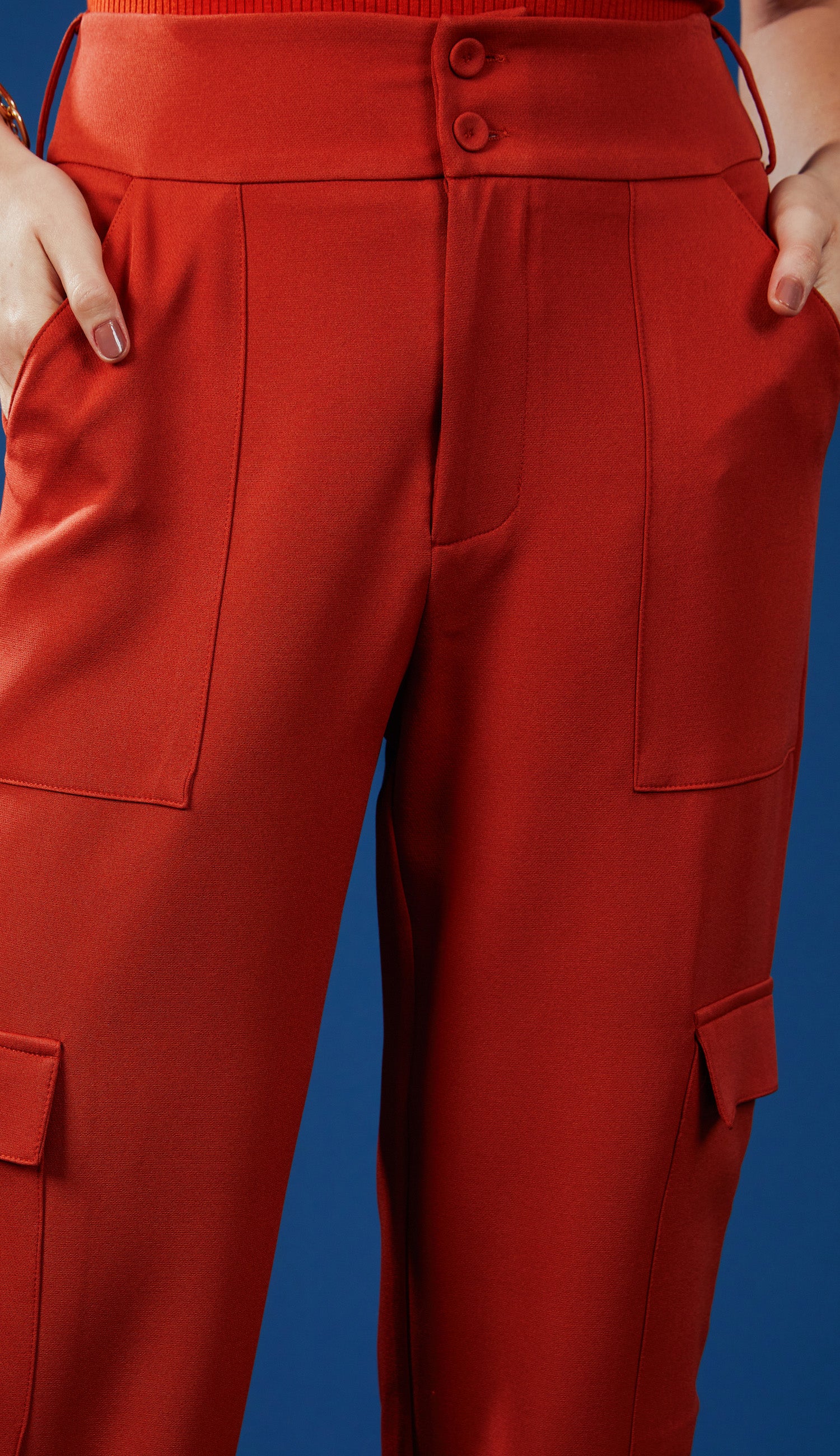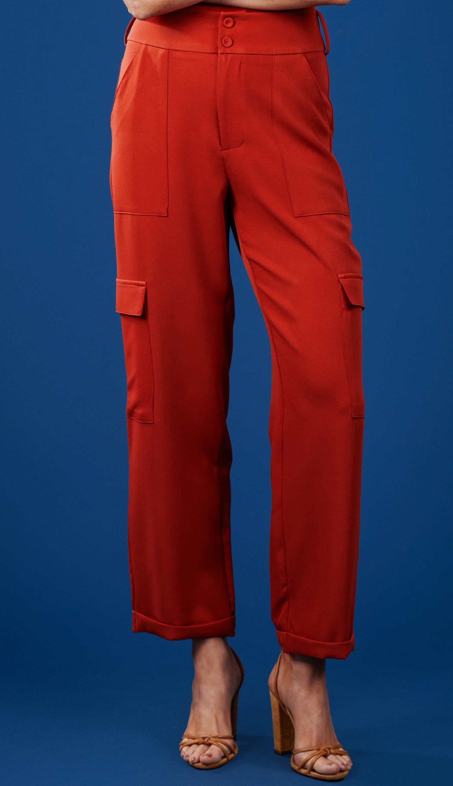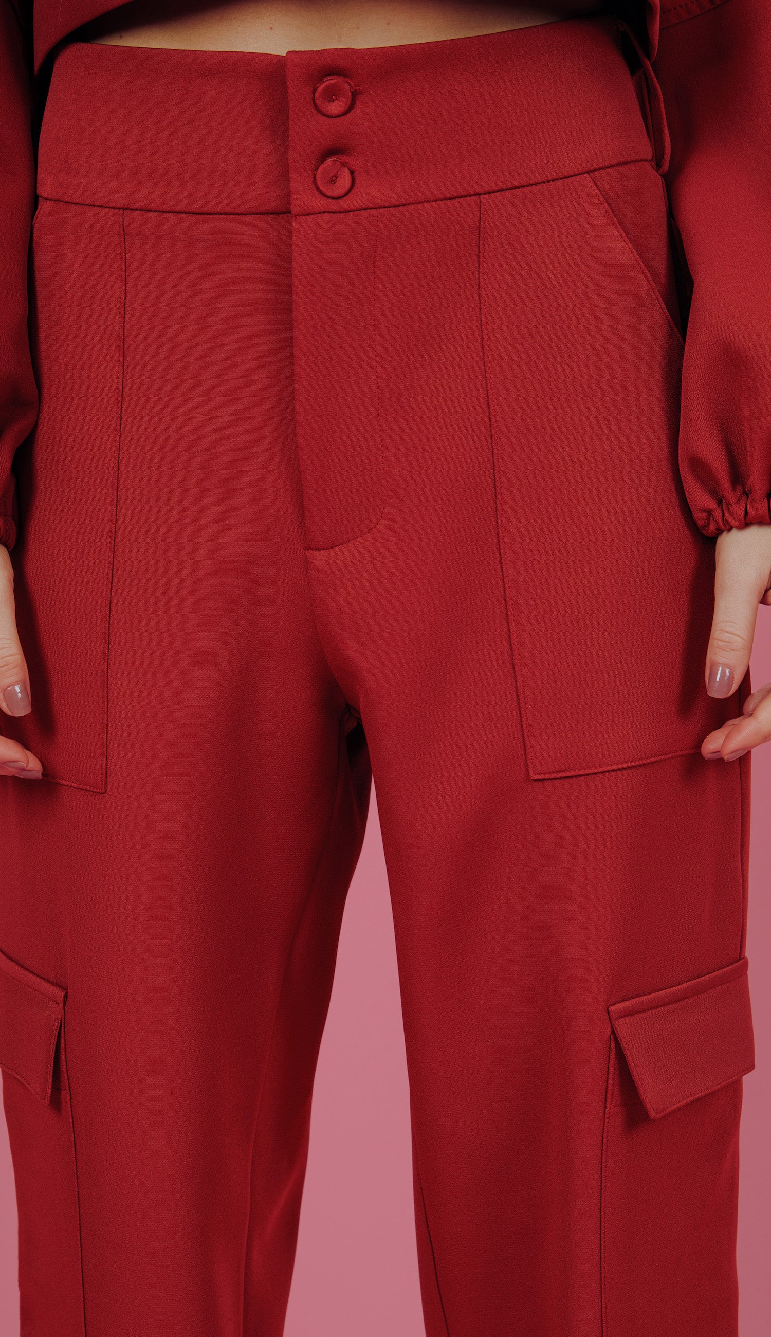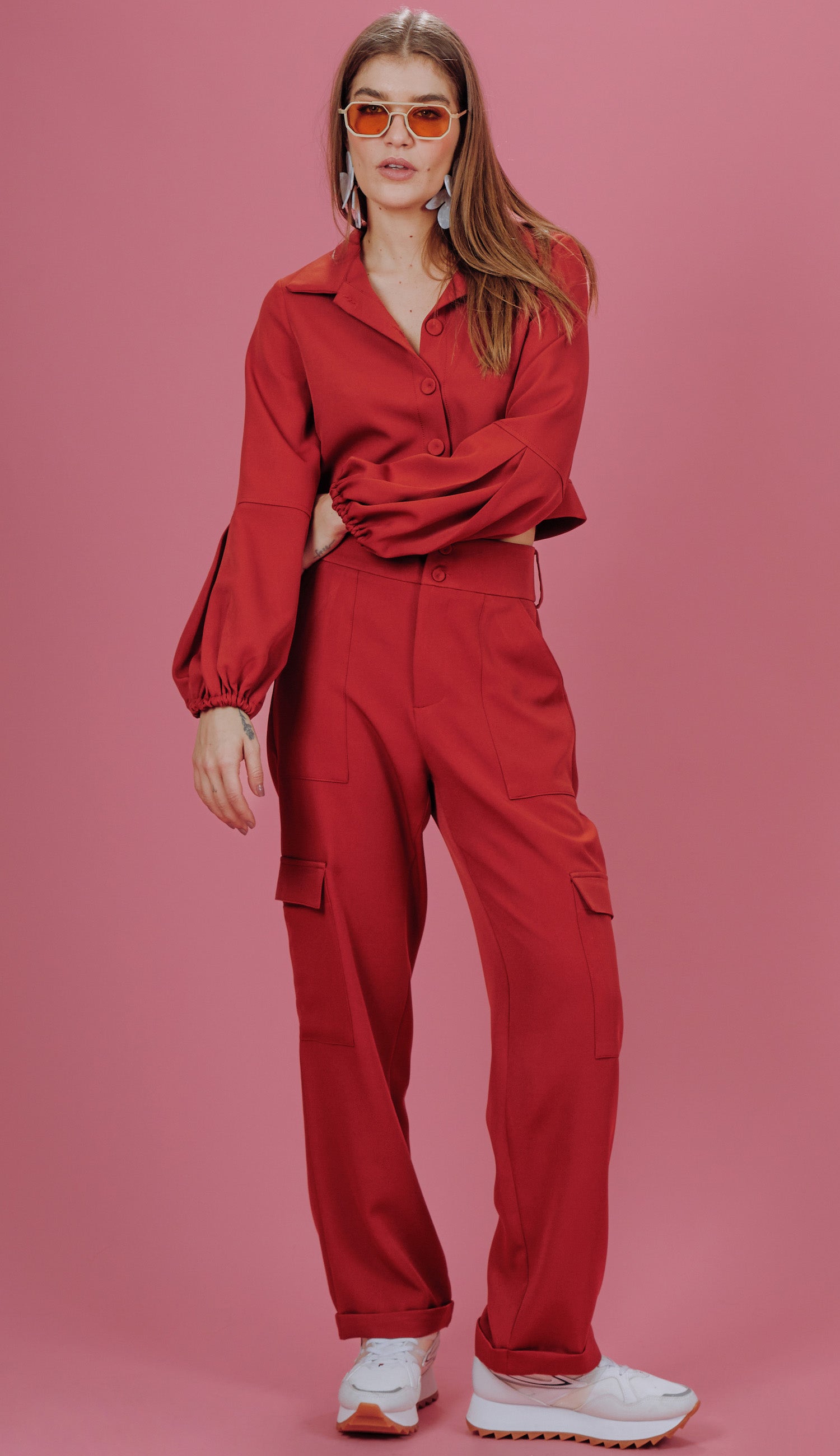 Calça confeccionada em alfaiataria. Possui cós largo com passantes; fechamento frontal por dois botões forrados e zíper; bolsos frontais aplicados e nas laterais das pernas também, no estilo cargo; perna soltinha e barra dobrada.