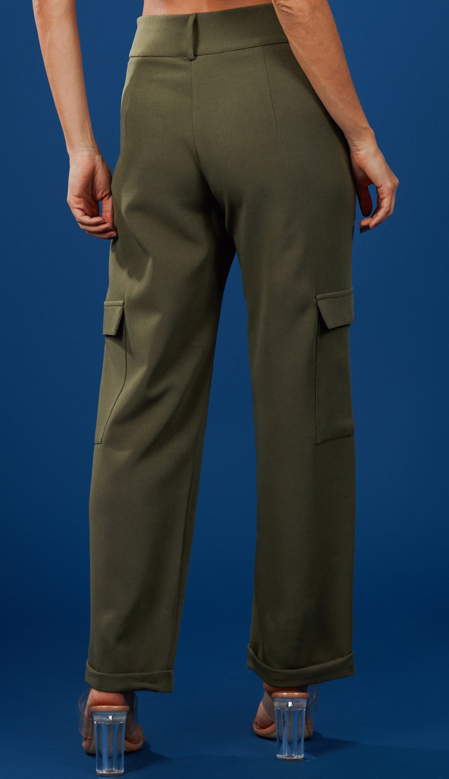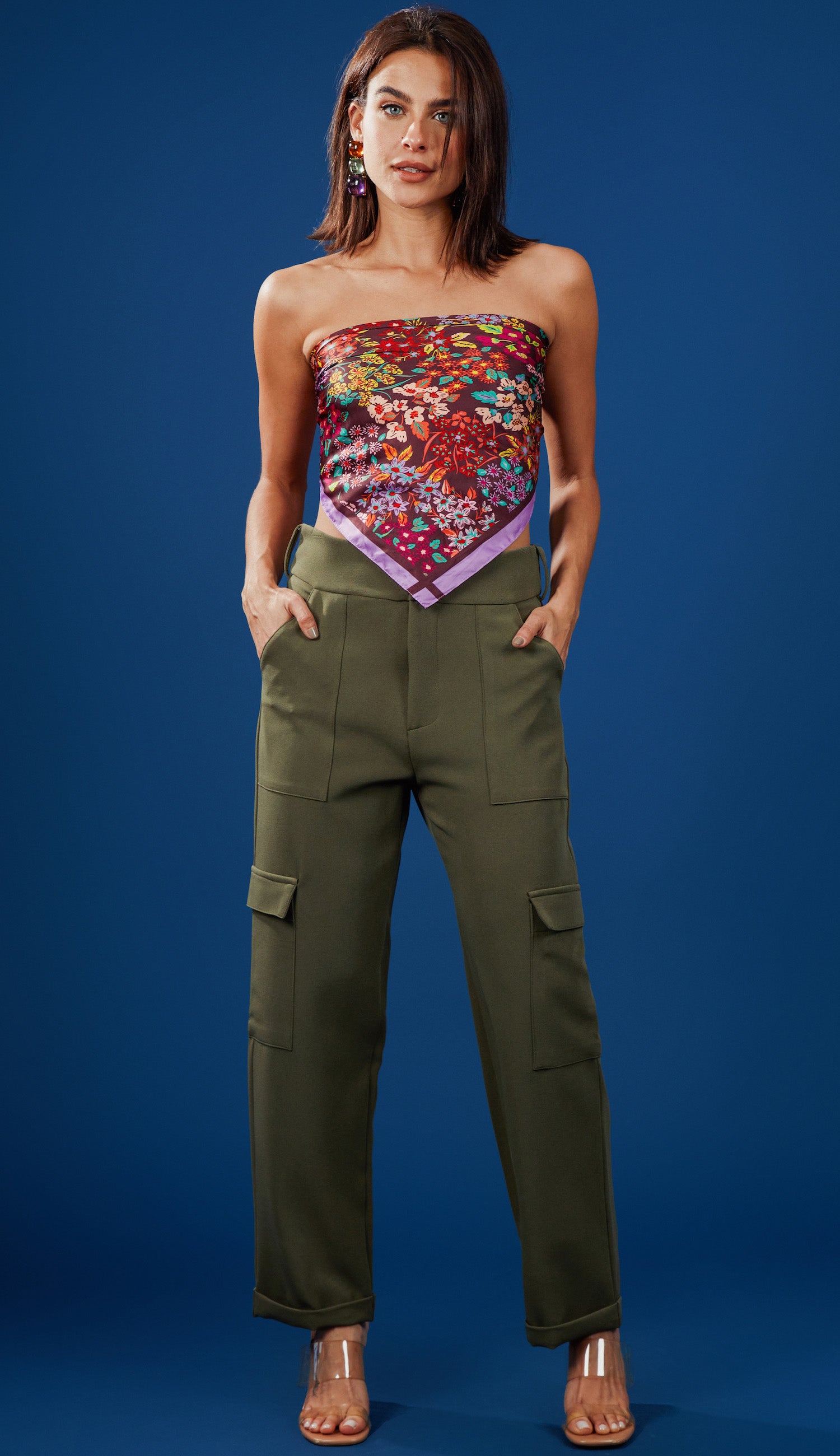 Calça confeccionada em alfaiataria. Possui cós largo com passantes; fechamento frontal por dois botões forrados e zíper; bolsos frontais aplicados e nas laterais das pernas também, no estilo cargo; perna soltinha e barra dobrada.