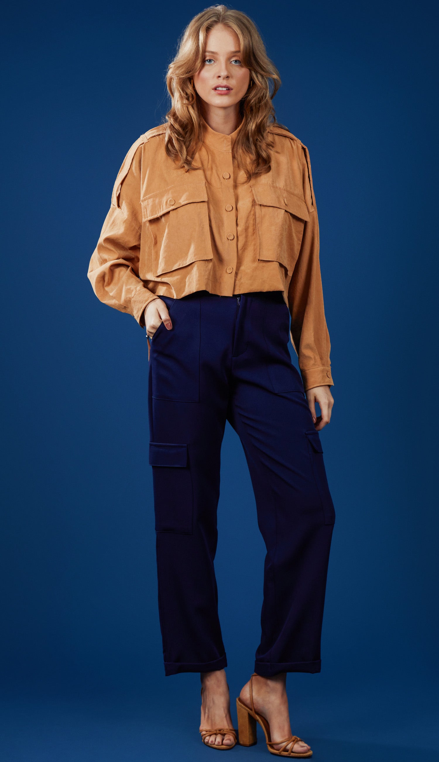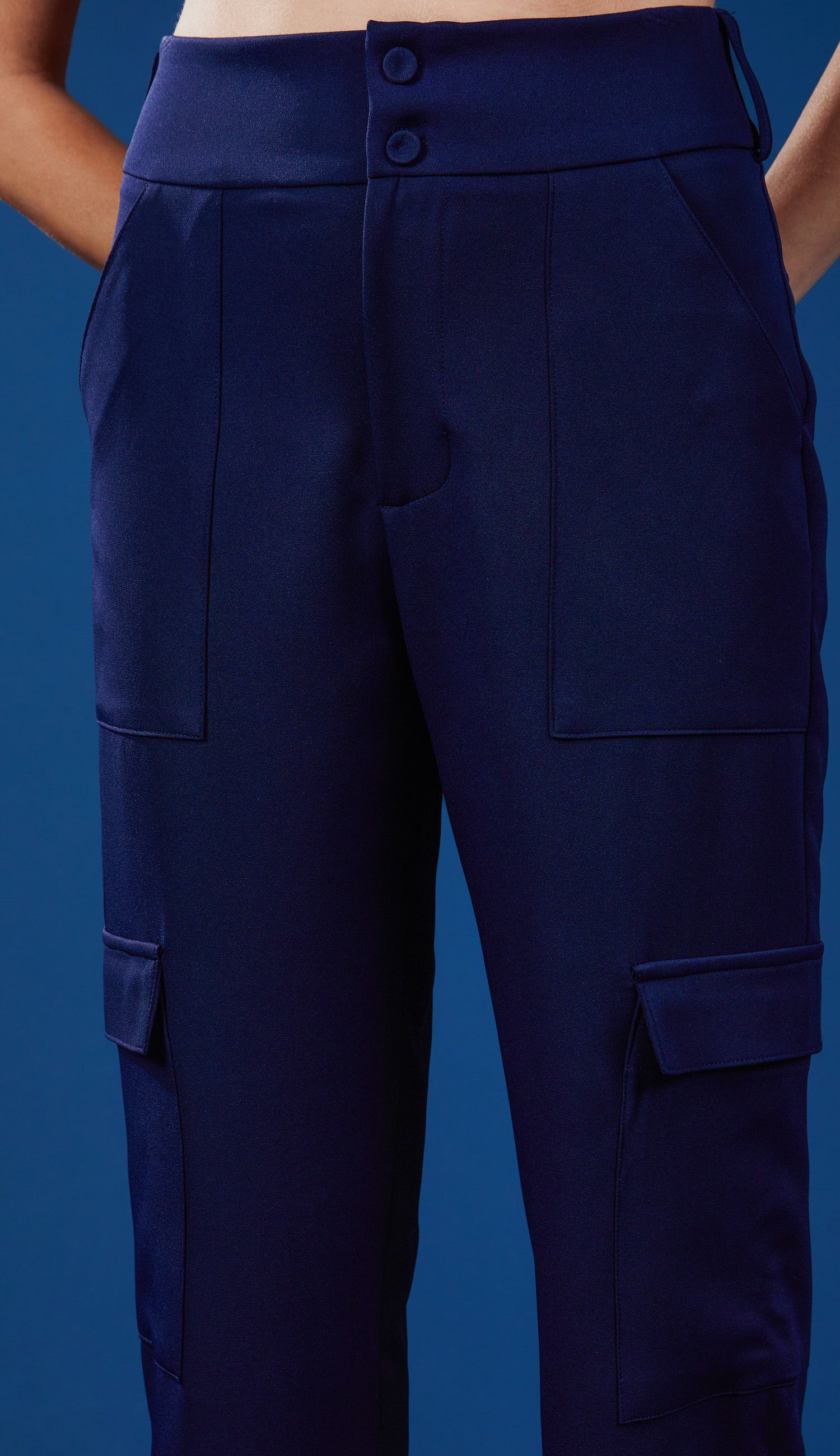 Calça confeccionada em alfaiataria. Possui cós largo com passantes; fechamento frontal por dois botões forrados e zíper; bolsos frontais aplicados e nas laterais das pernas também, no estilo cargo; perna soltinha e barra dobrada.