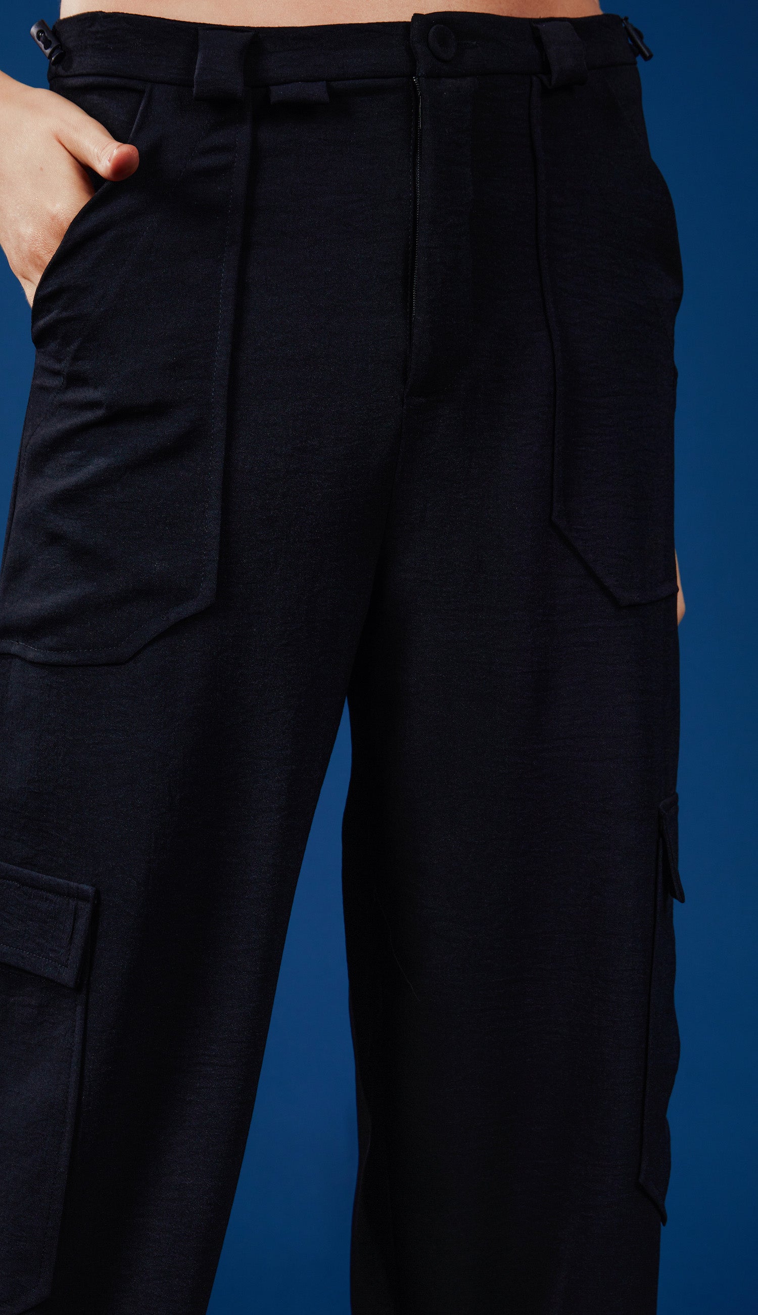 Calça no estilo cargo com forro, confeccionada em crepe texturizado com efeito amassadinho. Possui fechamento frontal por zíper e botão forrado, passantes na frente, elástico embutido nas costas com reguladores para ajuste, bolsos frontais aplicados e laterais nas pernas com lapelas.
