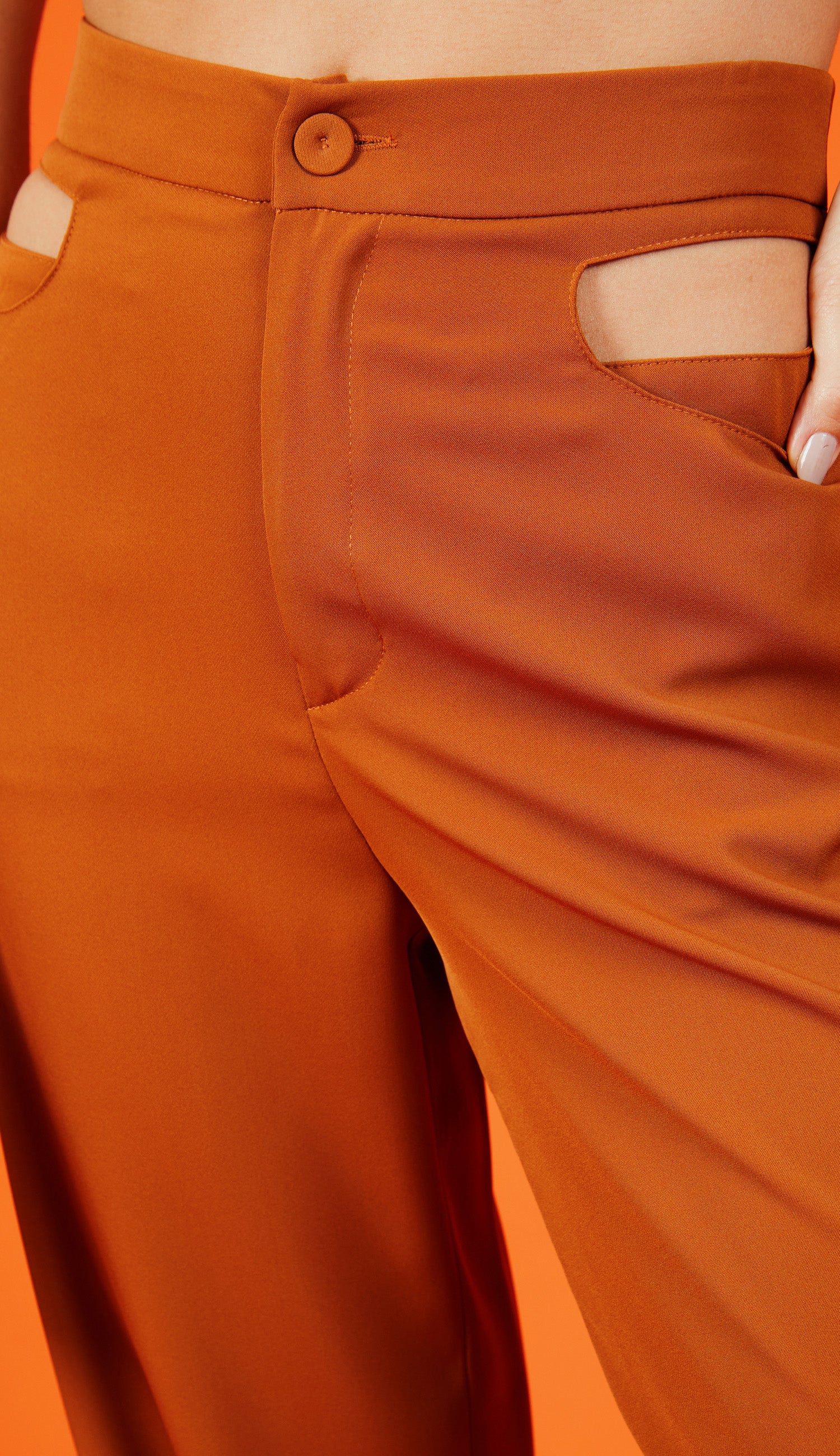 Calça pantalona confeccionada em crepe de alfaiataria. Possui fechamento frontal por zíper e botão forrado, recortes vazados laterais abaixo do cós com bolsinhos. Uma peça elegante e confortável para criar vários looks versáteis.