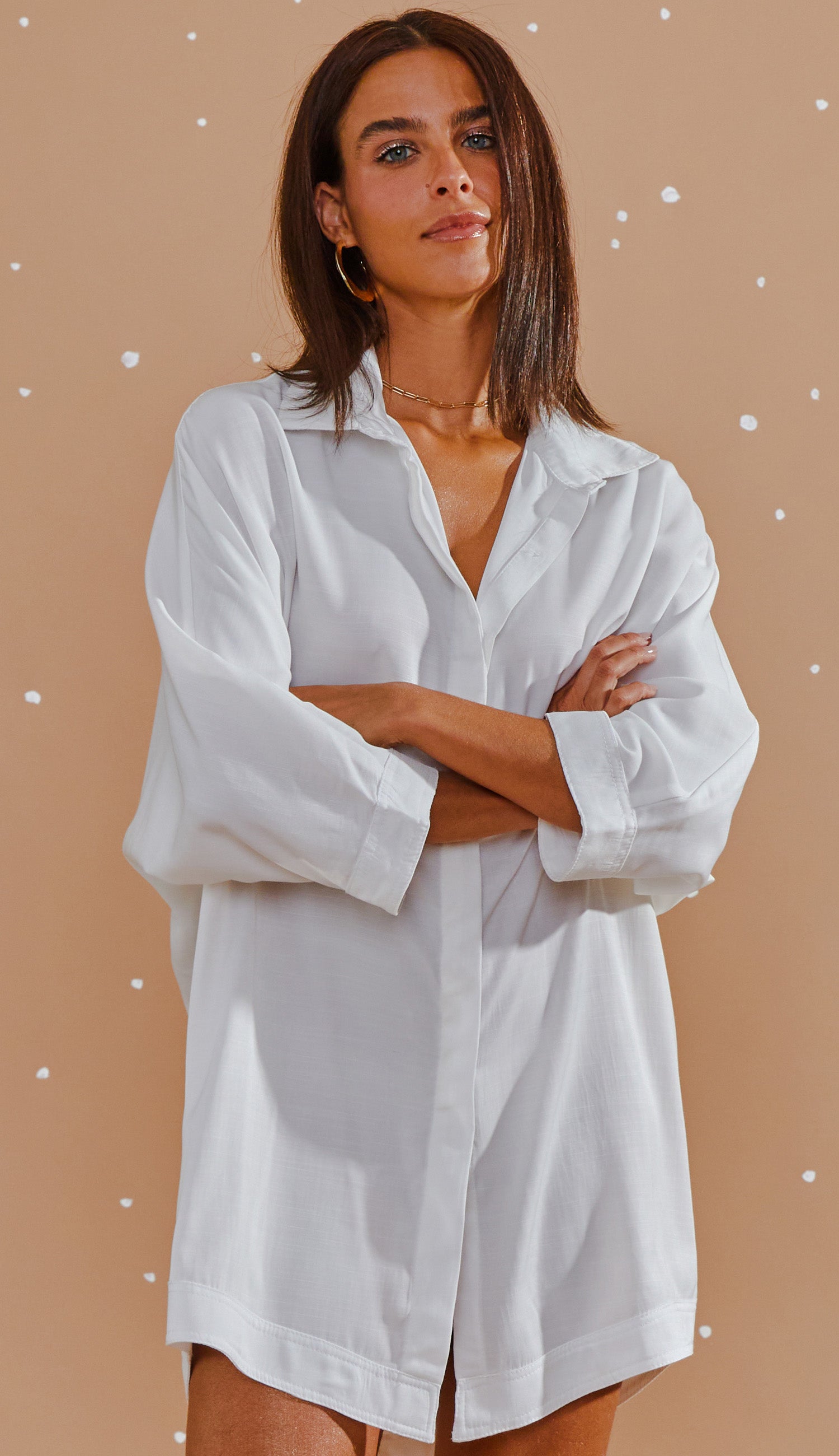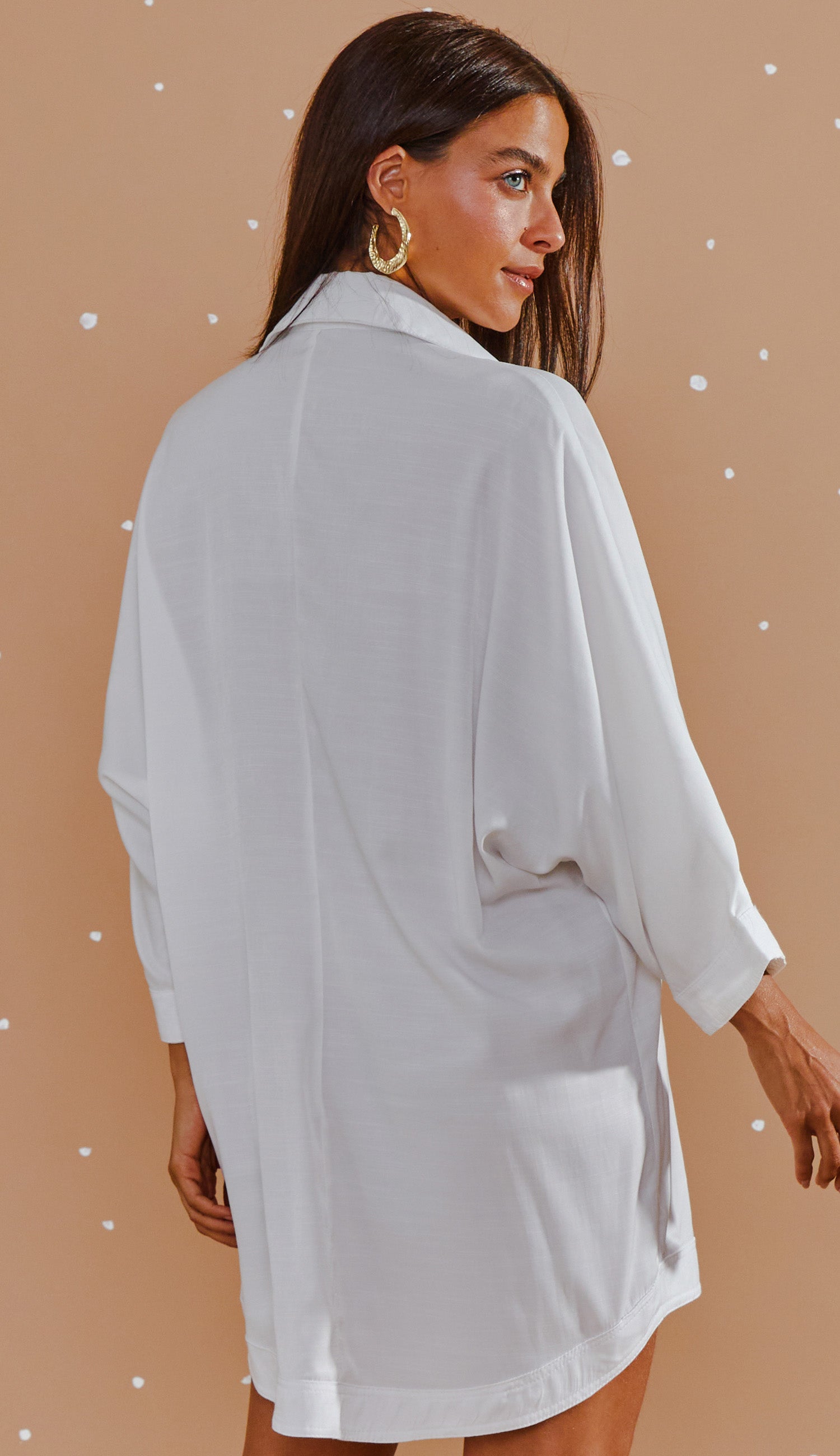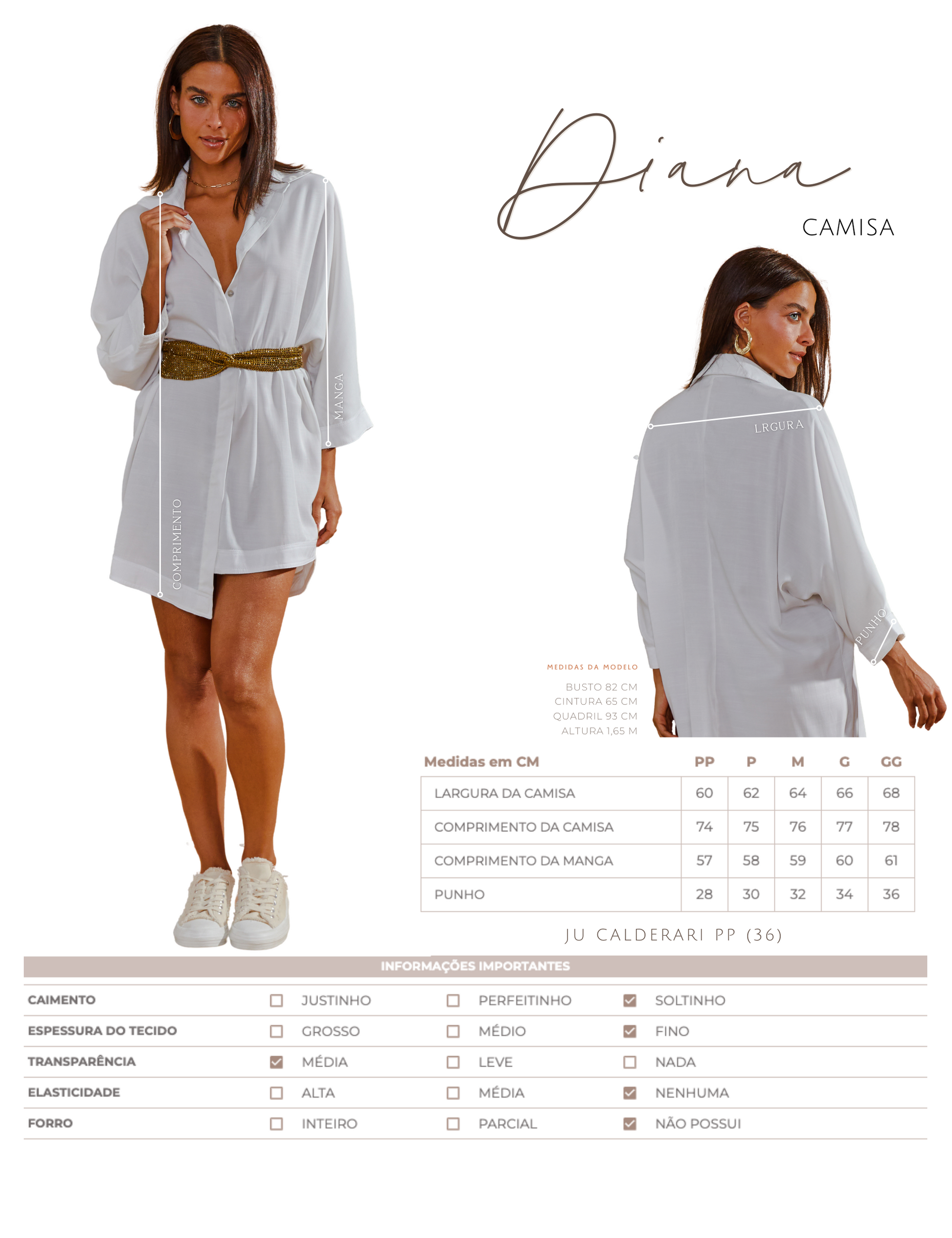 Camisa ampla confeccionada em poliviscose com aspecto de linho. Possui modelagem alongada, gola, fechamento frontal por botões madrepérola e manga morcego 3/4.