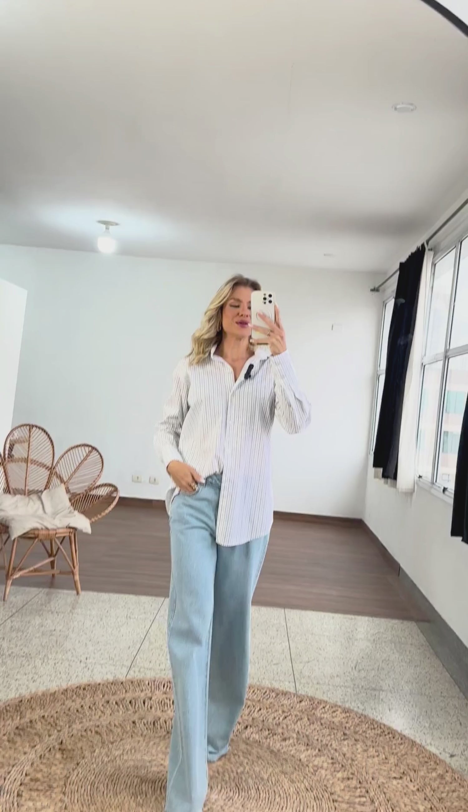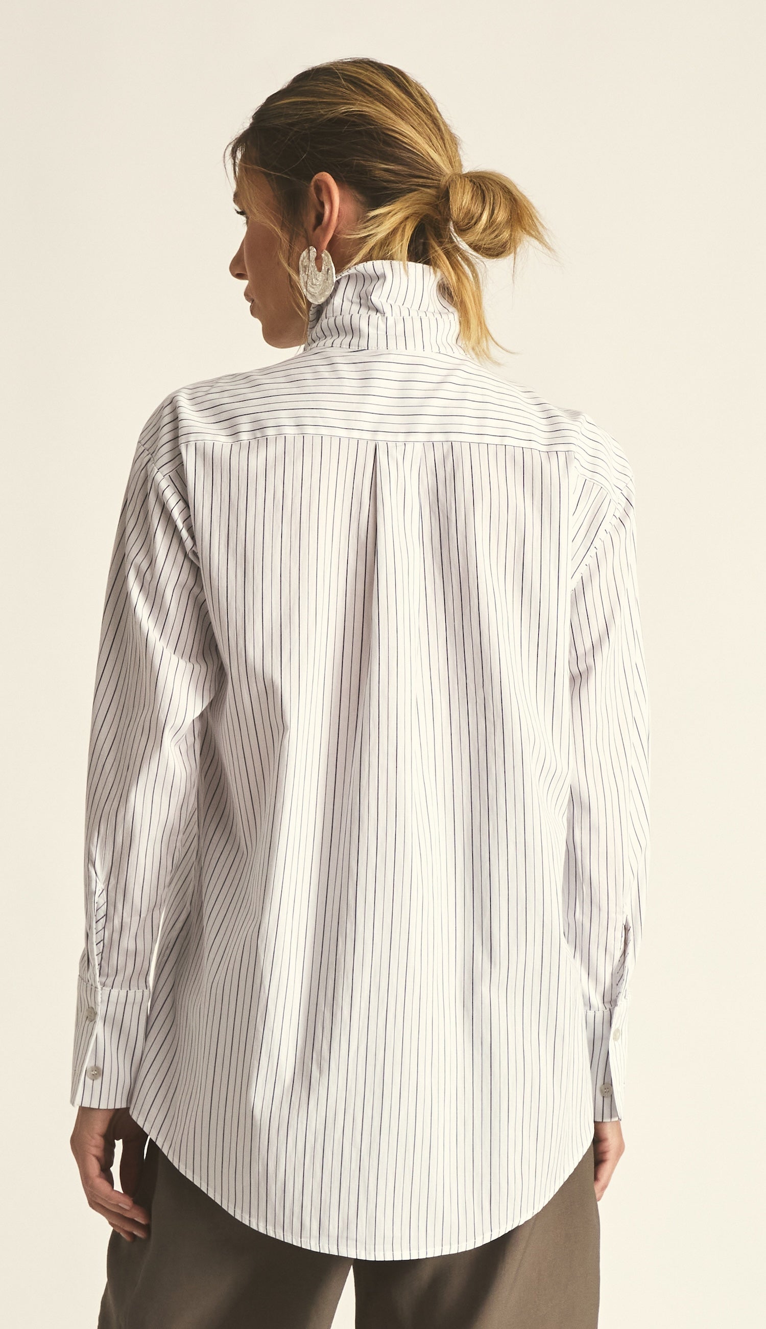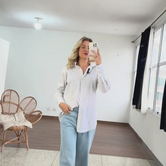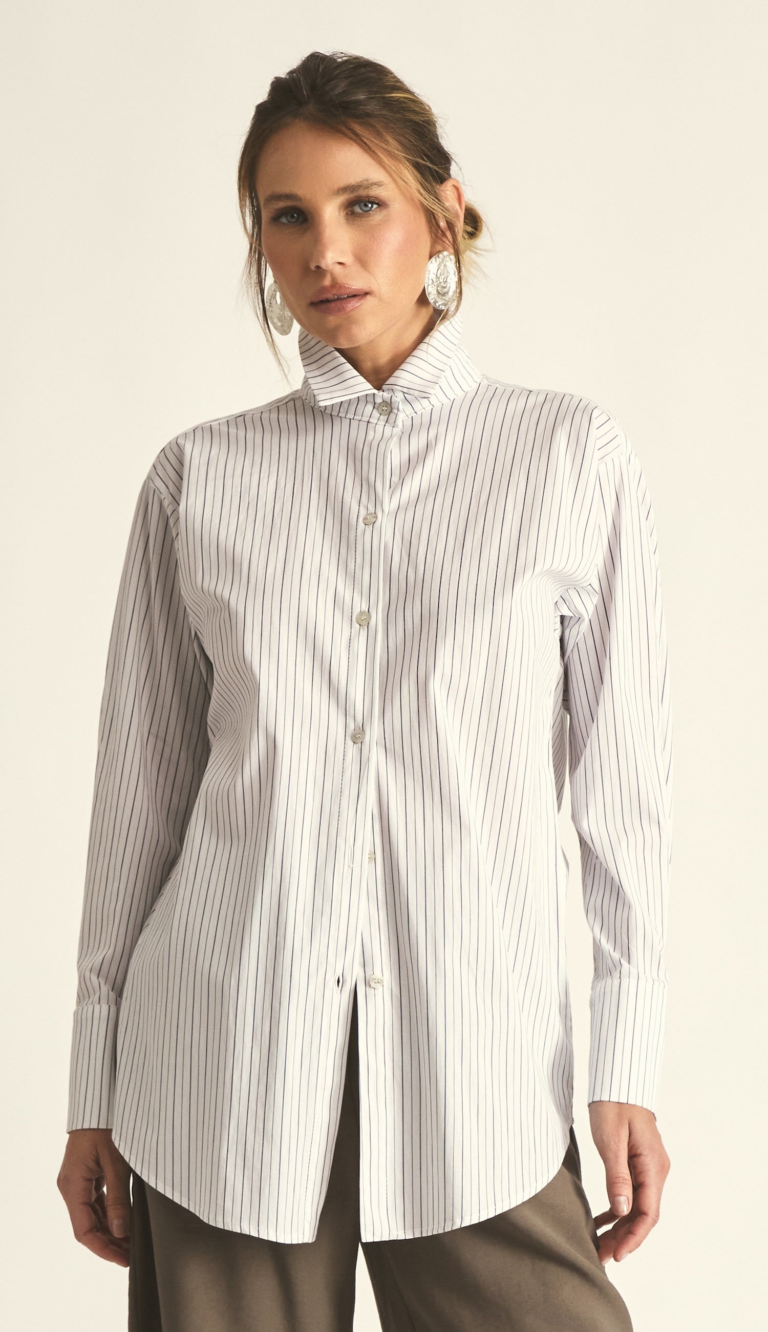 Camisa oversized confeccionada em tricoline de algodão risca de giz com elasticidade. Possui modelagem clássica mais soltinha e alongada, mangas longas com punhos largos, gola tradicional, fechamento frontal e dos punhos por botões madrepérola, pala e prega nas costas para melhor ajuste ao corpo e facilitar os movimentos. O tecido é super macio, leve, fresquinho e tem uma ótima elasticidade, que garante um conforto incrível.