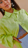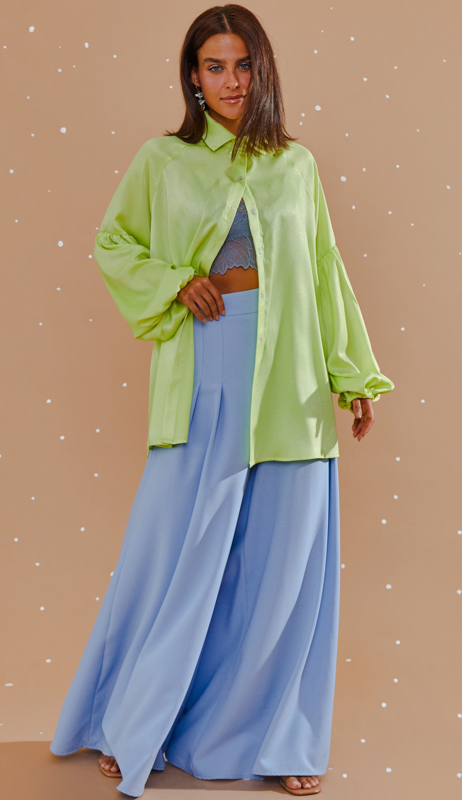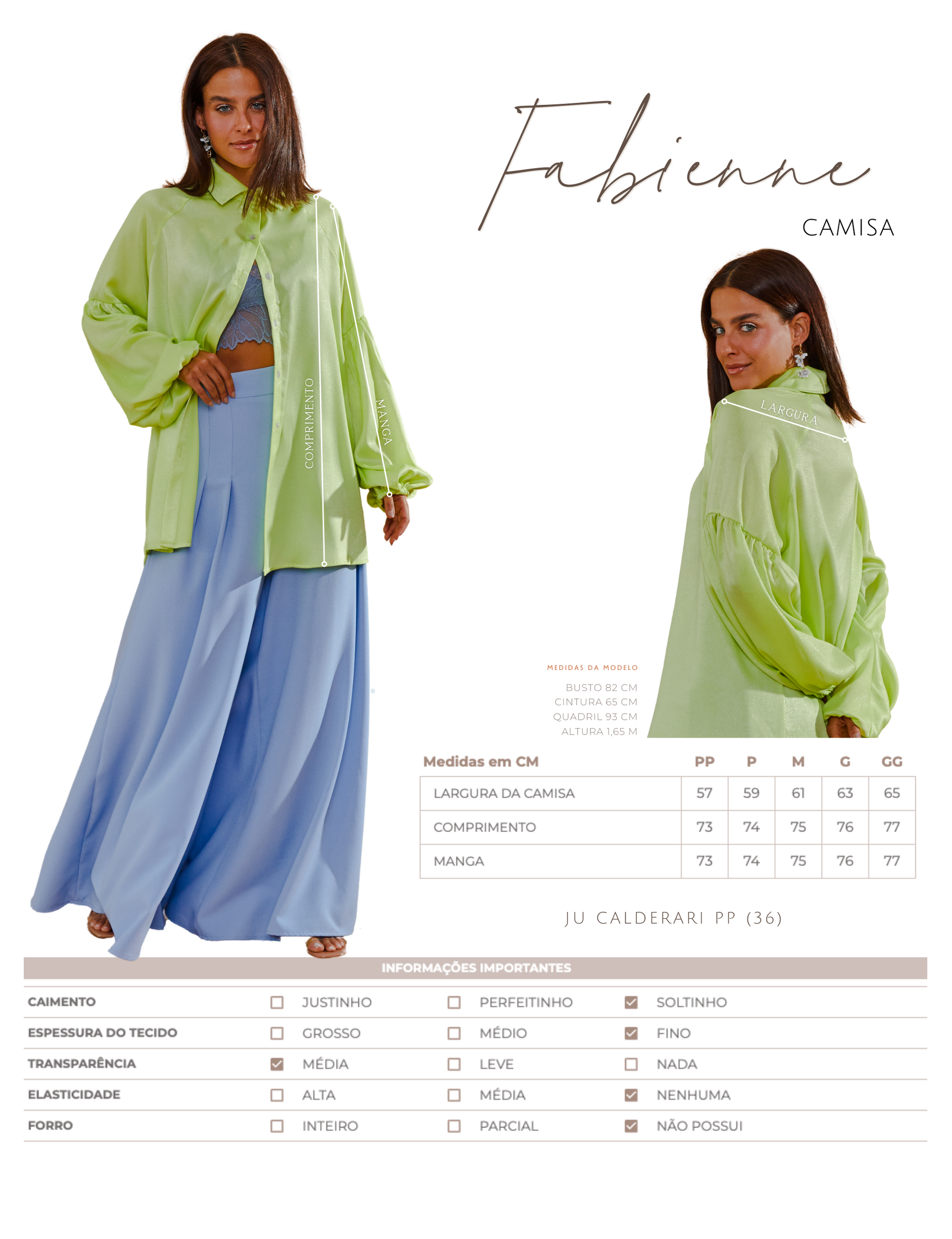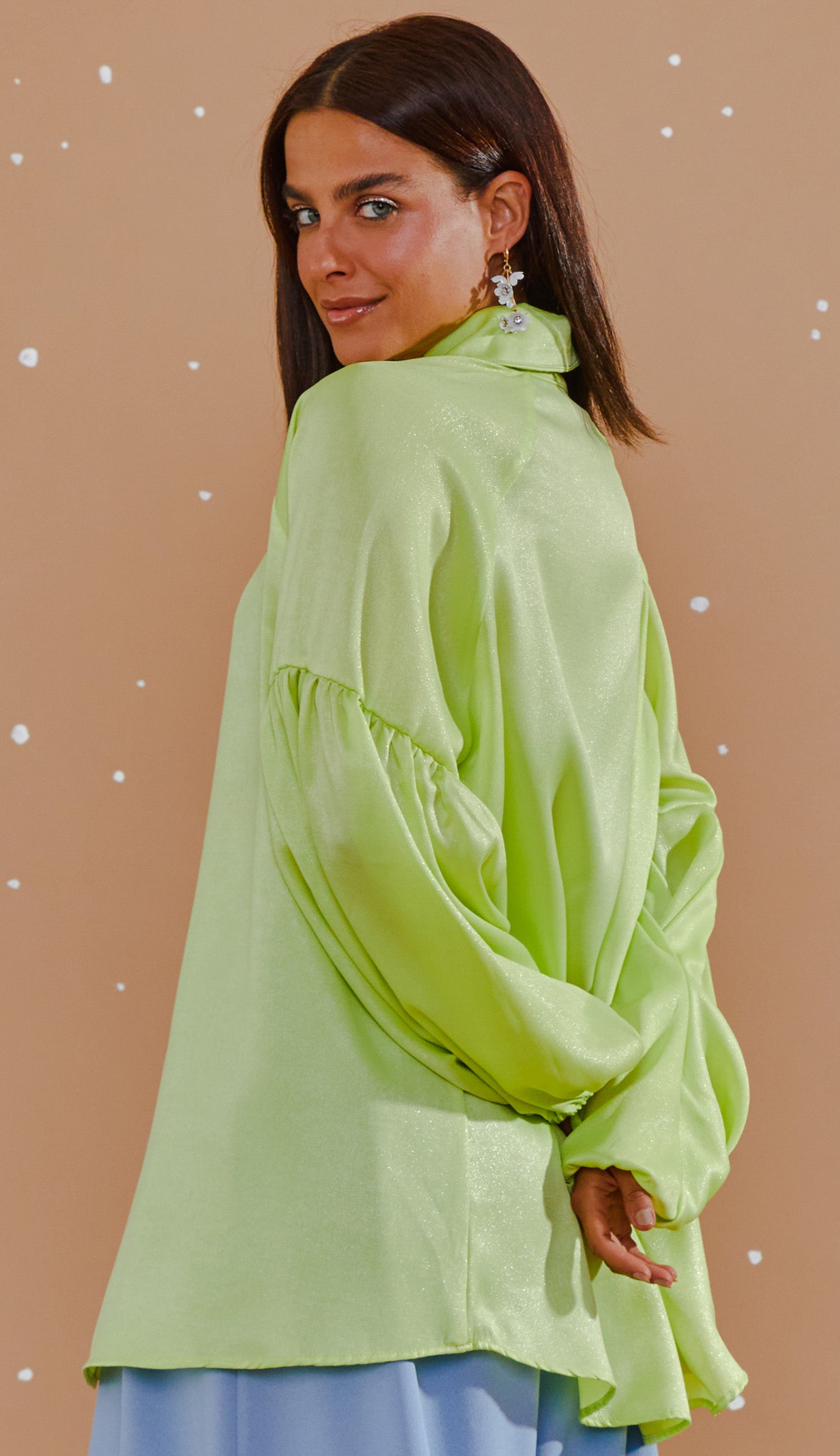 Camisa confeccionada em alfaiataria acetinada com delicados fios brilhosos. Possui gola tradicional, modelagem soltinha, fechamento frontal por botões madrepérola e mangas longas bufantes raglan com recorte, franzidinhos e elástico franzido nos punhos.