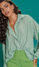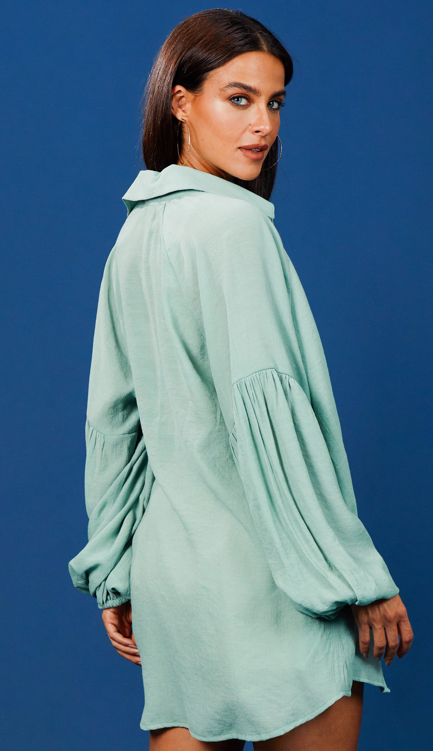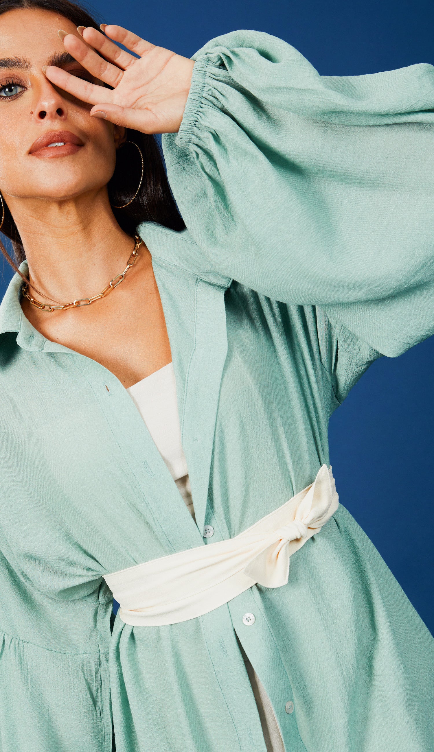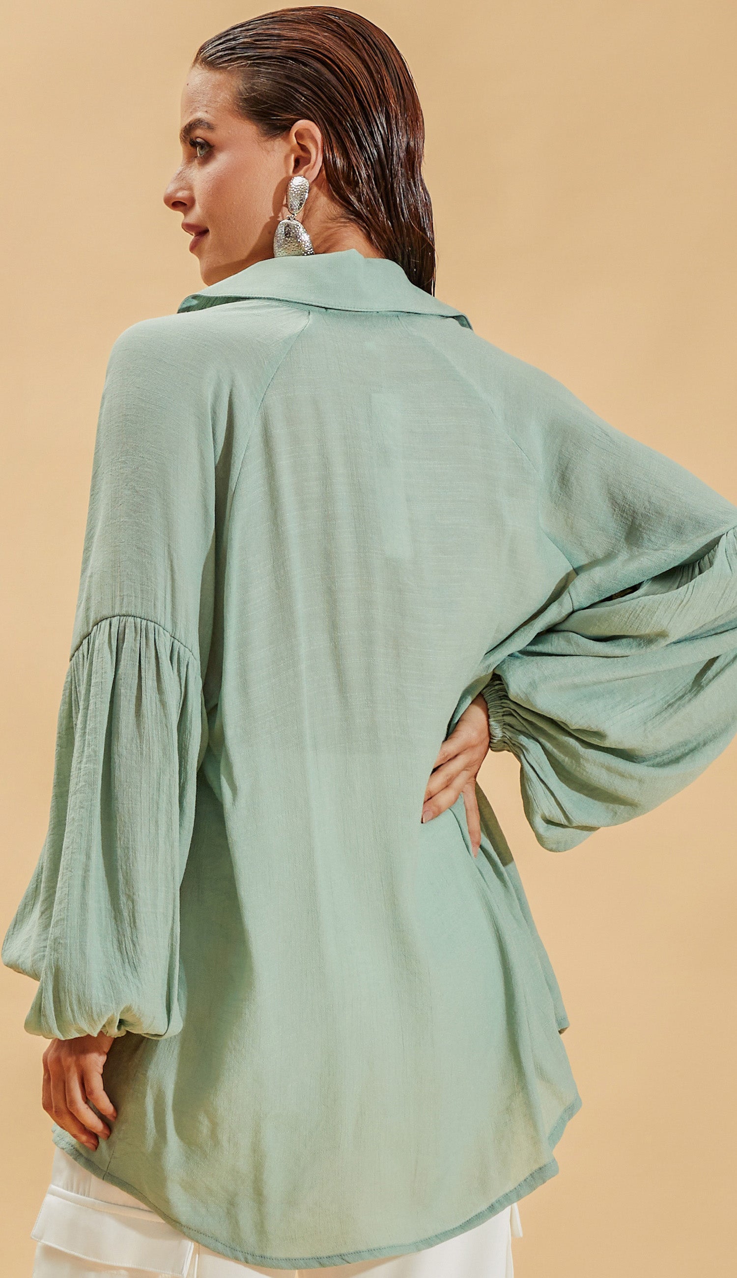 Camisa confeccionada em poliviscose texturizado com aspecto de linho. Possui gola tradicional, modelagem soltinha, fechamento frontal por botões madrepérola e mangas longas bufantes raglan com recorte, franzidinhos e elástico franzido nos punhos.