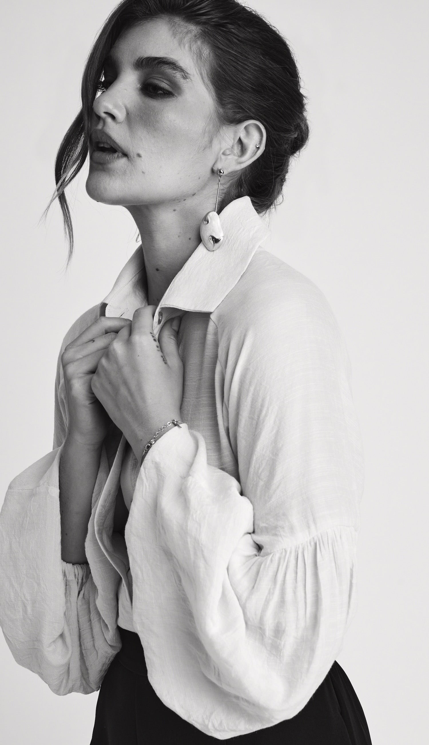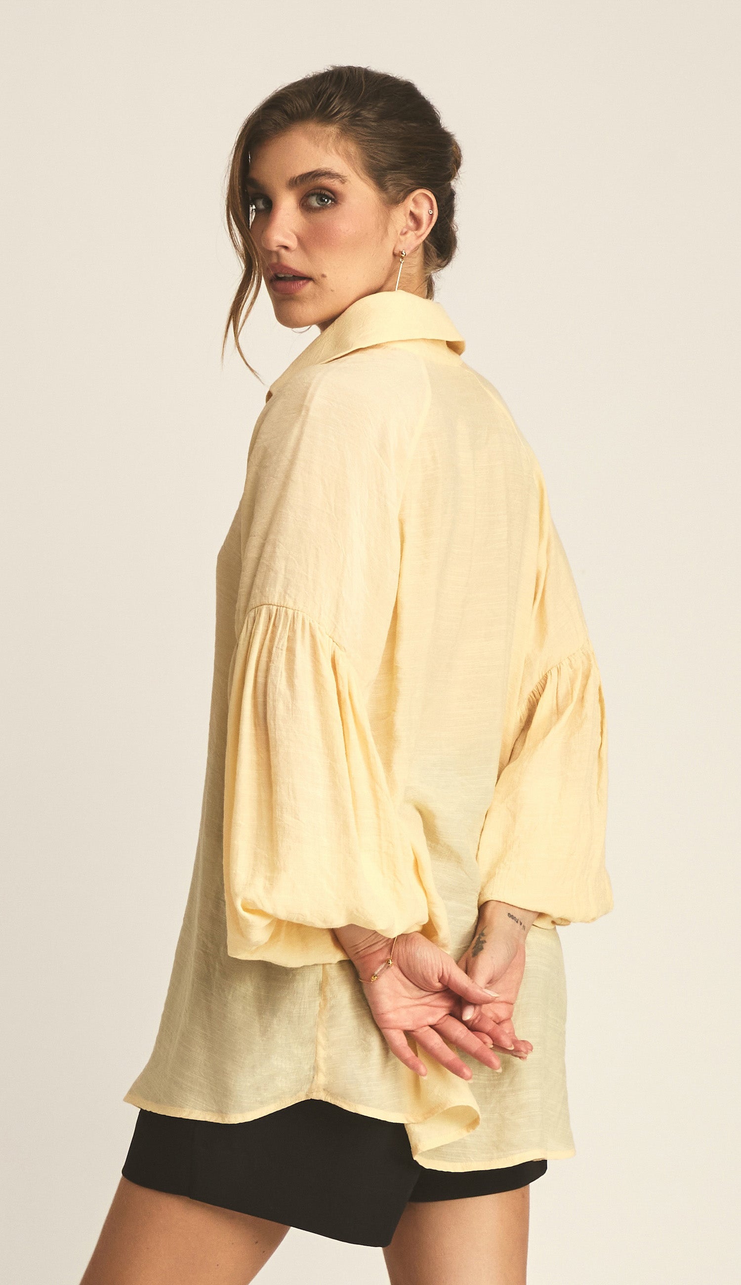 Camisa confeccionada em poliviscose texturizado com aspecto de linho. Possui gola tradicional, modelagem soltinha, fechamento frontal por botões madrepérola e mangas longas bufantes raglan com recorte, franzidinhos e elástico franzido nos punhos.