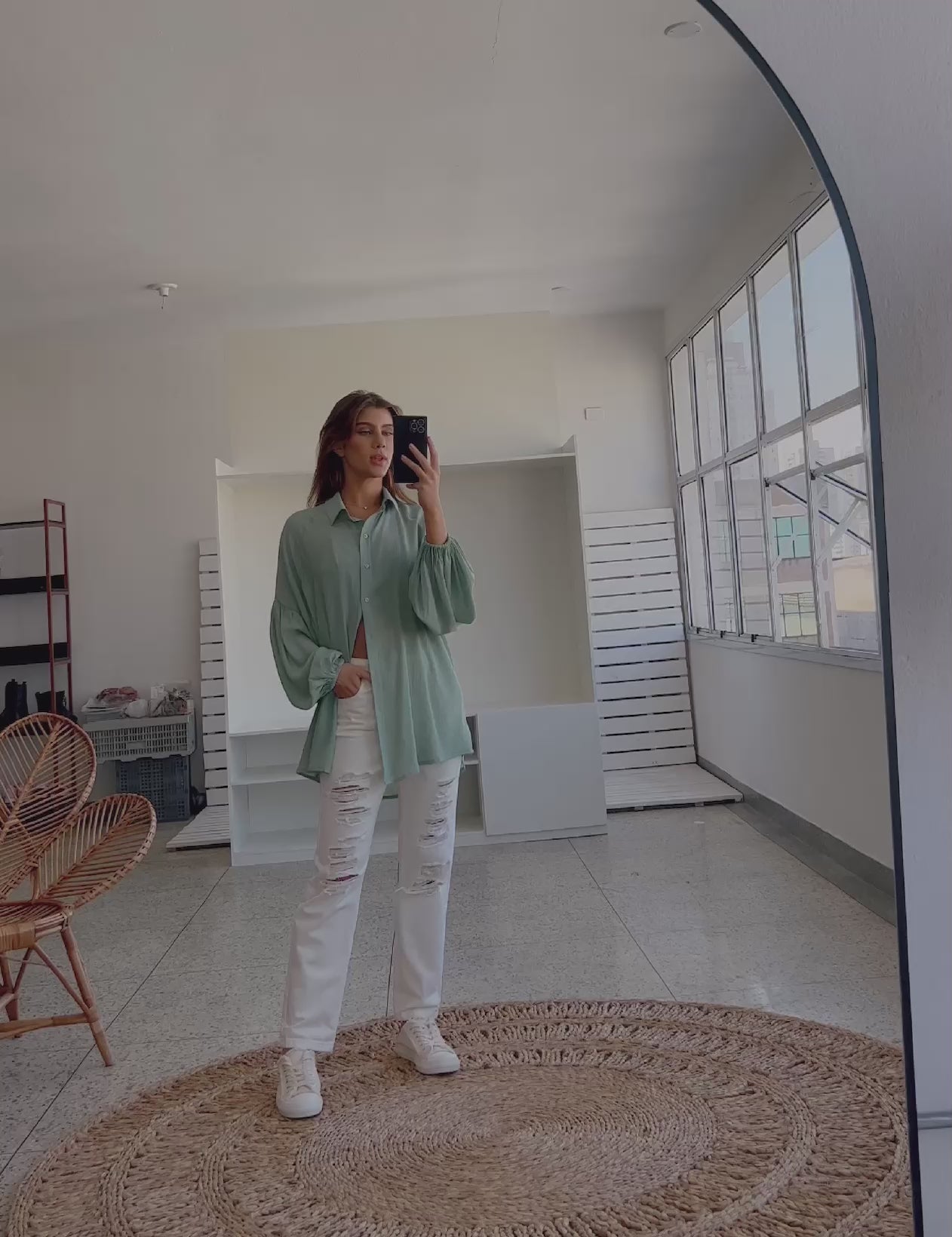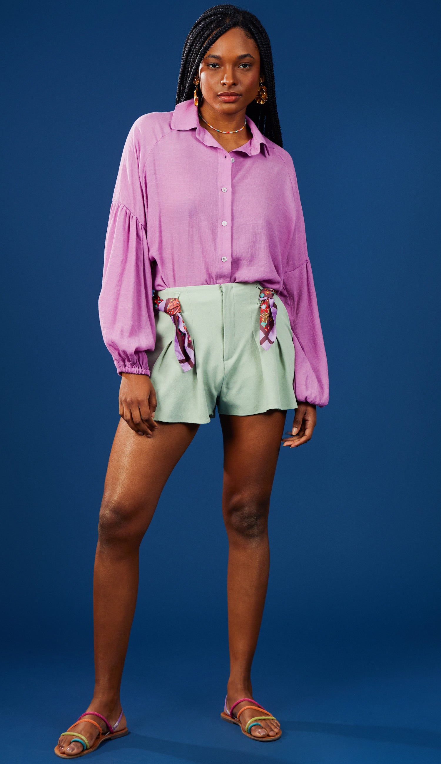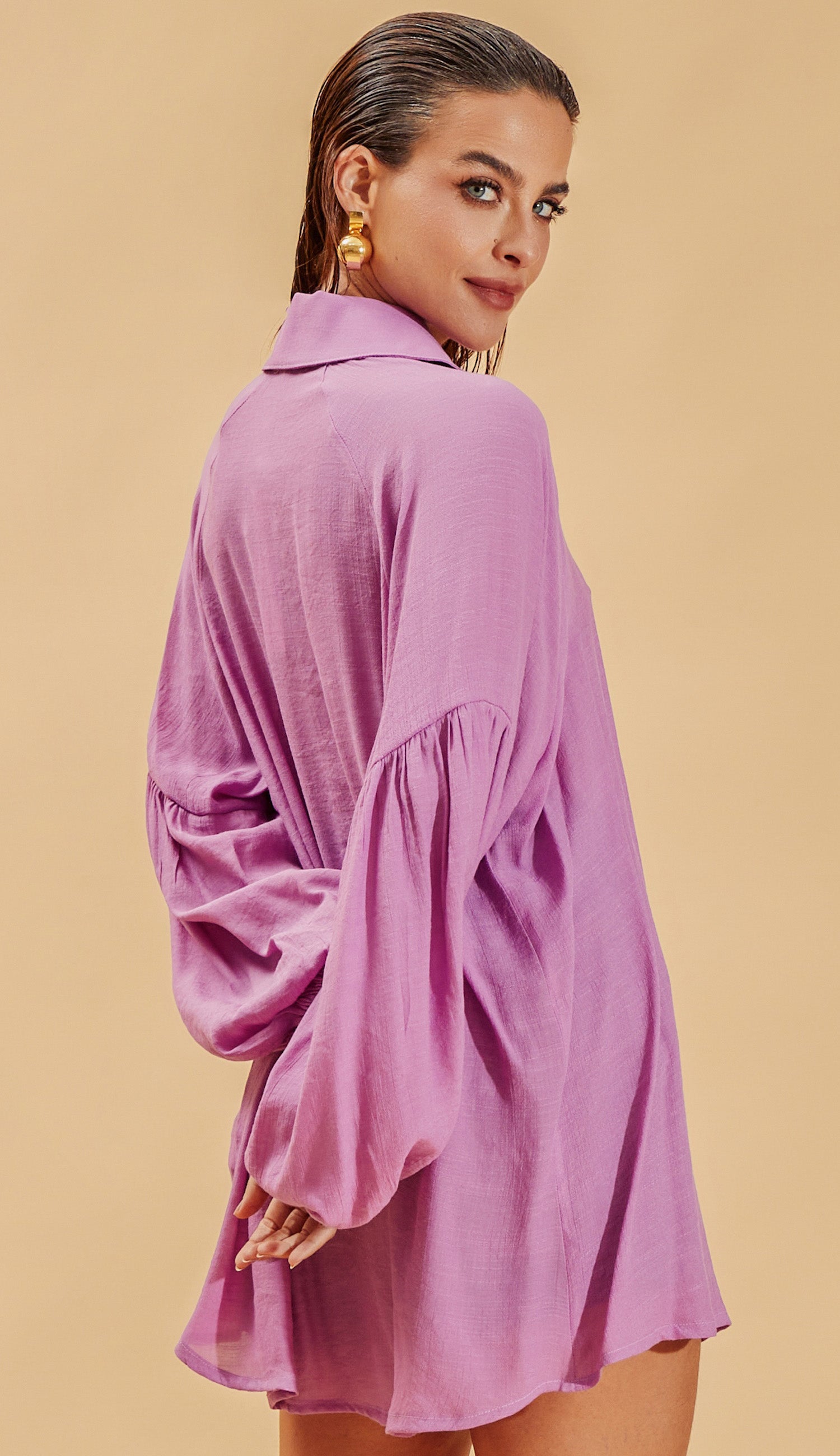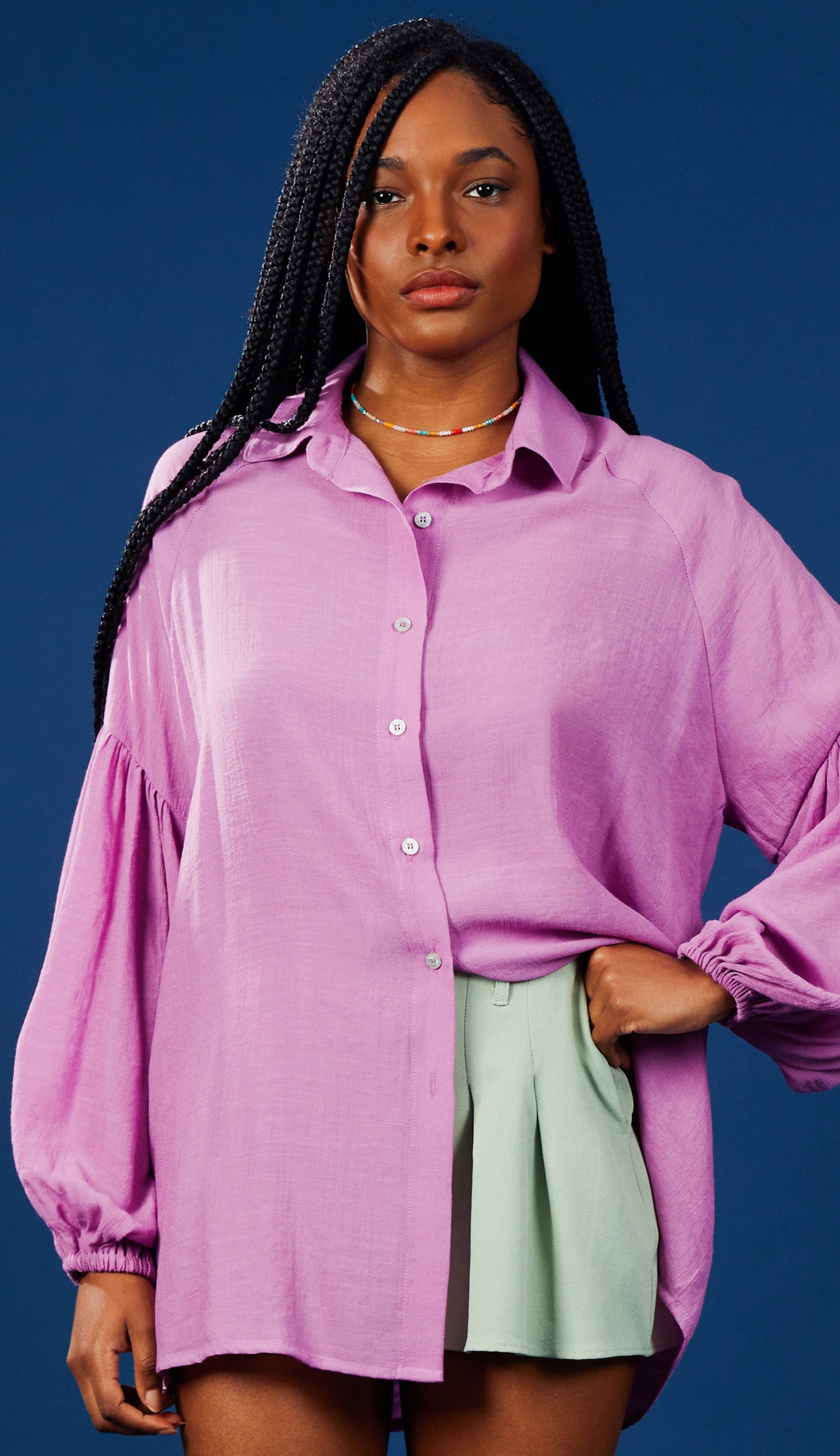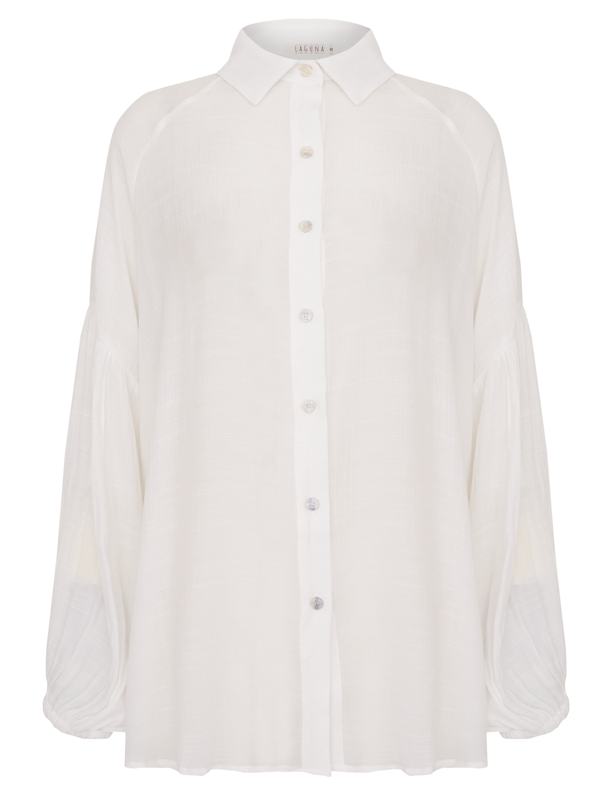 Camisa confeccionada em poliviscose texturizado com aspecto de linho. Possui gola tradicional, modelagem soltinha, fechamento frontal por botões madrepérola e mangas longas bufantes raglan com recorte, franzidinhos e elástico franzido nos punhos.