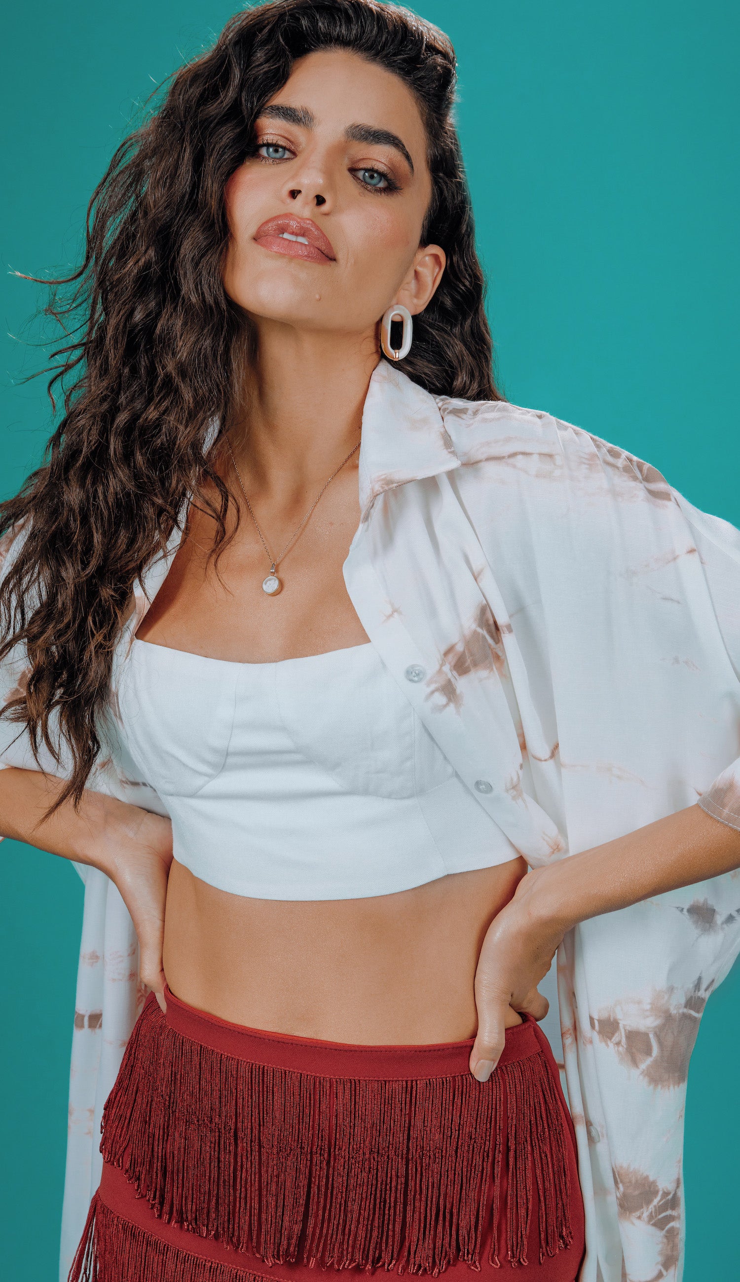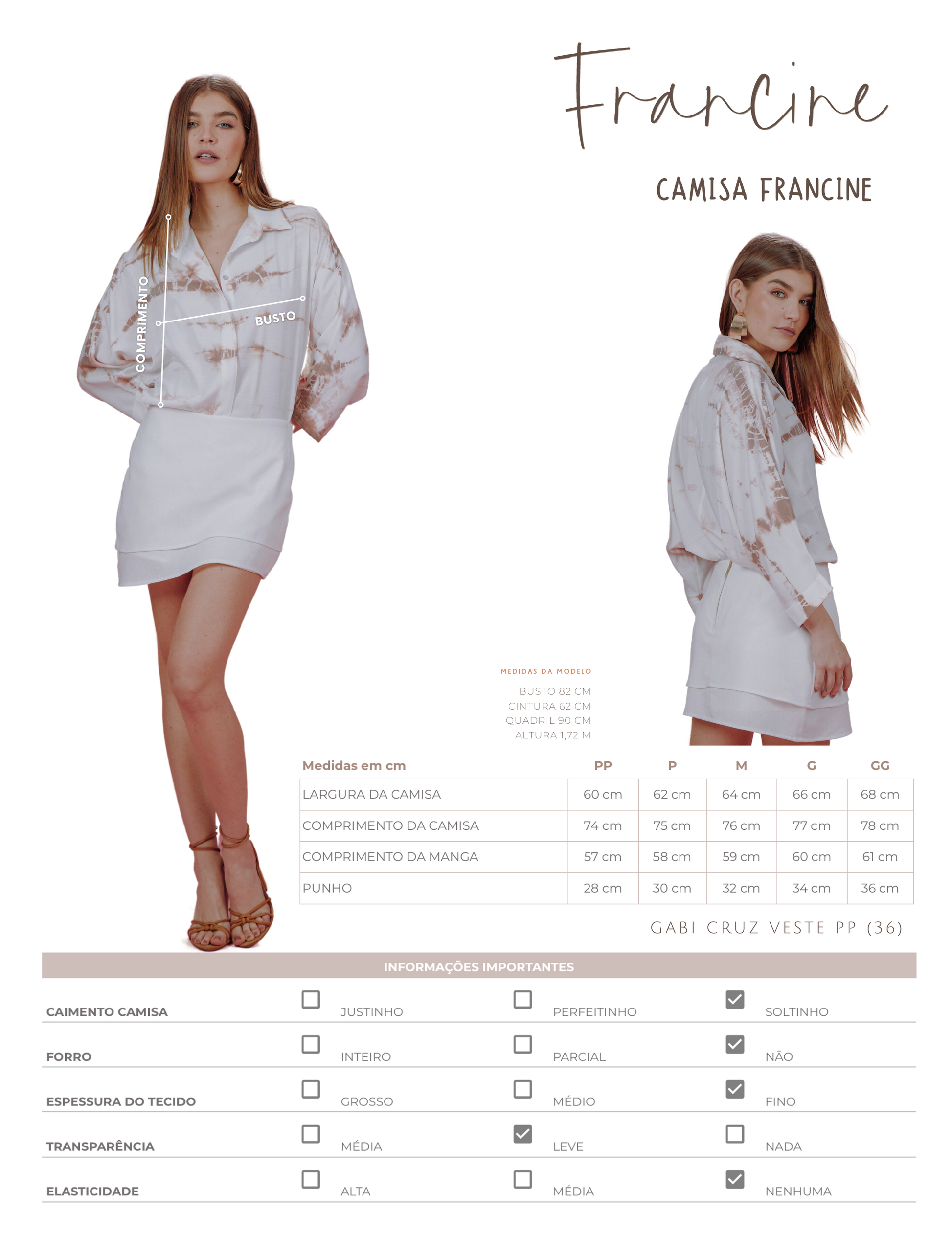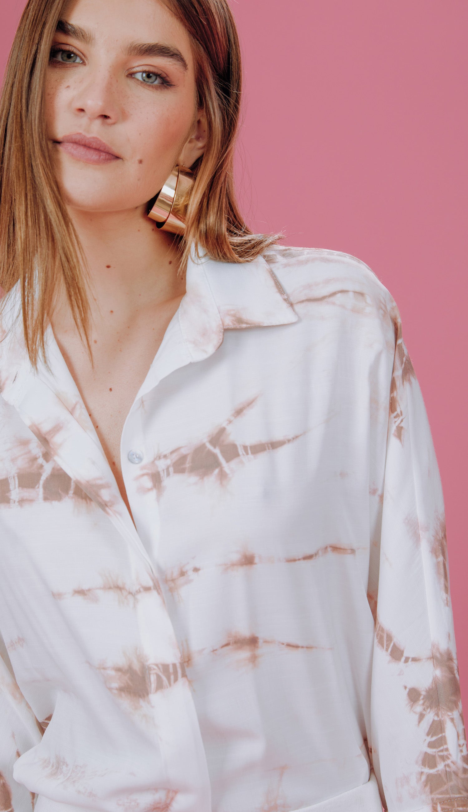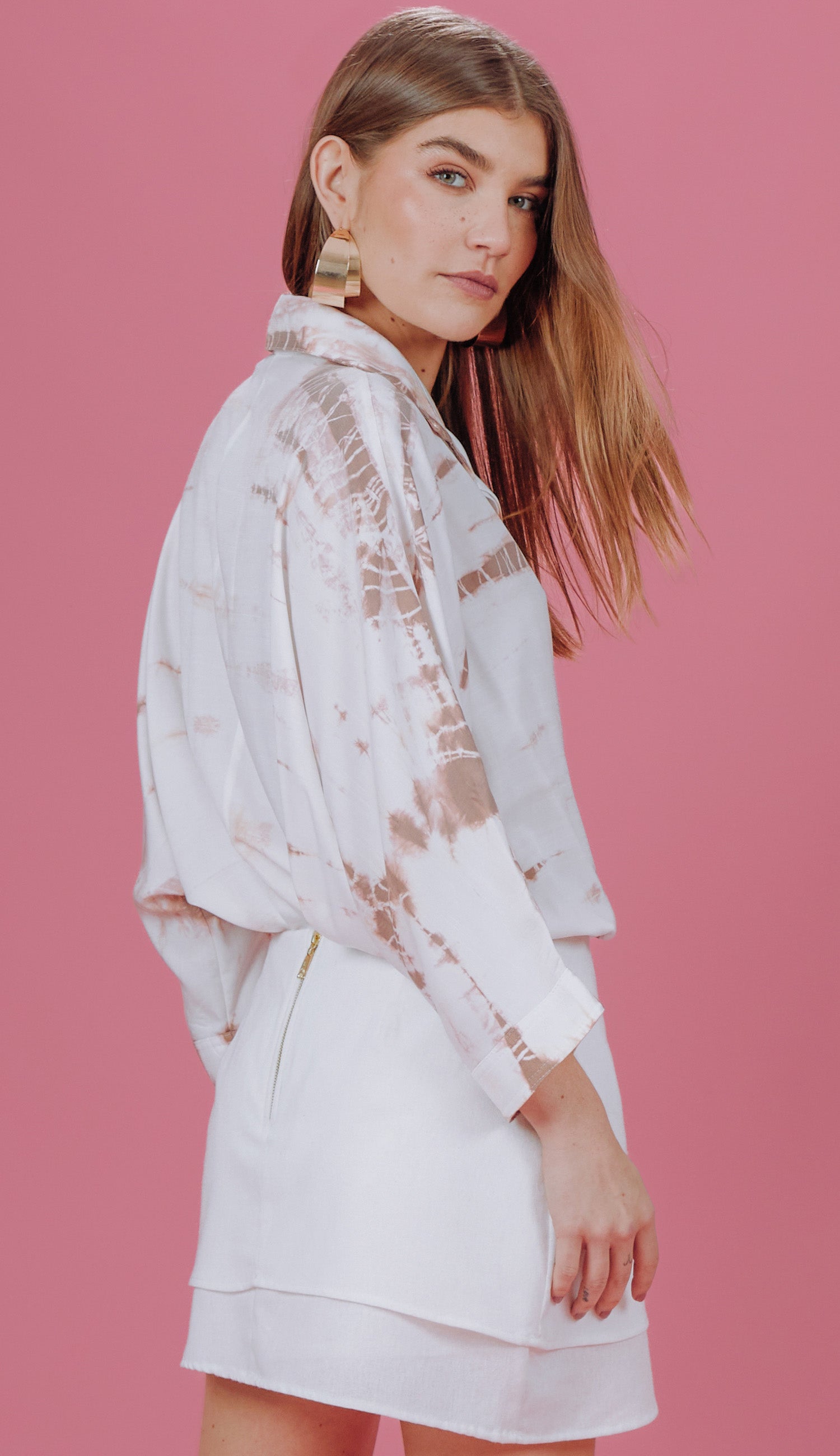 Camisa ampla confeccionada em poliviscose com aspecto de linho e estampa tie dye. Possui modelagem alongada, gola, fechamento frontal por botões madrepérola e manga morcego 3/4.