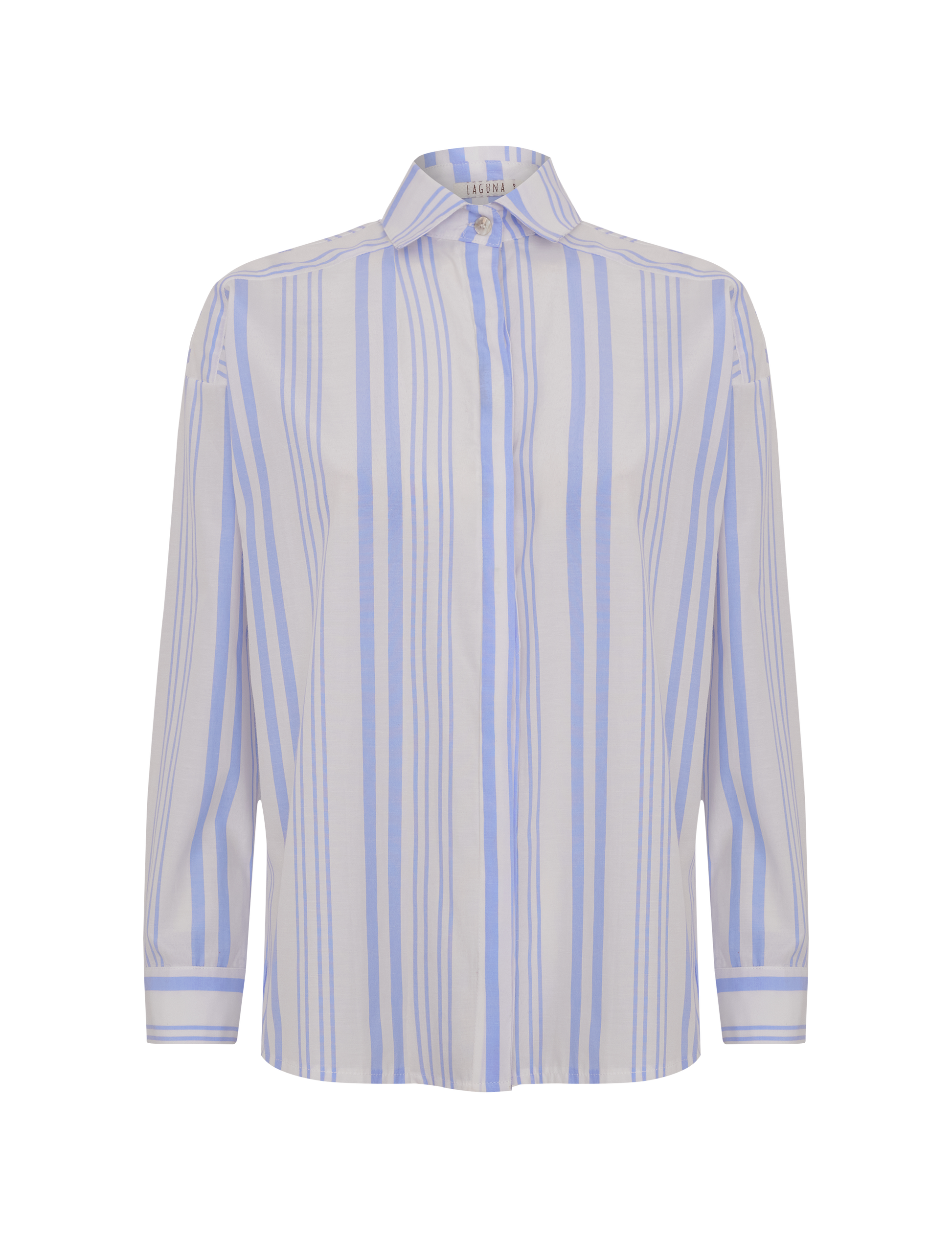 Camisa confeccionada em algodão com estampa listrada. Possui modelagem soltinha, cava deslocada, mangas longas compridas com fechamento no punho por botão madrepérola e vista embutida que deixa o fechamento frontal não aparente e é feito também por botões madrepérola.