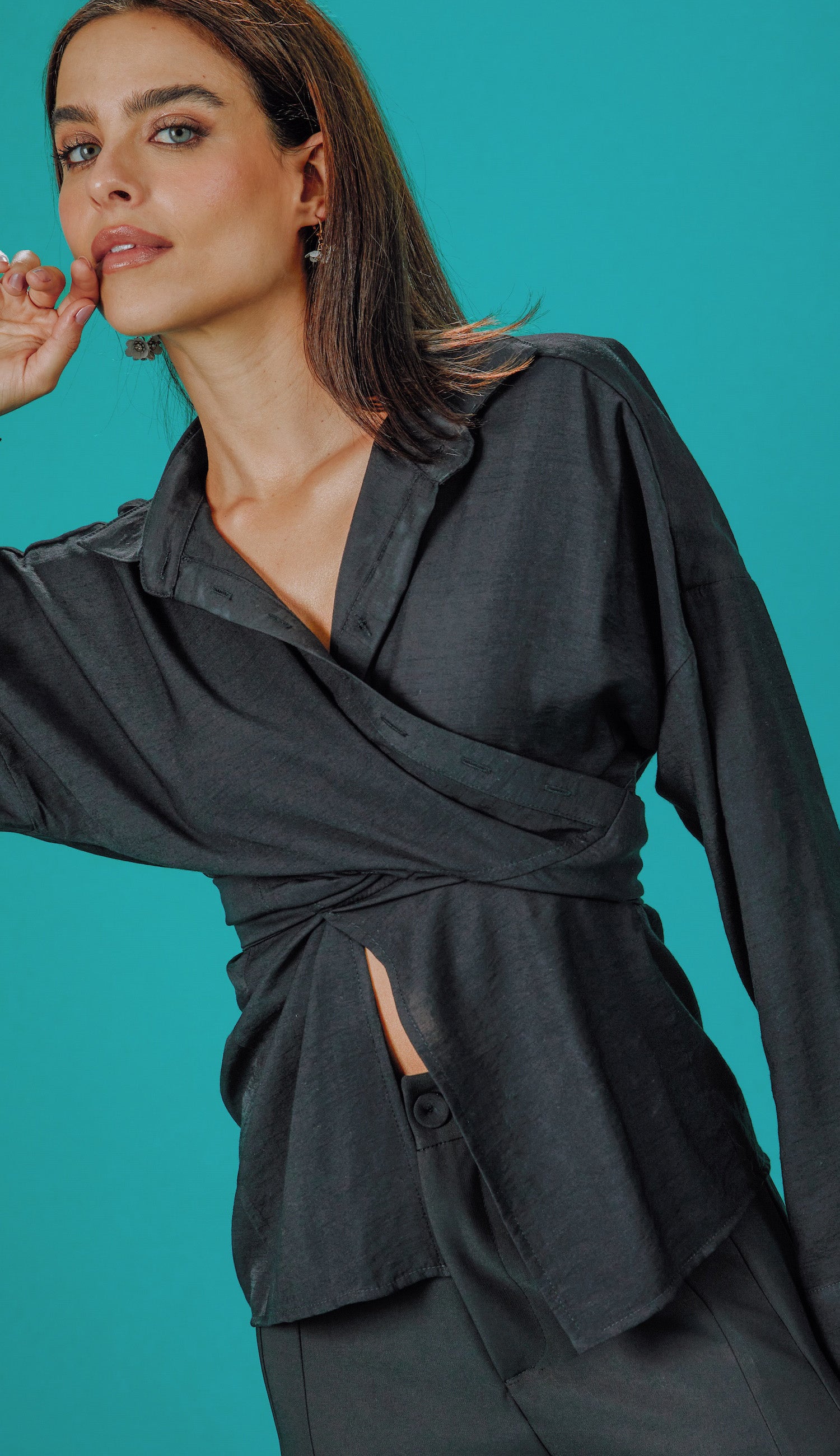 Camisa confeccionada em crepe de poliviscose texturizado com efeito amassadinho. Possui fechamento frontal por botões madrepérola, modelagem soltinha, recorte frontal com vazados, tiras soltas para amarração, cavas deslocadas e mangas longas com fechamento do punho também por botões madrepérola.