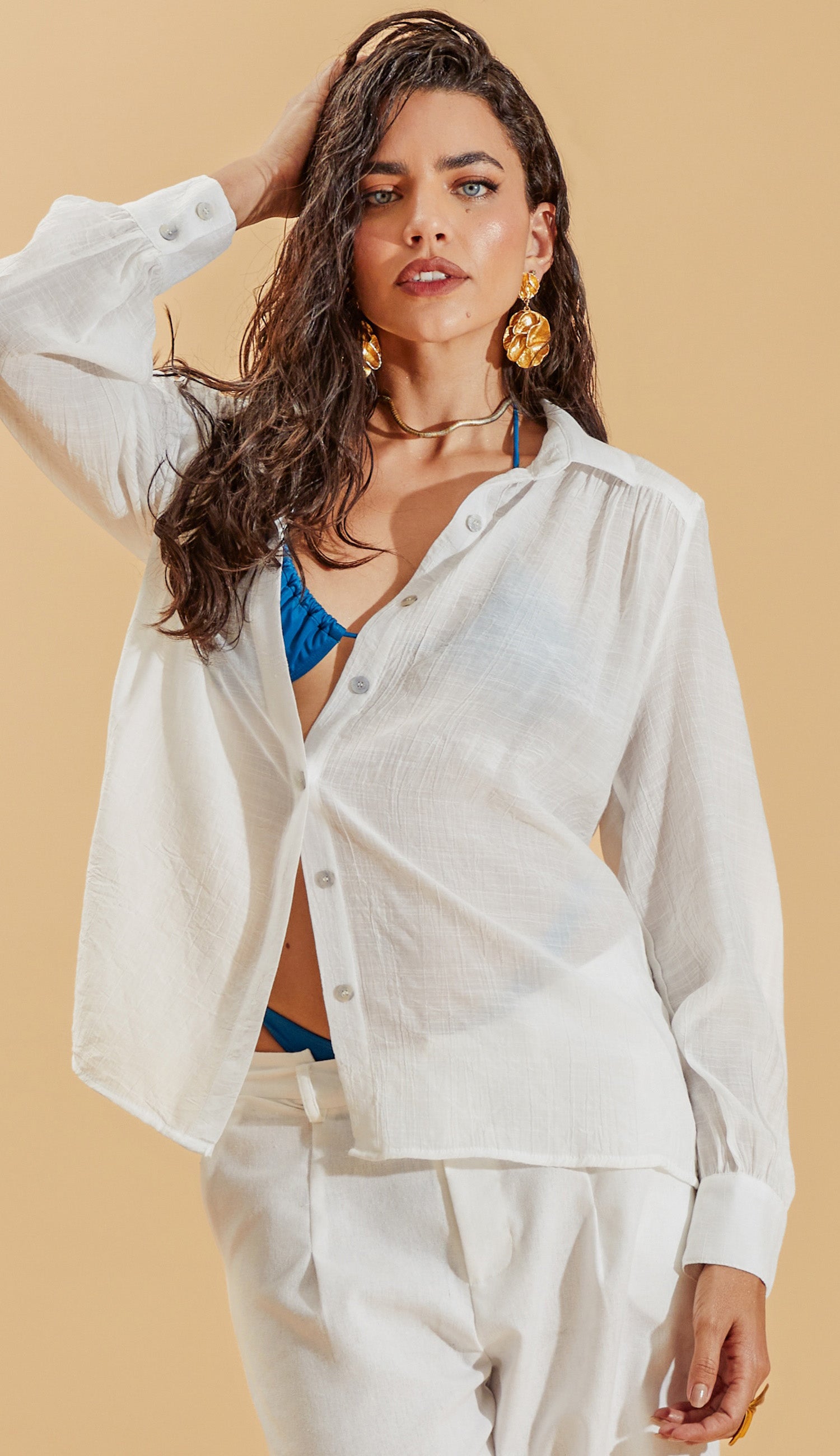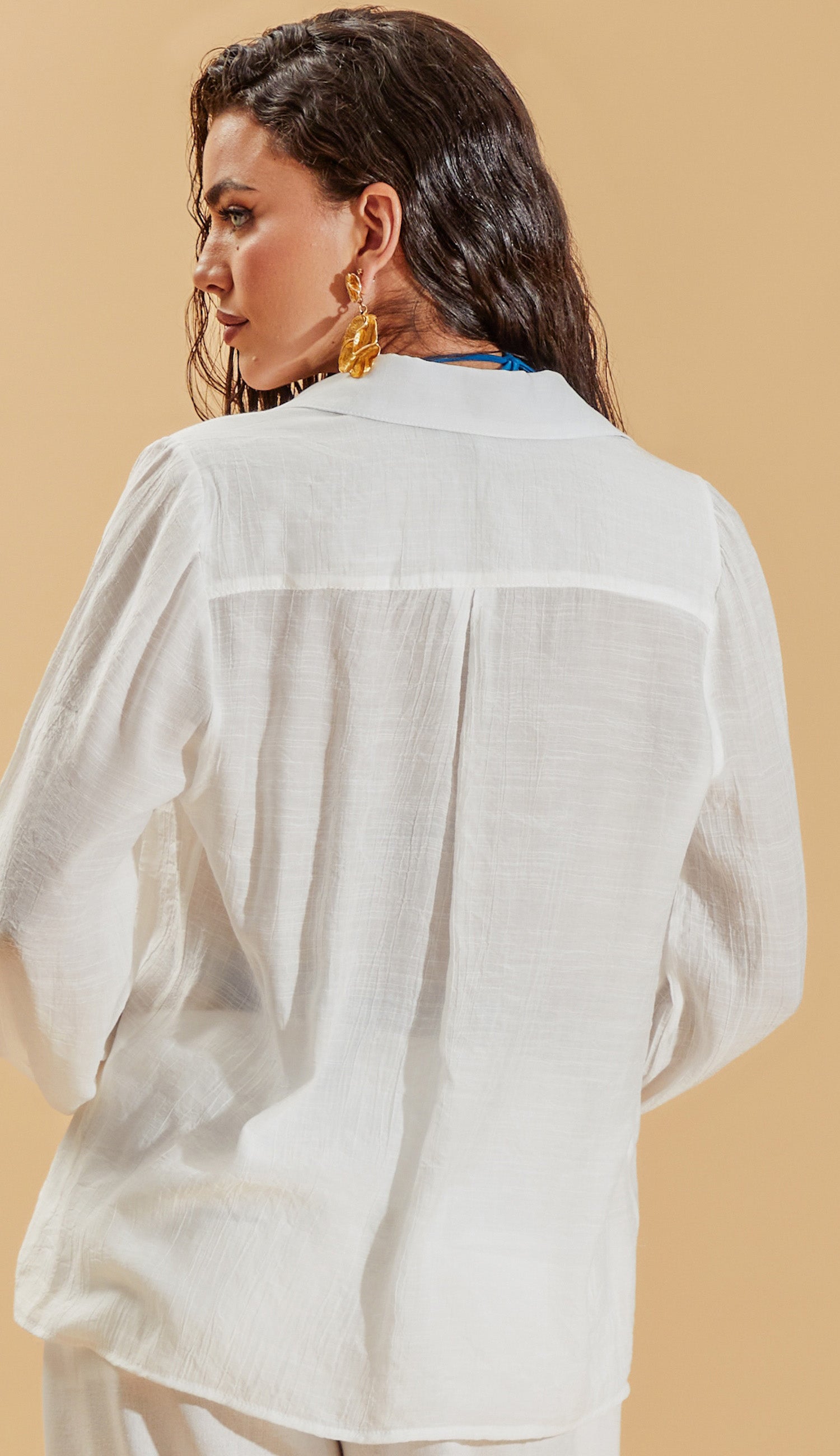 Camisa confeccionada em poliviscose texturizada com aspecto de linho e efeito amassadinho. Possui modelagem soltinha, mangas longas, gola tradicional, franzidinho nos ombros e fechamento frontal e dos punhos com botões madrepérola.