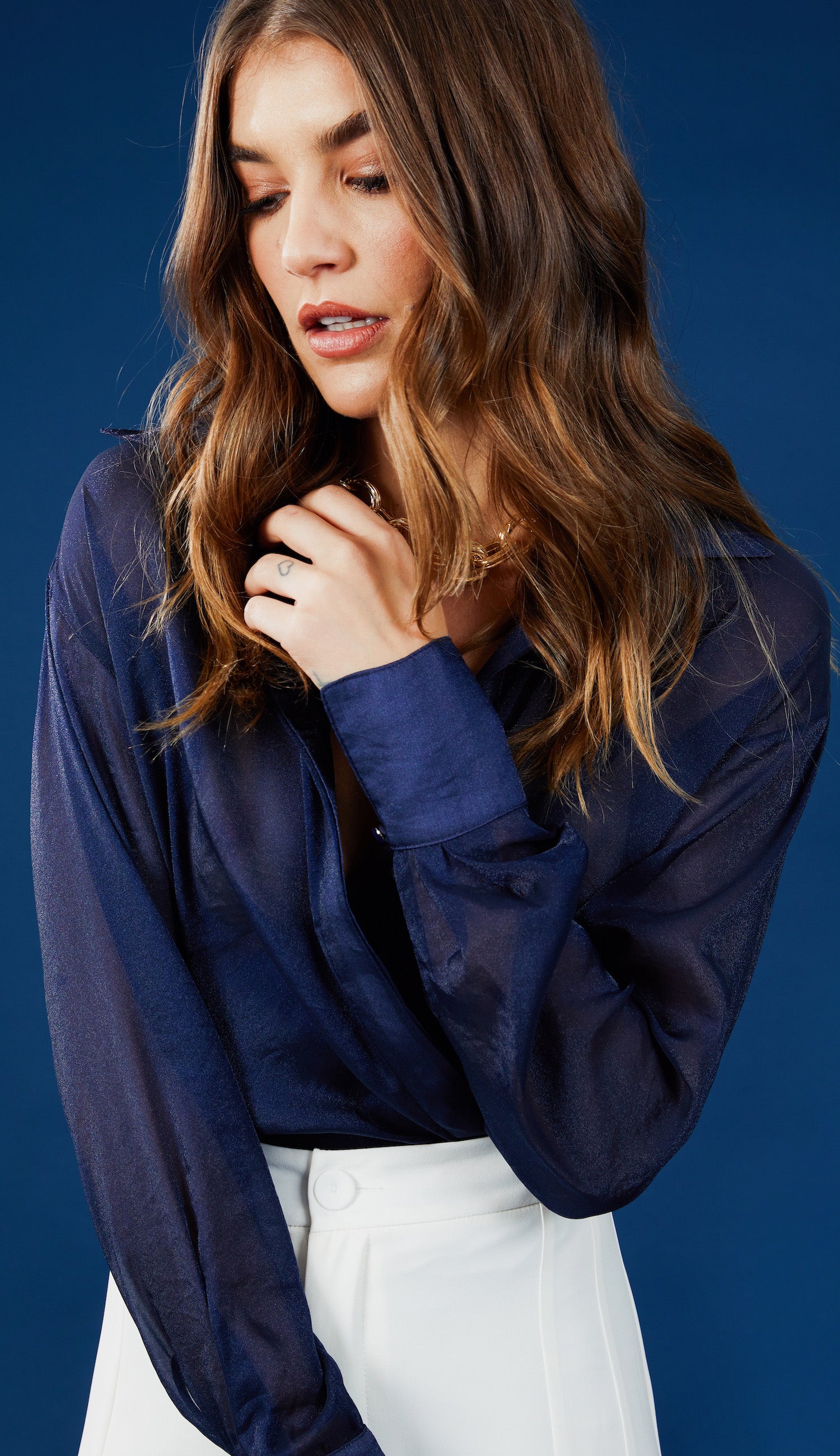 Camisa confeccionada em organza bem fluída levemente brilhosa, com transparência e efeito amassadinho. Possui modelagem ampla e alongada, gola tradicional, fechamento frontal por botões madreperola e mangas longas com fechamento nos punhos por botão esmaltado.