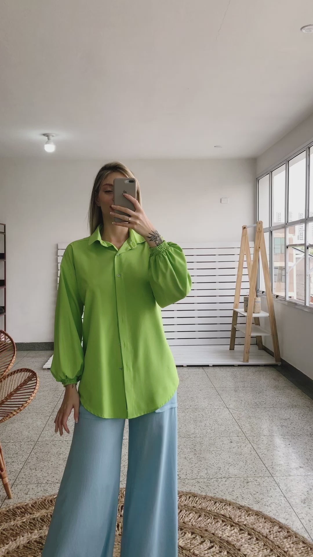 Camisa confeccionada em crepe de alfaiataria. Tecido "mágico" que revela a delicada estampa de folhagens ao entrar em contato com água. Possui modelagem mais soltinha, fechamento com botões madrepérola, mangas longas com lastex franzido nos punhos e um detalhe torcido nas costas com abertura. É perfeita para combinar com um shortinhos e rasteira em um lindo dia de sol e também fica linda como saída de praia.